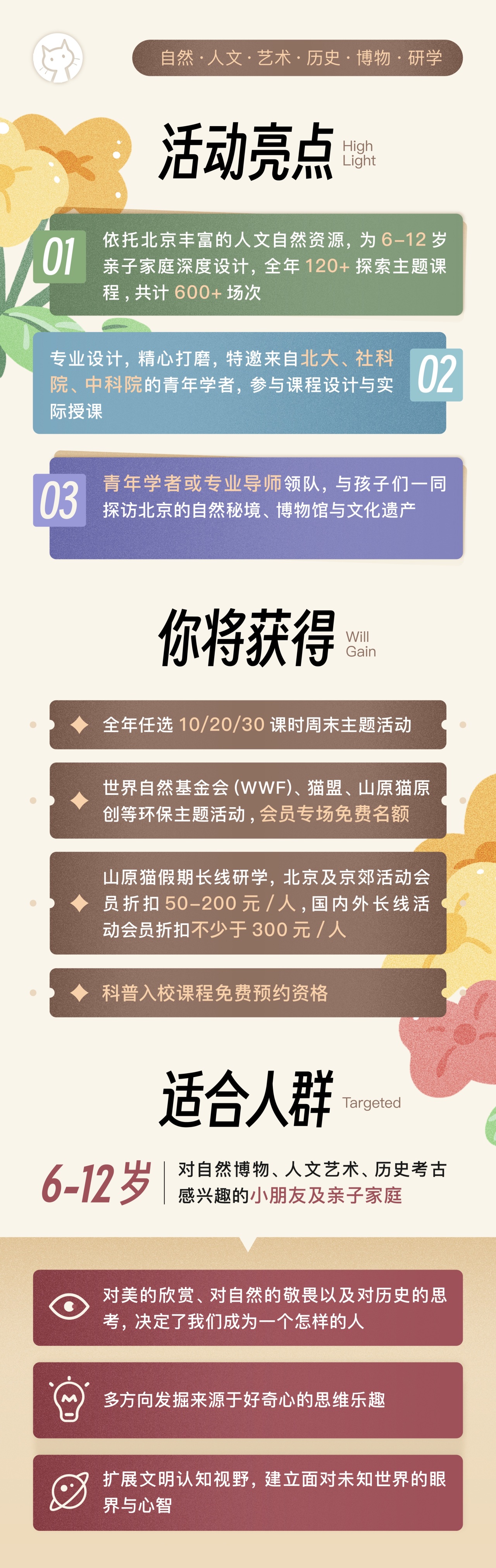 我们深知,知识的宇宙浩瀚无垠。山原猫研学年卡以通识教育为核心,涵盖历史、自然、艺术、科学四大领域,帮助孩子建立系统的知识框架,培养独立思考与理性判断的能力。