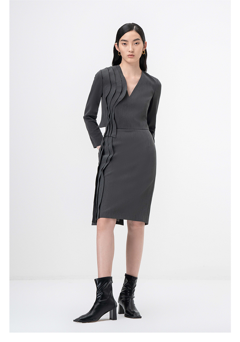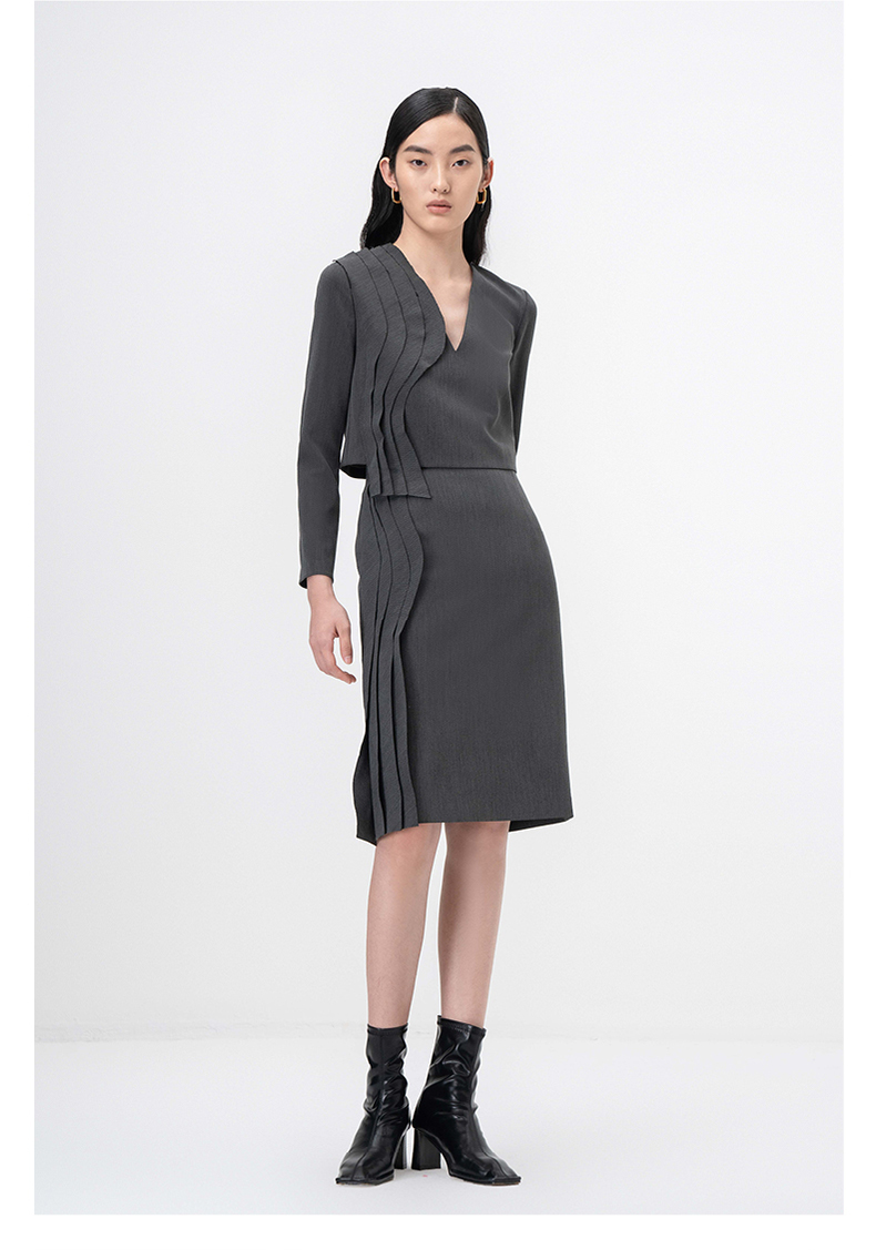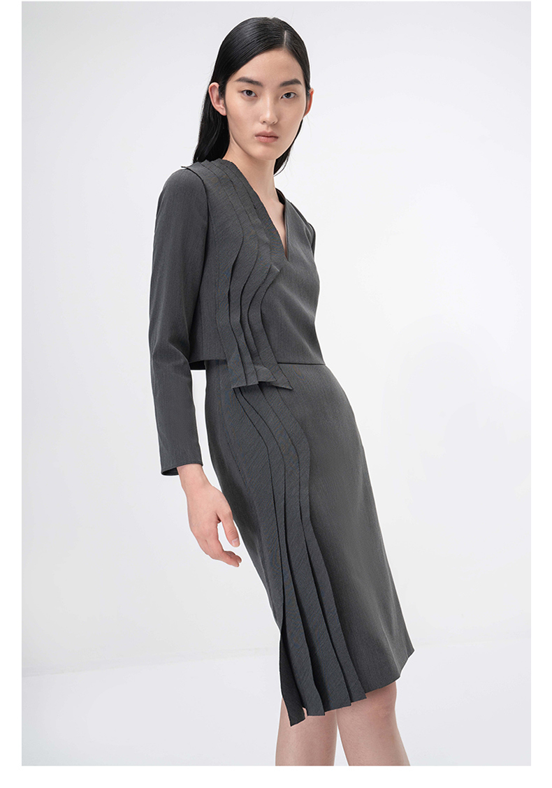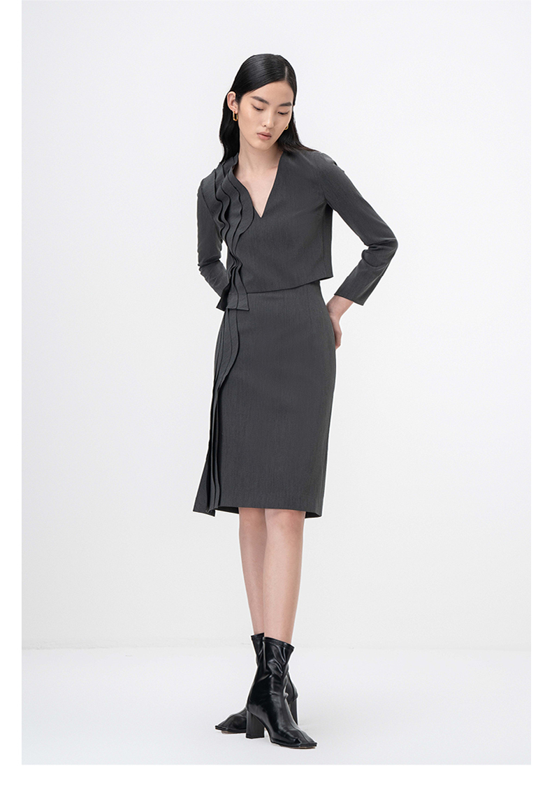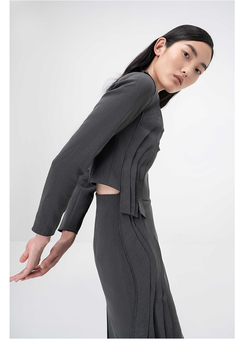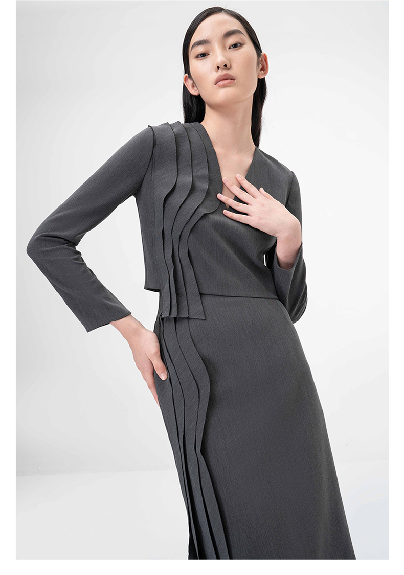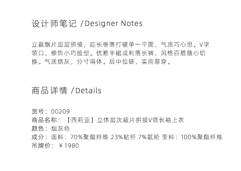 【西莉亚】立体层次裁片拼接烟灰色V领长袖上衣/00209