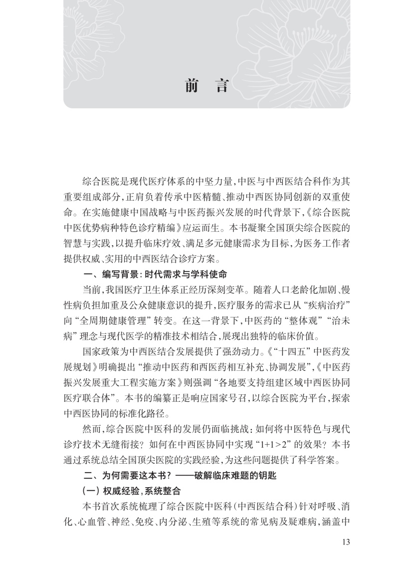 中医优势病种是指西医治疗不满意或攻关有困难而中医治疗有鲜明特色和突出优势的病种,本书依托中华中医药学会综合医院中医药工作委员会,筛选全国综合医院中医优势病种60余种,以现代医学分科为纲,分章节介绍呼吸系统疾病、消化系统疾病、心血管及神经系统疾病、泌尿系统疾病、免疫及内分泌系统疾病等系统疾病的中医治疗优势位点、特色方药及诊疗手段,助力推动中医药优势病种的规范化管理,为中医优势病种诊疗方案和临床路径的建立奠定良好的基础,同时推动综合医院中医科的发展。