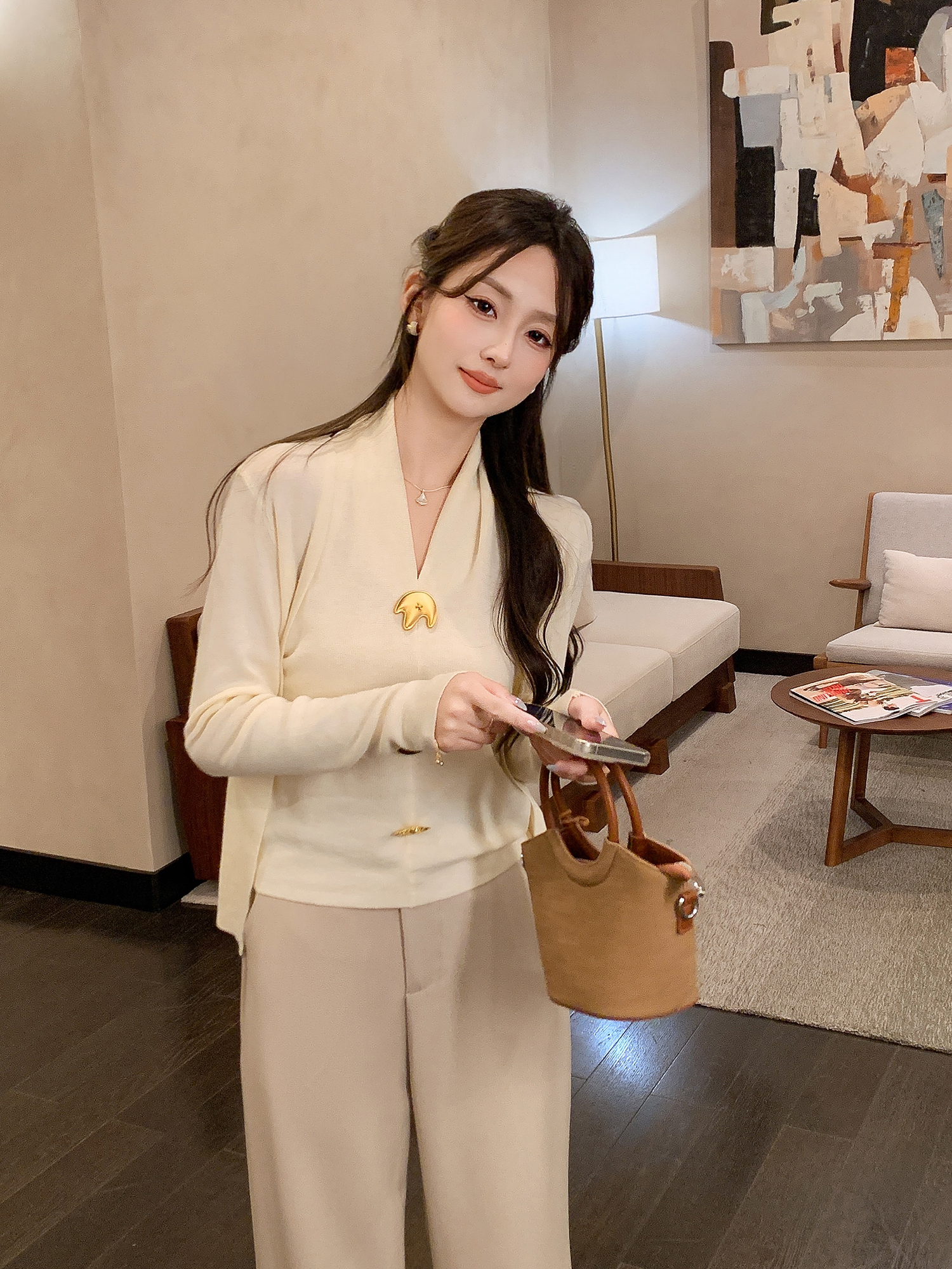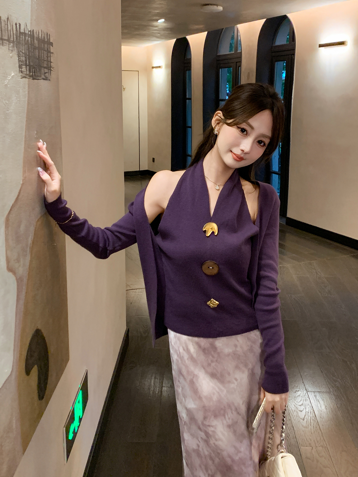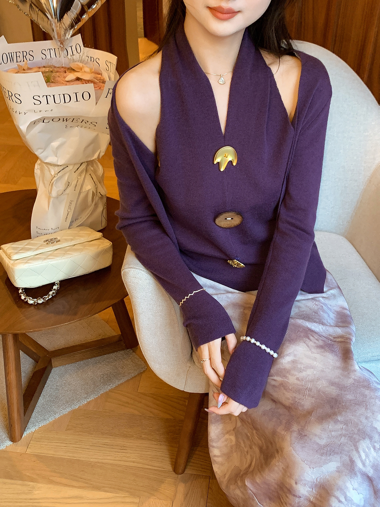 张心子【舒适软fufu】法式露肩挂脖领针织衫女秋季新款假两件设计 U2508007