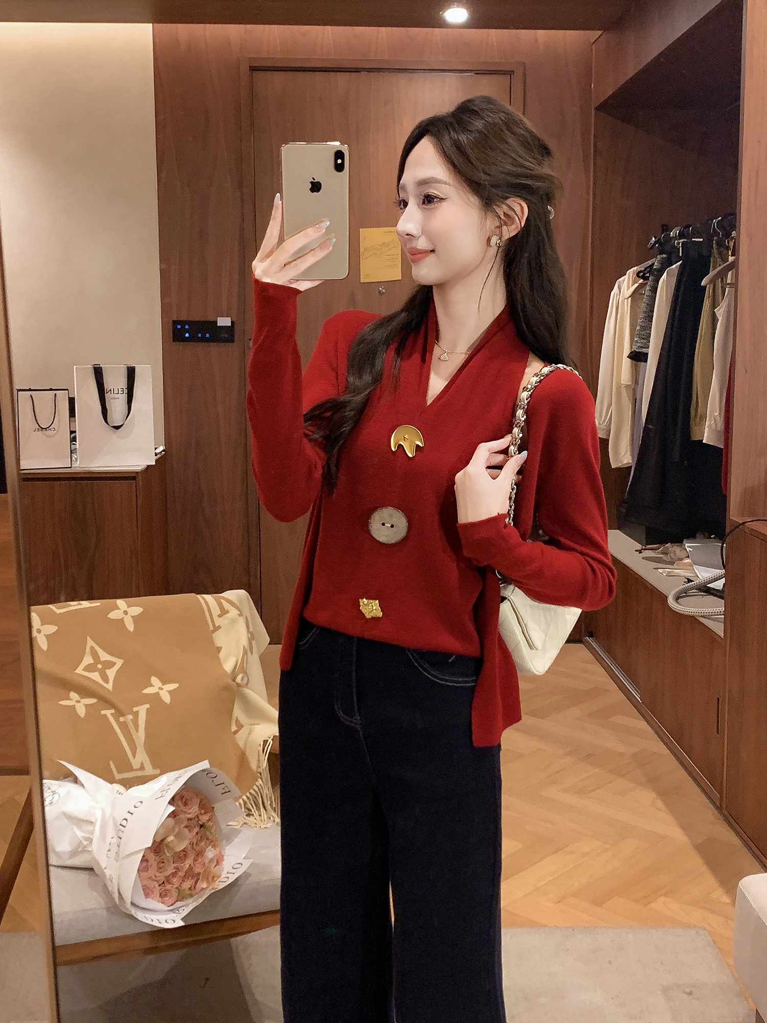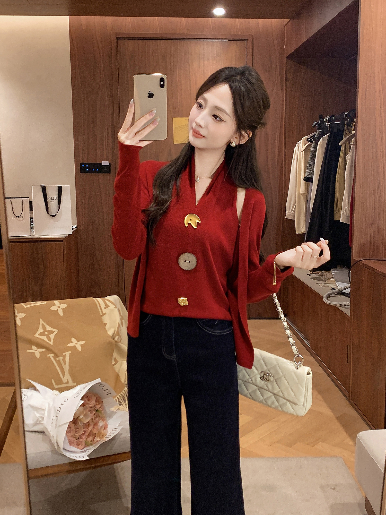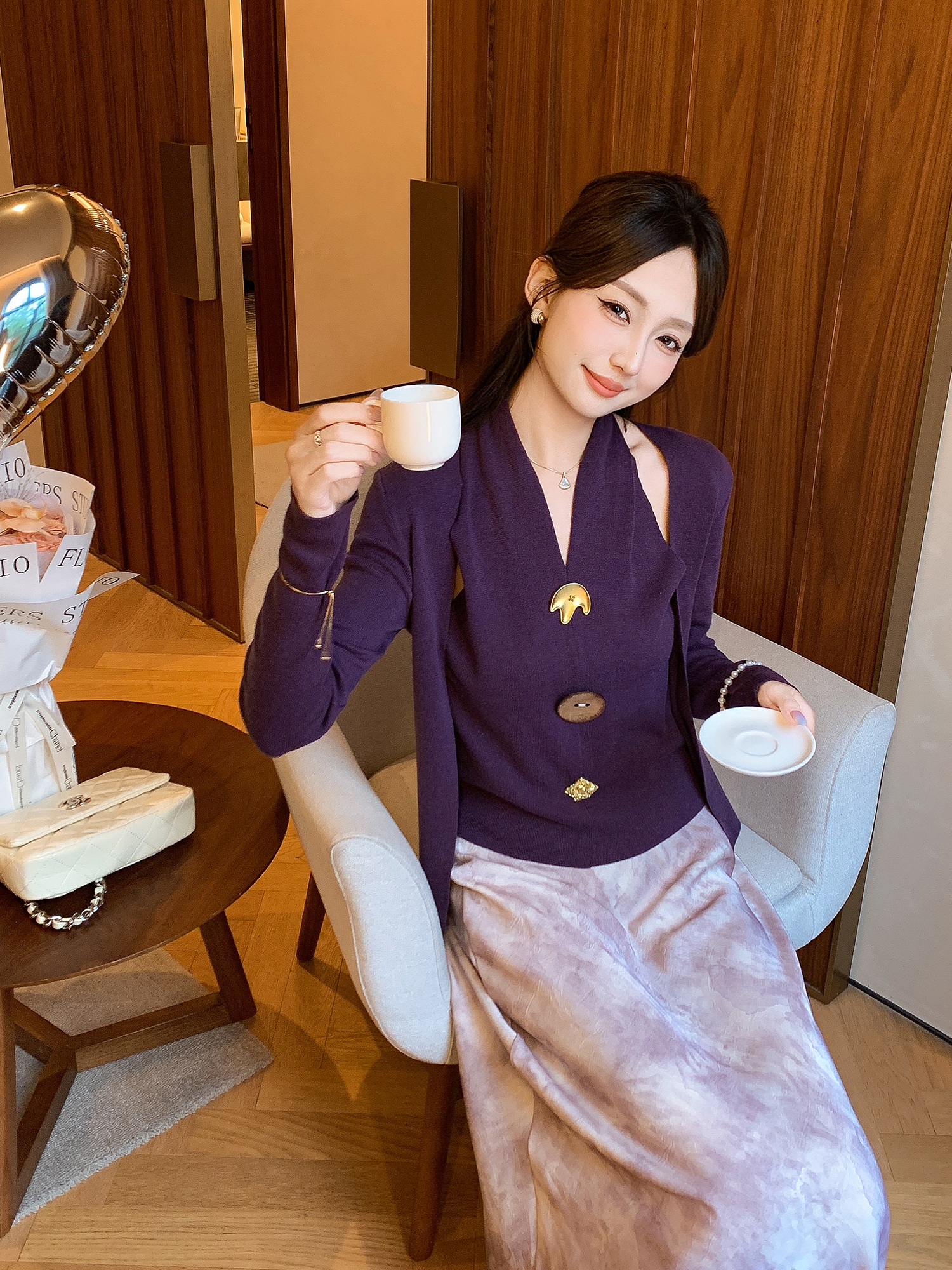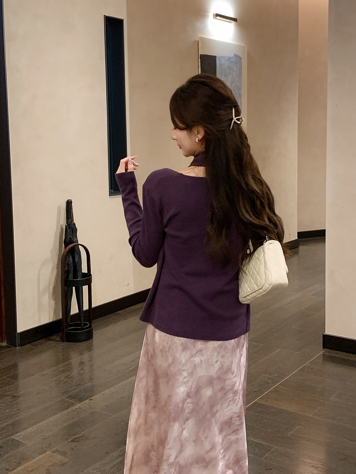 张心子【舒适软fufu】法式露肩挂脖领针织衫女秋季新款假两件设计 U2508007