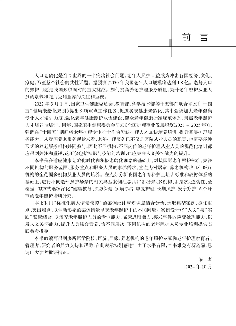 本书由绪论、老年居家照护情景模拟典型案例、老年医养结合照护情景模拟典型案例、老年护理机构照护情景模拟典型案例、老年医疗照护情景模拟典型案例、老年安宁疗护情景模拟典型案例6部分组成,以不同养老场所的典型案例情景训练为主线,以“标准化病人情景模拟”的案例设计与知识点结合分析,选取典型案例,抓住重点、突出难点,以生动形象的案例情景呈现老年照护中的不同问题,在案例设计中将“人文与实践”紧密结合,以培养老年照护人员的专业能力、临床思维能力、突发事件的应变处理能力以及人文关怀能力。
