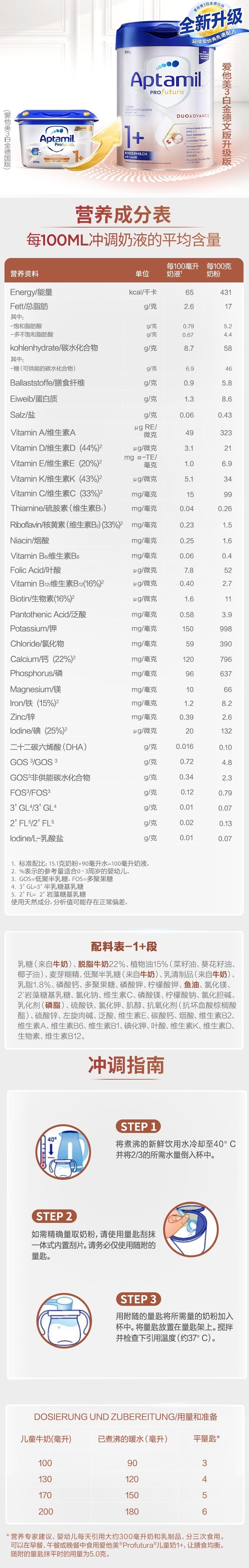6罐【保税】德国爱他美Aptamil婴幼儿白金版奶粉1+段800g新包装