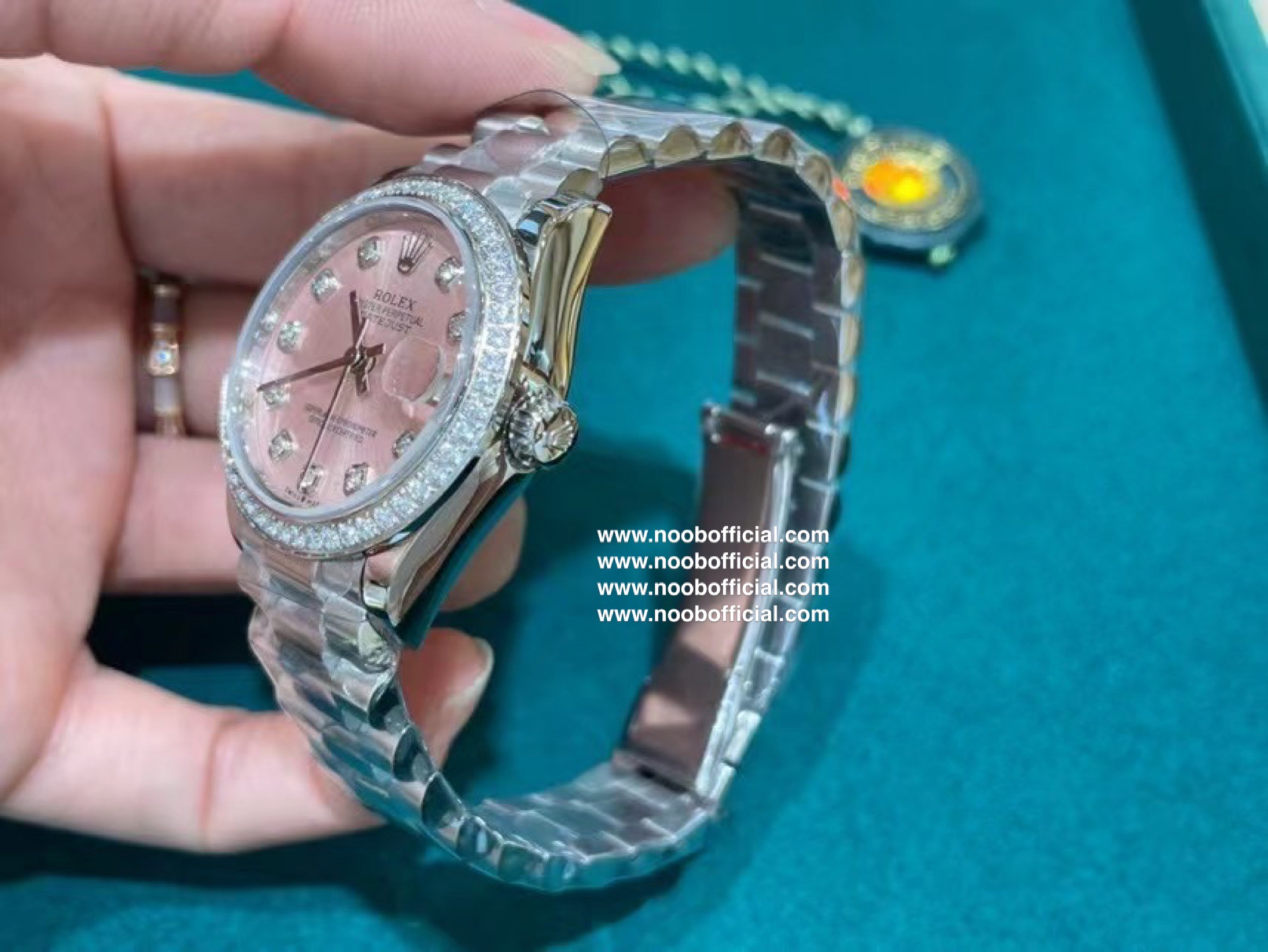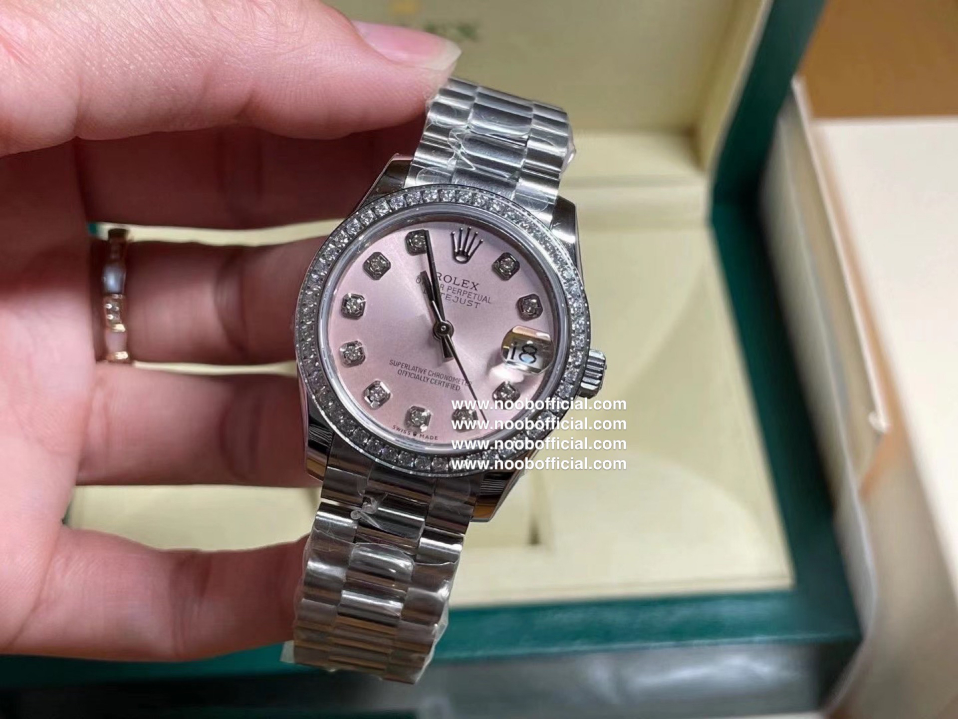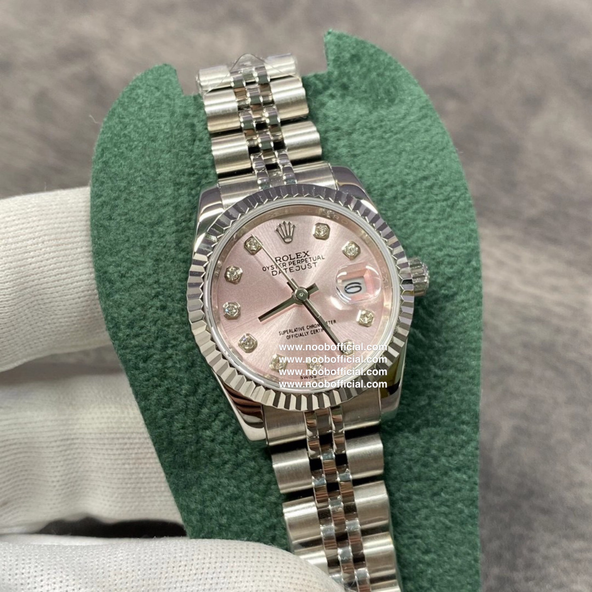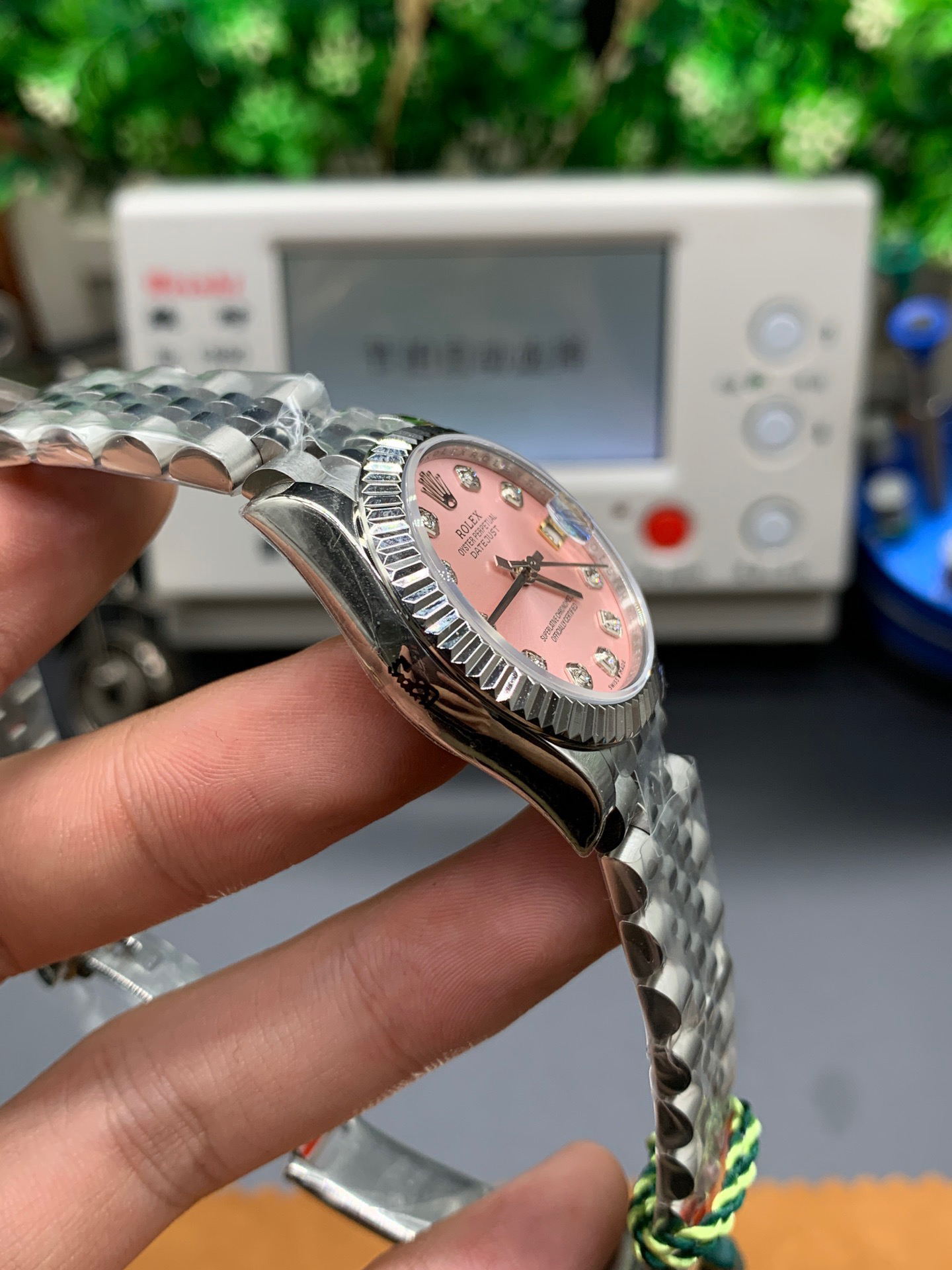 Noob【高品质】龙虾粉表盘,劳力士女款原版开模:劳力士女装日志型28和31毫米新一代五件拼装头粒,隐蔽式弹簧皇冠带扣、开启劳力士皇冠标志轻松打开表带.表壳与表带之间达到无缝连接视觉效果,完美无破绽❕