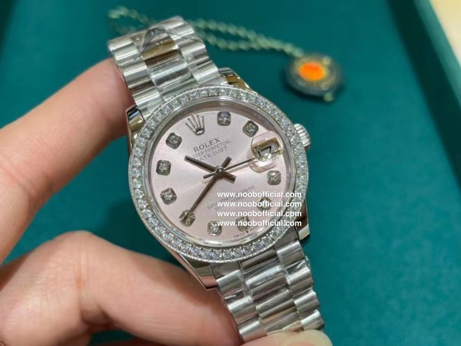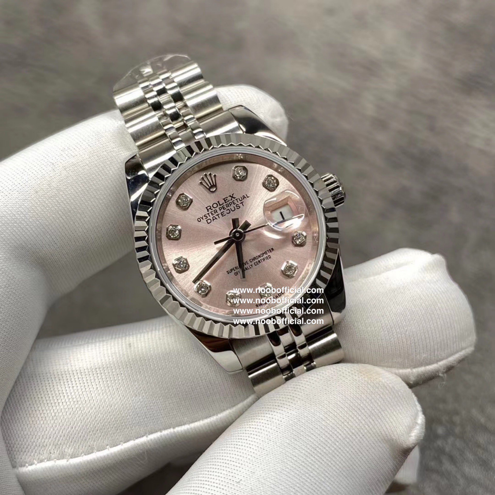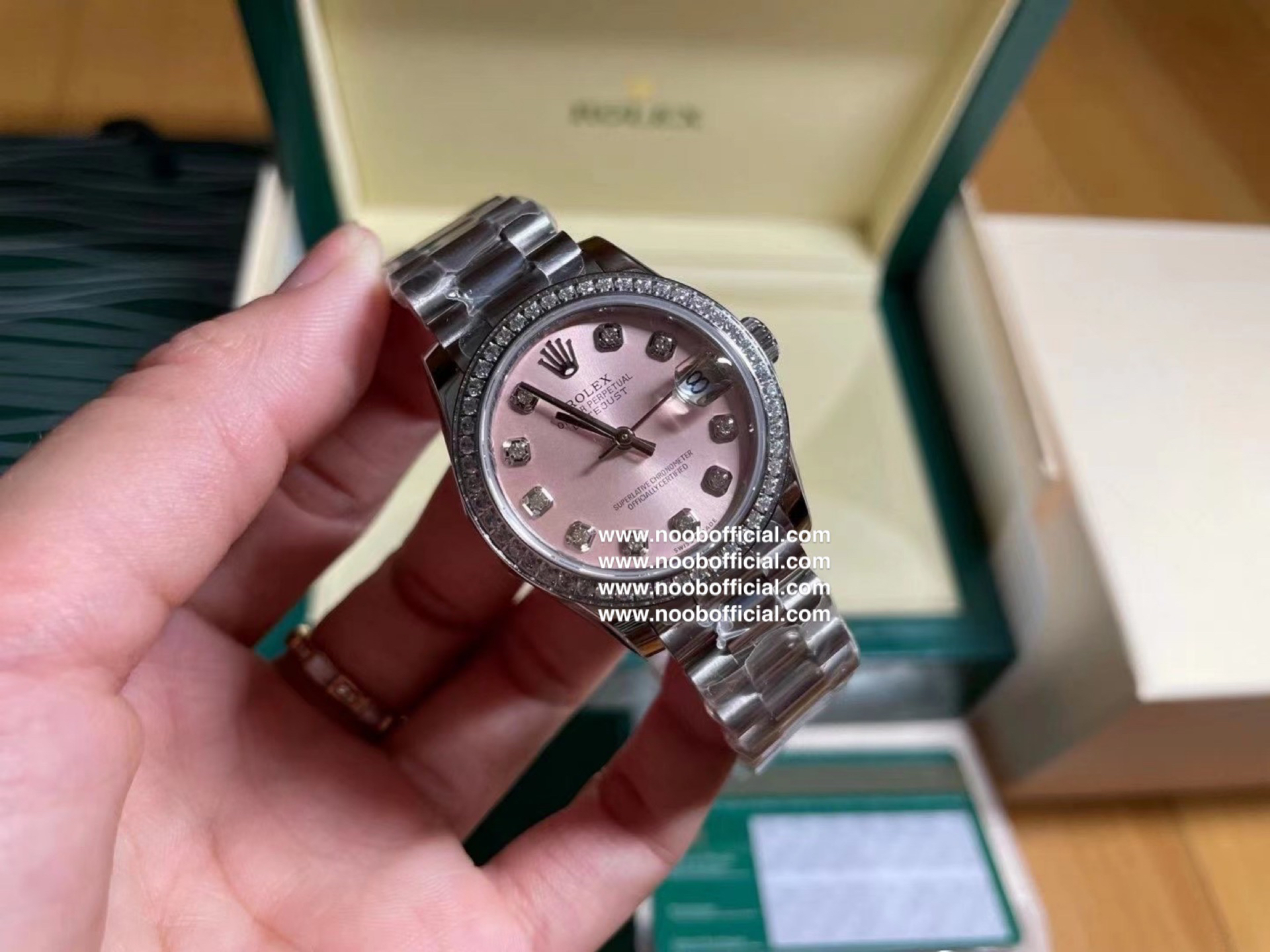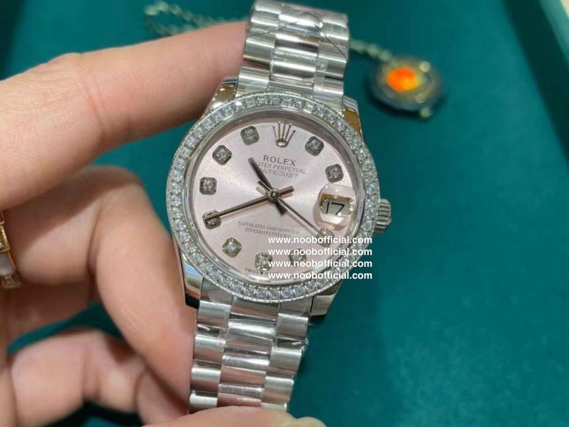Noob【高品质】龙虾粉表盘,劳力士女款原版开模:劳力士女装日志型28和31毫米新一代五件拼装头粒,隐蔽式弹簧皇冠带扣、开启劳力士皇冠标志轻松打开表带.表壳与表带之间达到无缝连接视觉效果,完美无破绽❕