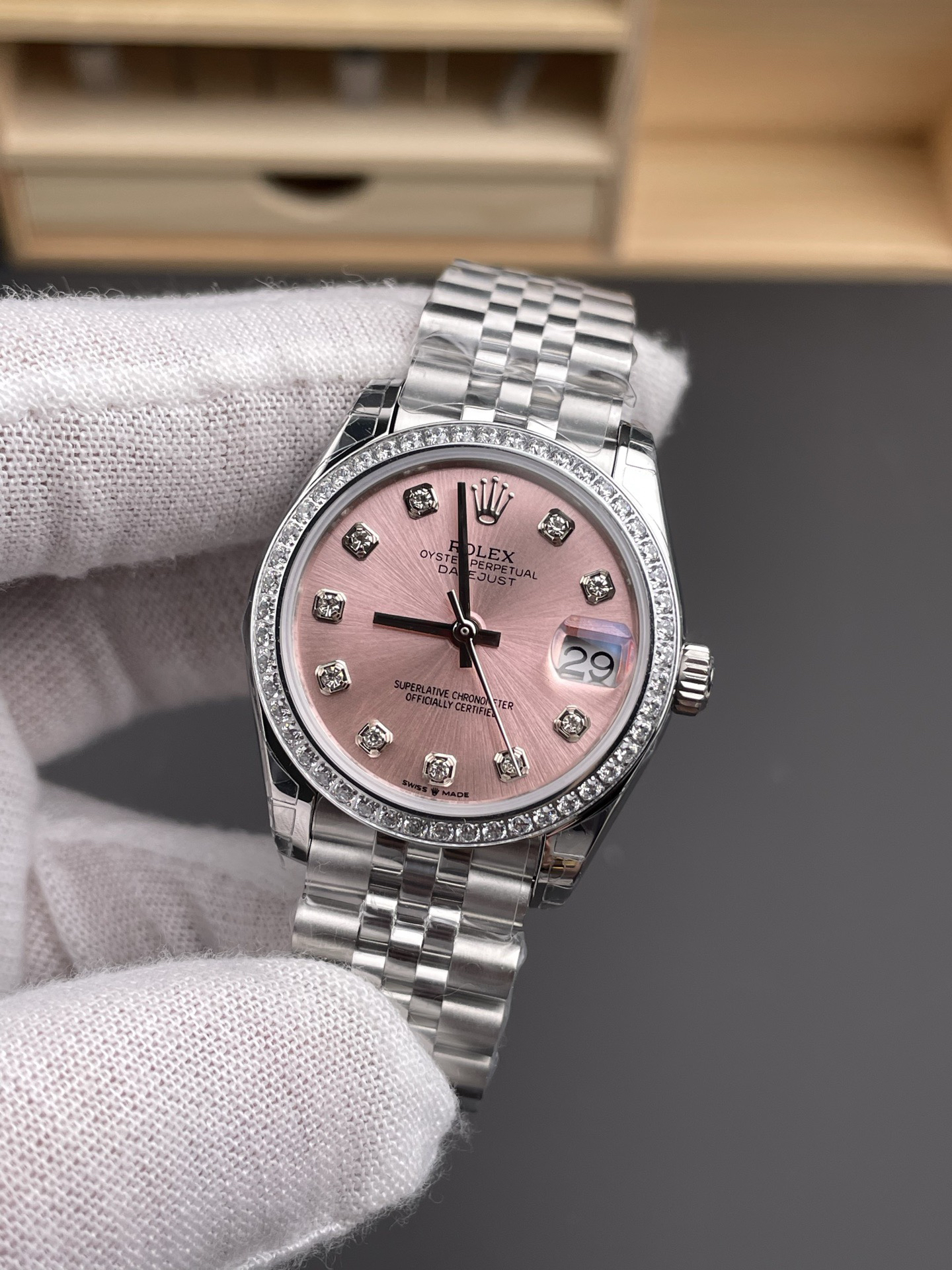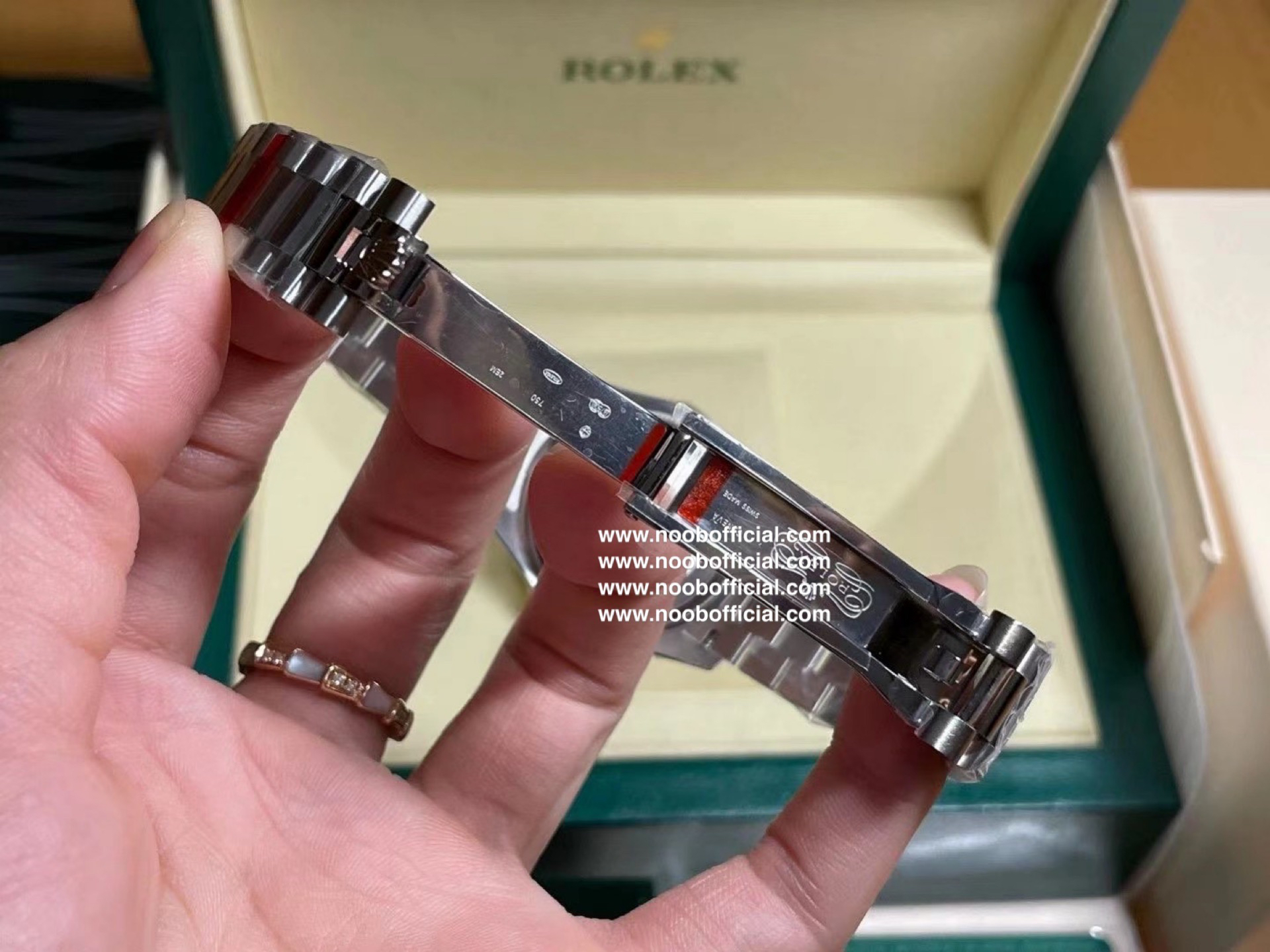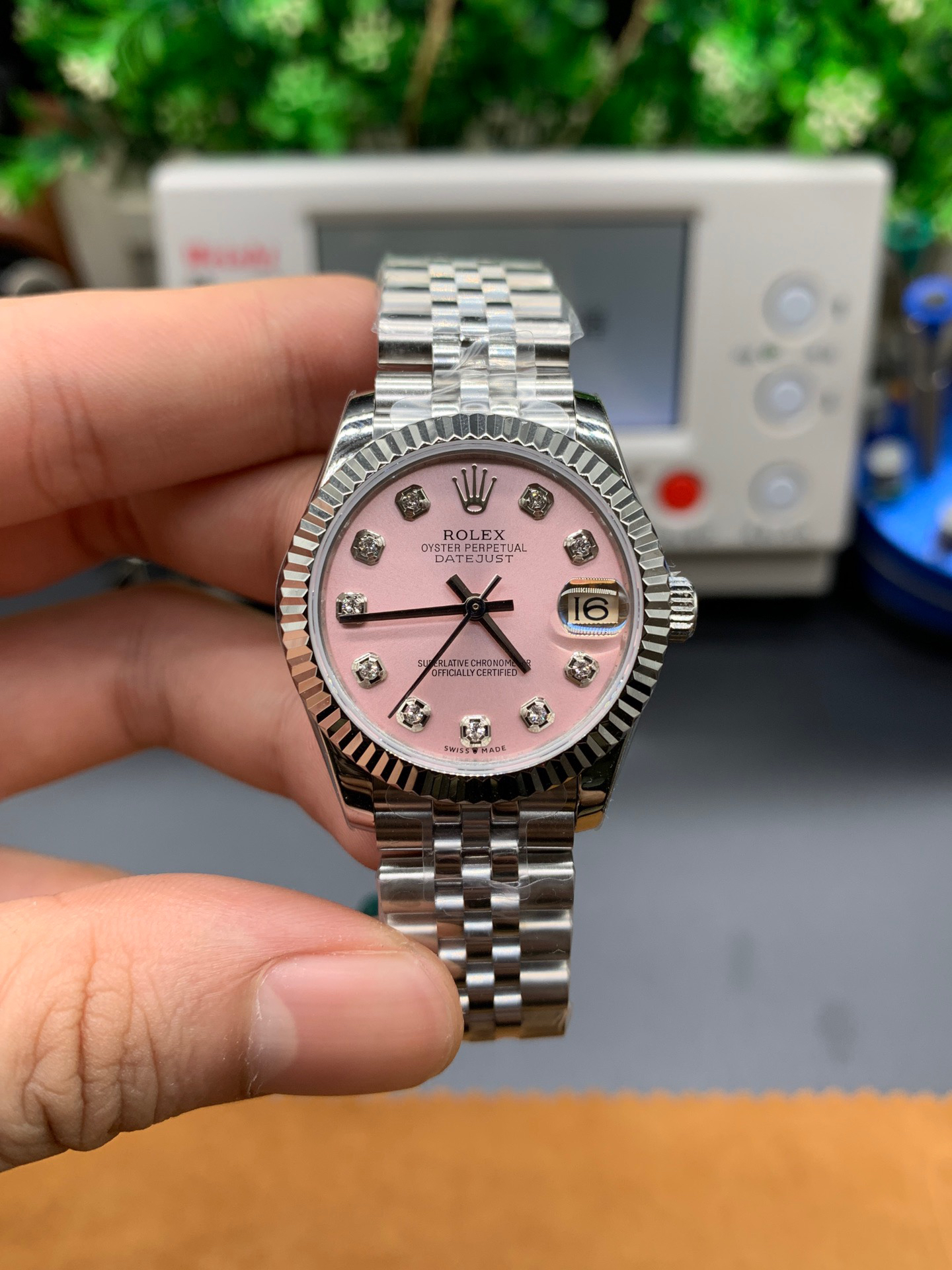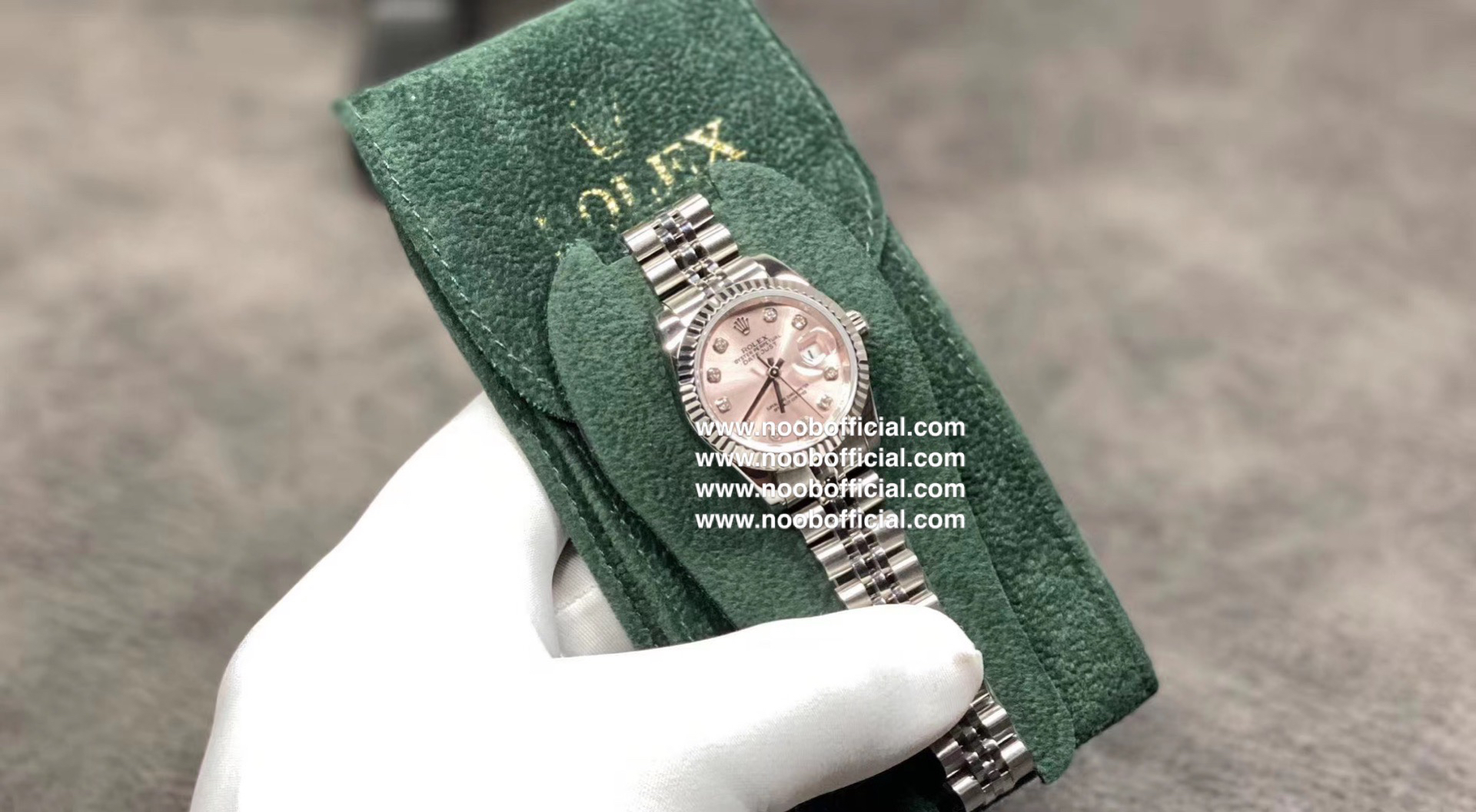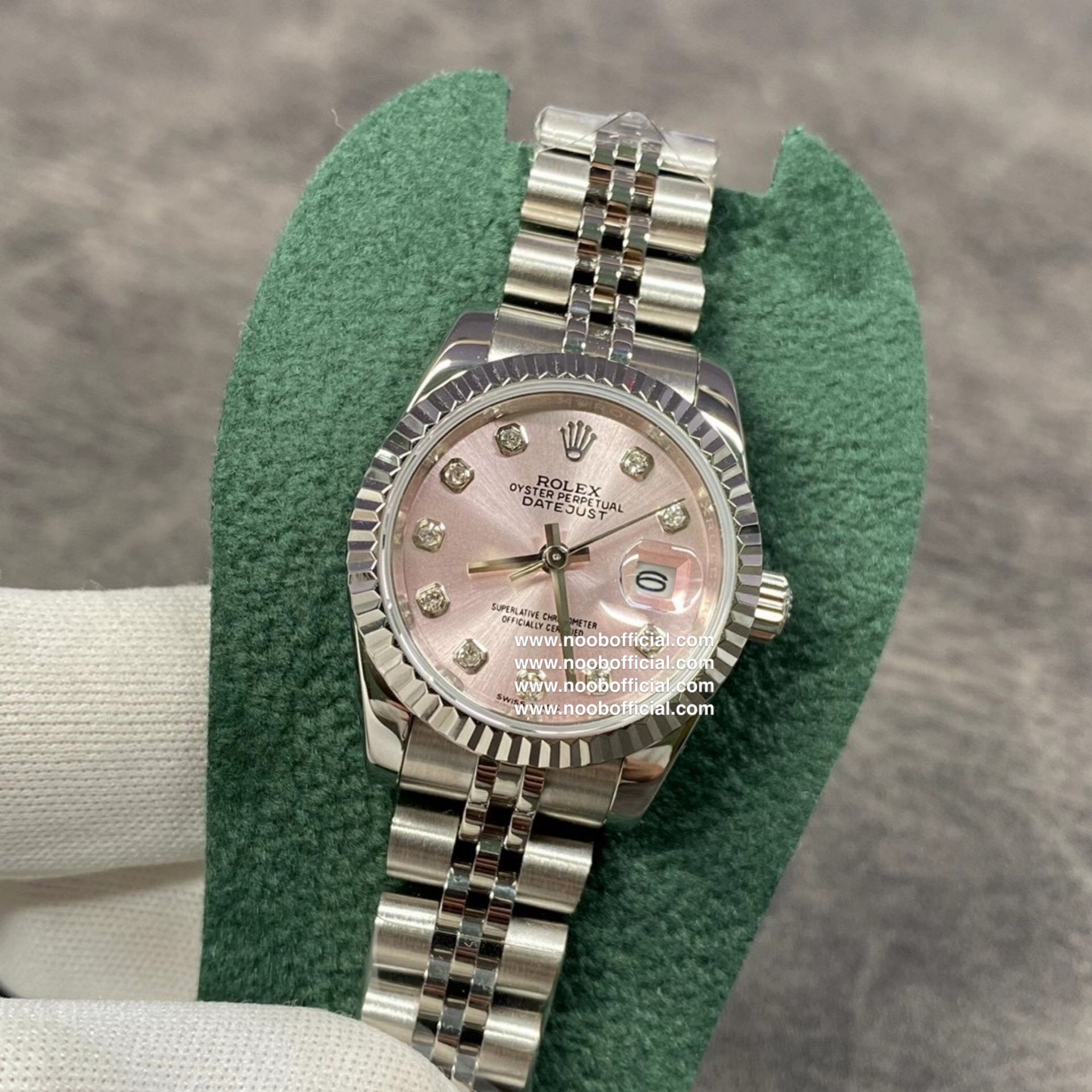 Noob【高品质】龙虾粉表盘,劳力士女款原版开模:劳力士女装日志型28和31毫米新一代五件拼装头粒,隐蔽式弹簧皇冠带扣、开启劳力士皇冠标志轻松打开表带.表壳与表带之间达到无缝连接视觉效果,完美无破绽❕