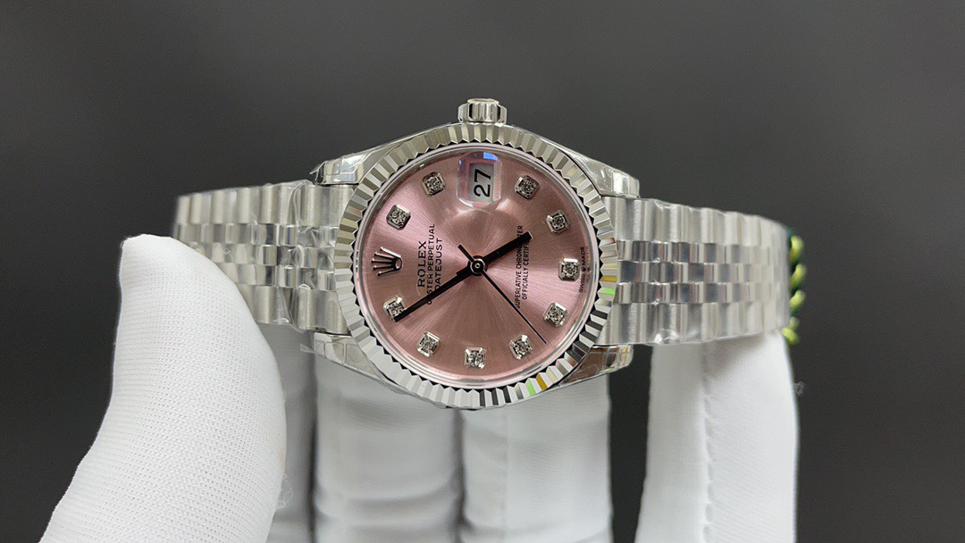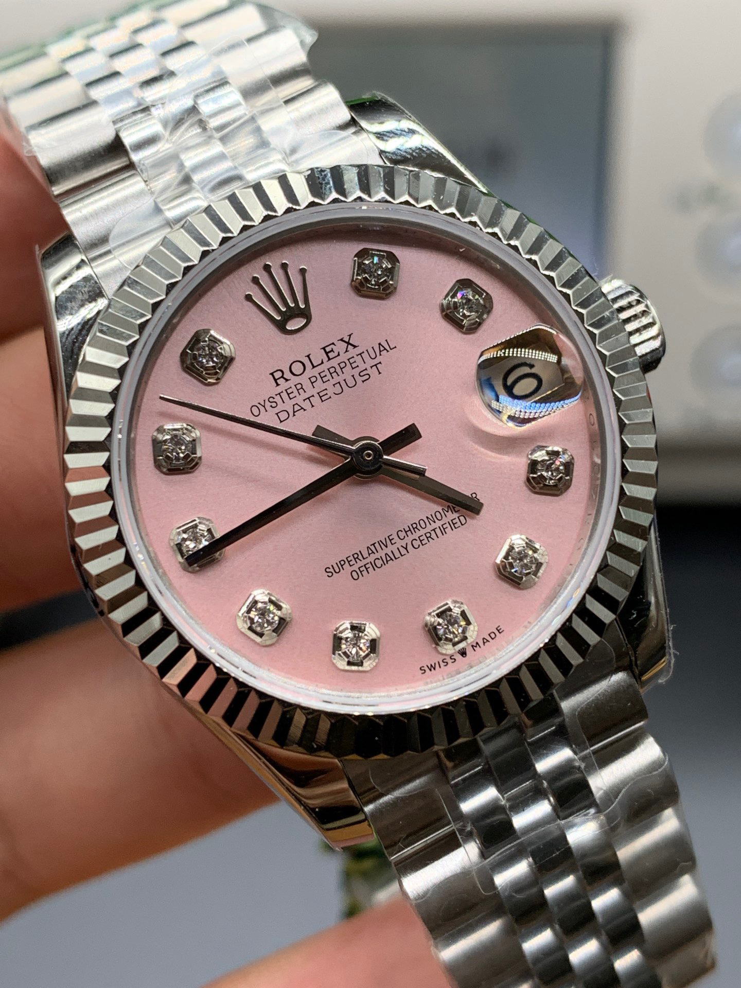 【高品质】龙虾粉表盘,劳力士女款原版开模:劳力士女装日志型28mm和31㎜新一代五件拼装头粒,隐蔽式弹簧皇冠带扣、开启劳力士皇冠标志轻松打开表带.表壳与表带之间达到无缝连接视觉效果,经过精细打磨的表耳光滑细腻、表壳侧面圆滑饱满具有原版气质,搭载私人订制纯进口全自动6t51上链机械机芯走时精准、稳定、近乎零返修『31毫米为2236机芯』整个制作工艺多处使用CNC技术.历时9个多月经过反复多次修改终于隆重首发!