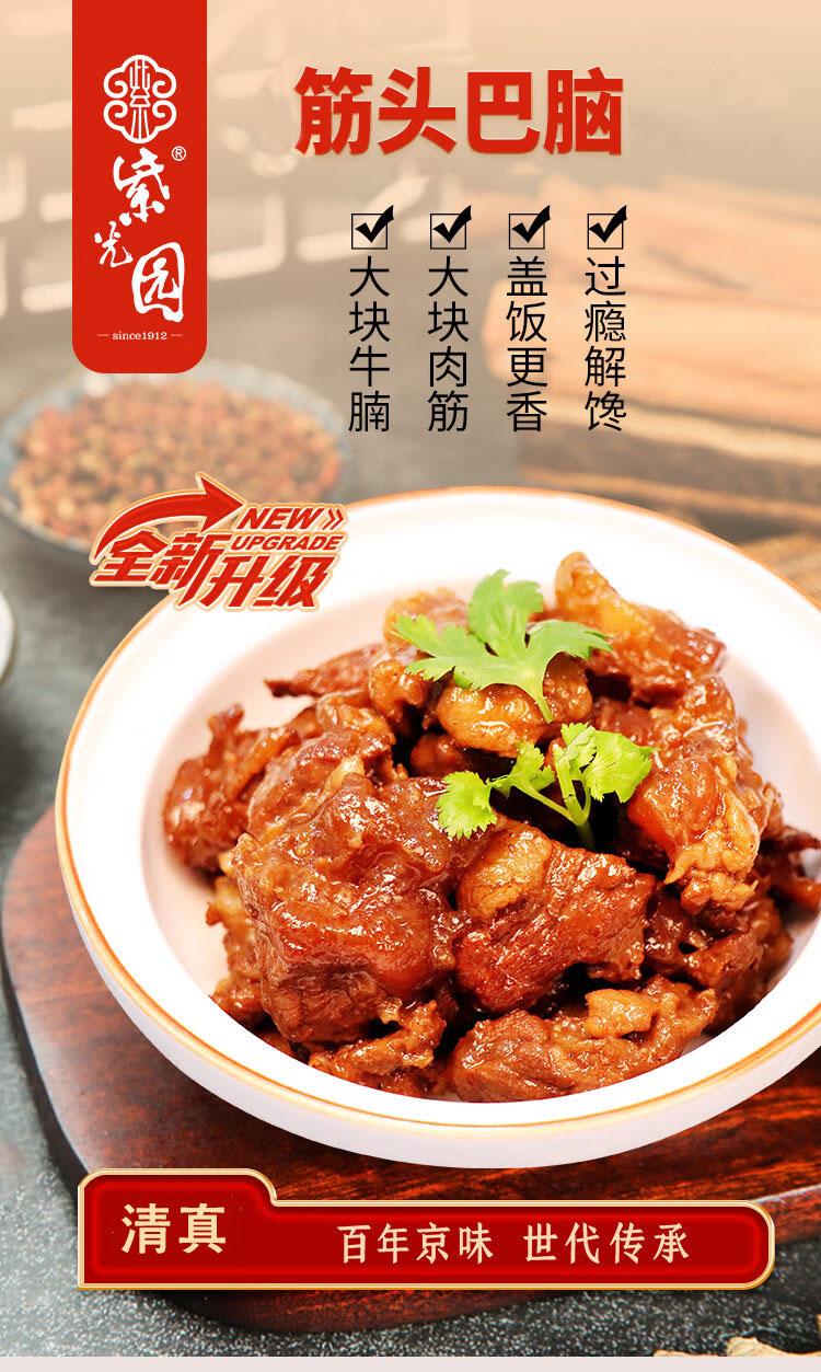 紫光园筋头巴脑,10袋组合,百年京味,世代传承,精选草原牛肉牛筋,多味香辛料精心调配腌制,香浓软糯,口感丰富,炖着吃,做火锅,吃法多样,肉质酥烂有嚼劲,大块牛肉牛筋,好吃解馋M