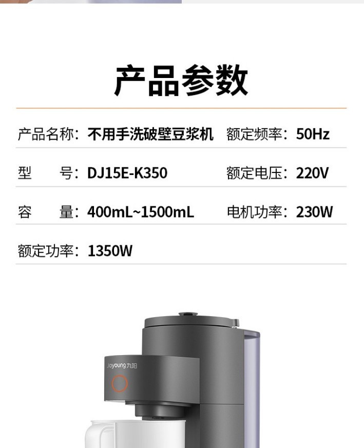 九阳(509350 ) Joyoung 破壁免洗豆浆机0.4-1.5L超大容量 智能熬煮多功能 轻松预约DJ15E-K350