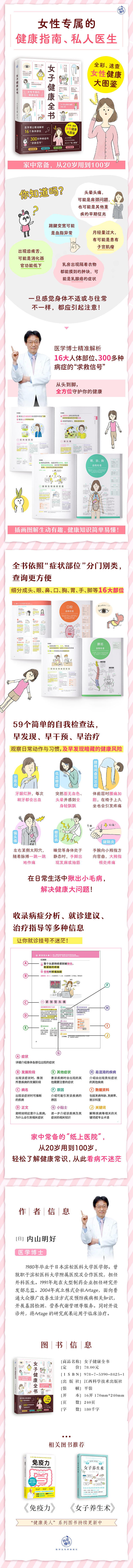 本书为针对20~100岁女性的健康大图鉴,精准解析人体16大部位、300多种病症的“求救信号”,以详细的文字进行解说,配上生动有趣的插画,同时收录了病名、主要症状、发病原因、其他症状、容易误认的疾病、高发年龄、门诊科别等信息。一本在手,即刻拥有自己的“私人医生”!
