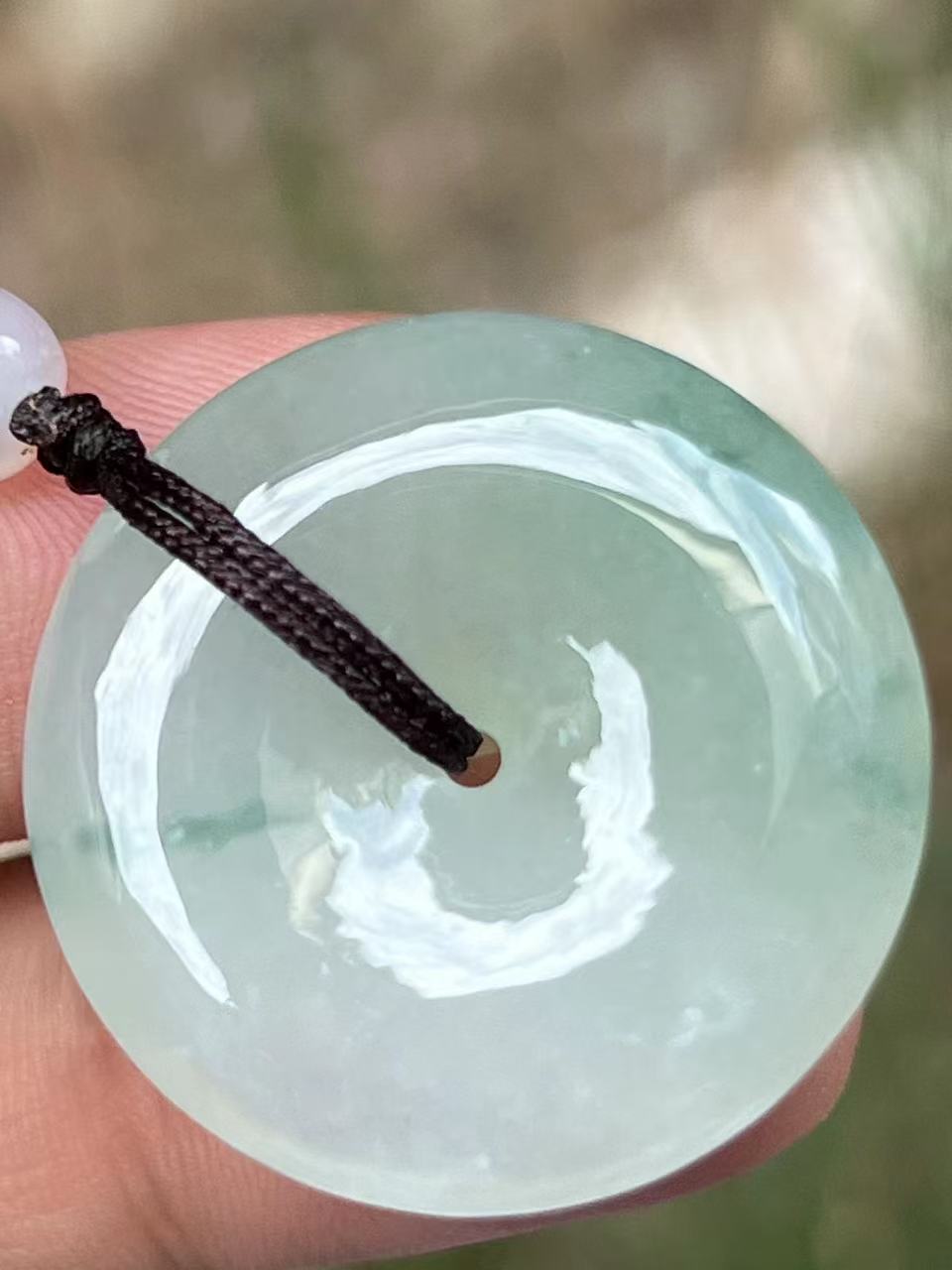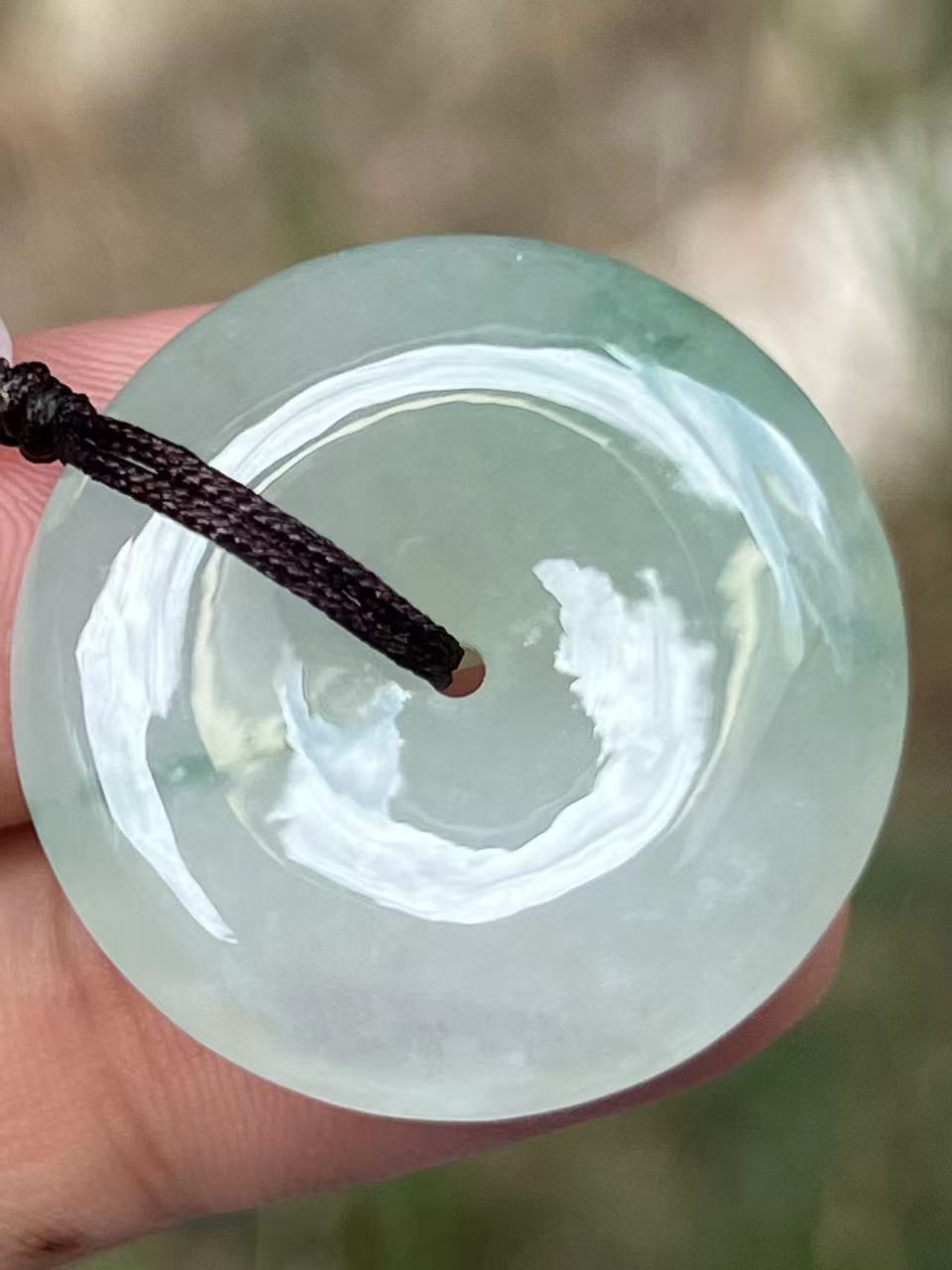 天然A货翡翠,冰润底子澄澈如水,幽幽兰花翩然绽放,似墨韵染宣,清雅自成。手工精雕平安扣,形如满月,佩之温润生香。每一缕飘花都是时光的笔触,戴一份文人风骨,藏一世平安喜乐。