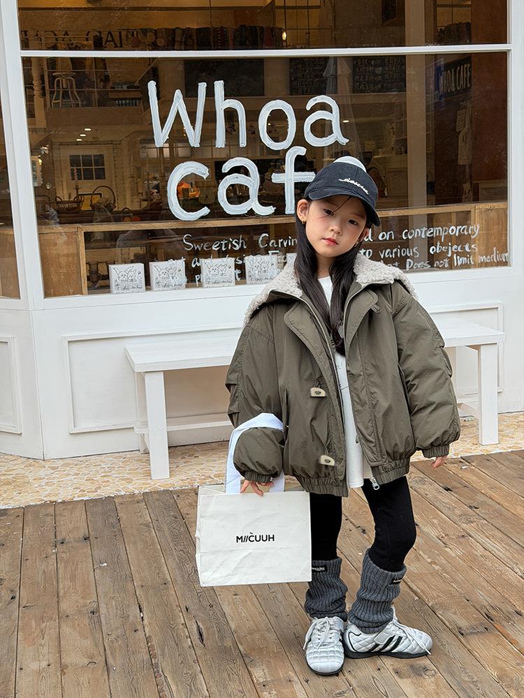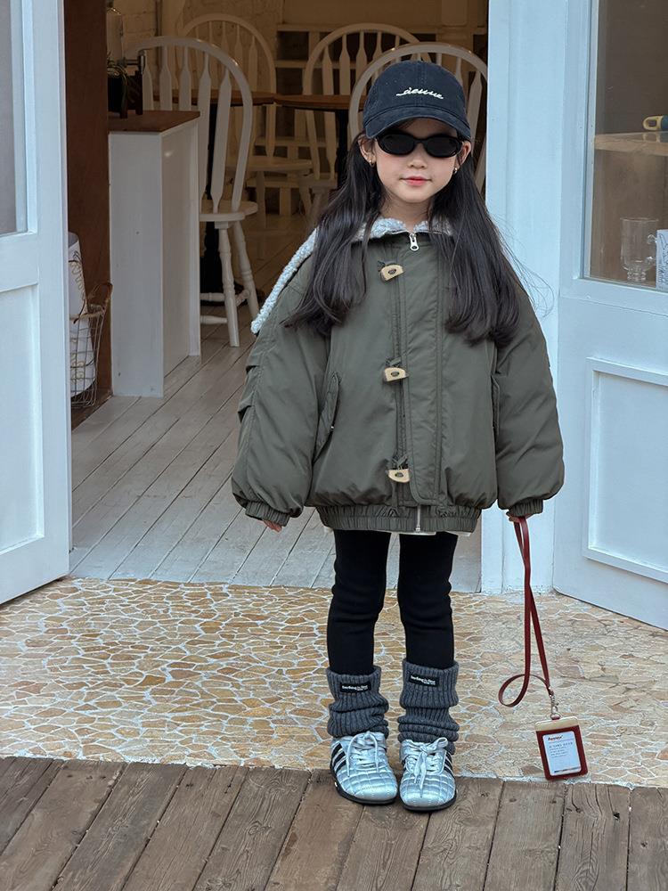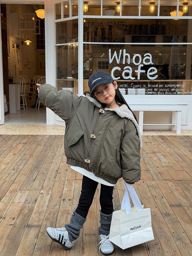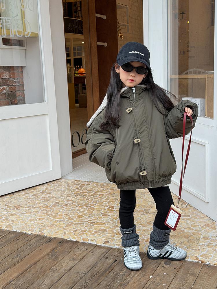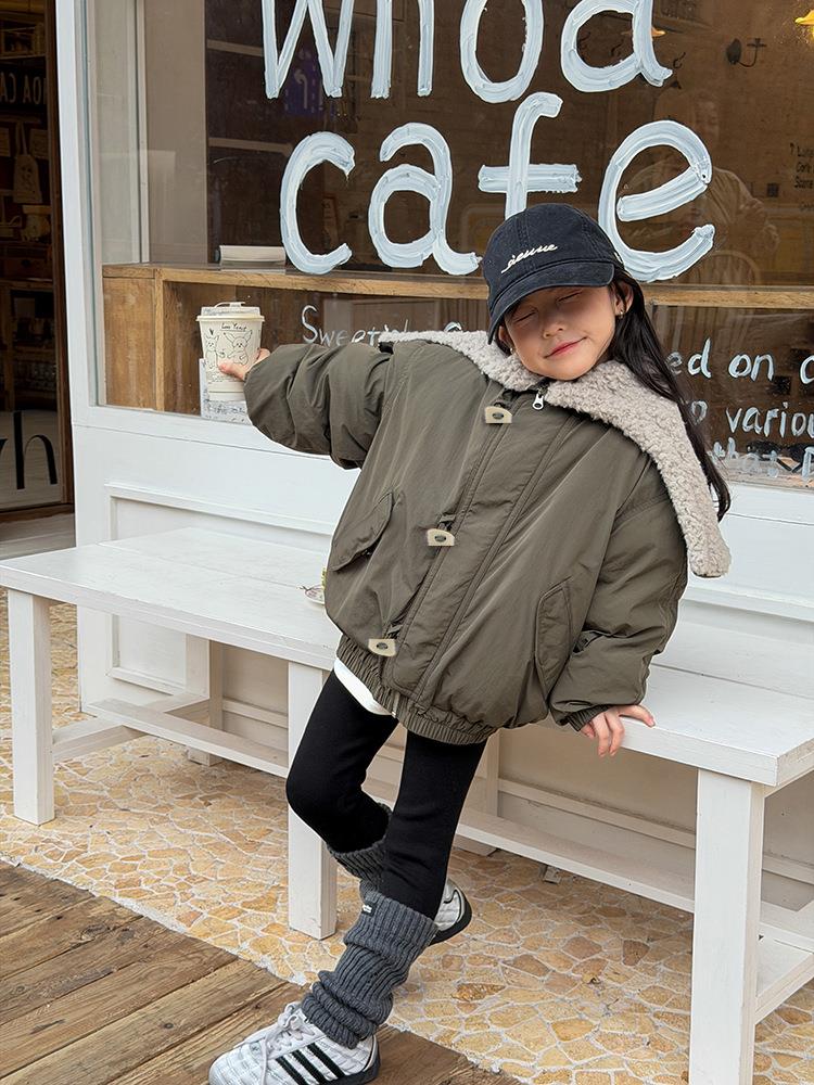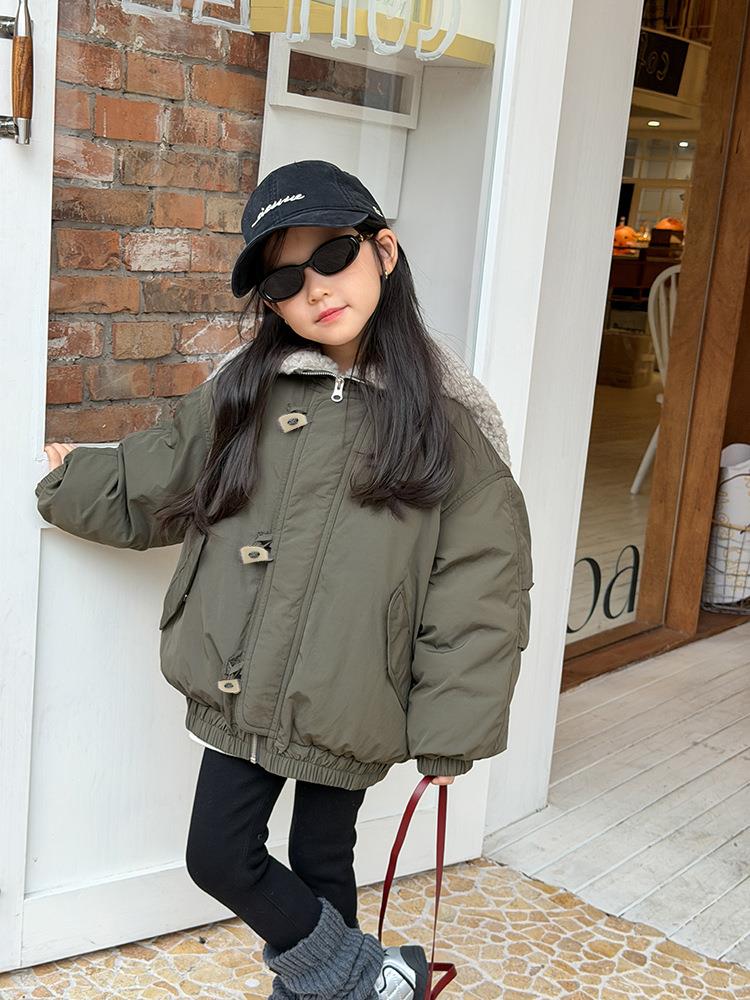 艾摩贝贝儿童保暖时髦牛角扣棉衣女童宽松毛绒翻领棉服连帽外套【杜邦棉】