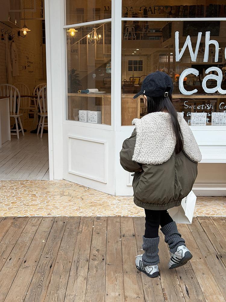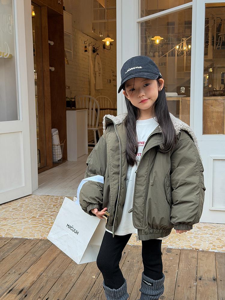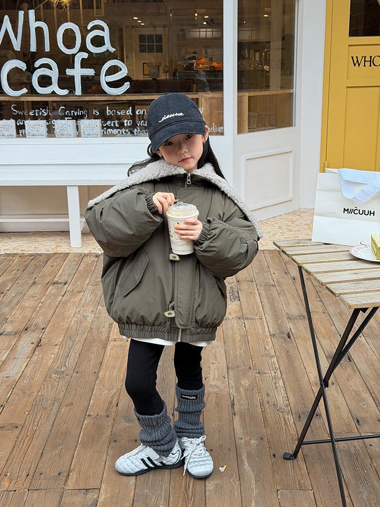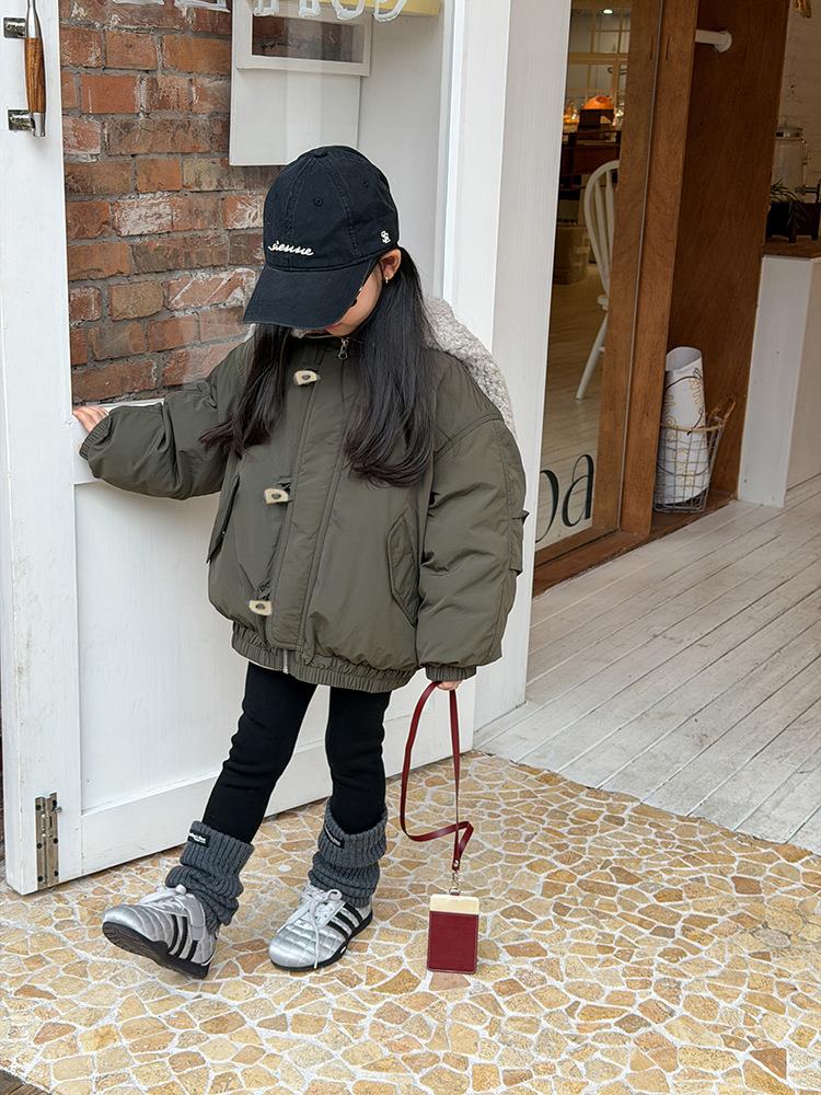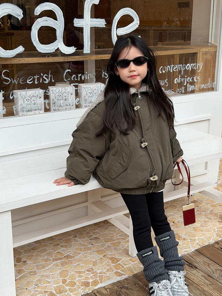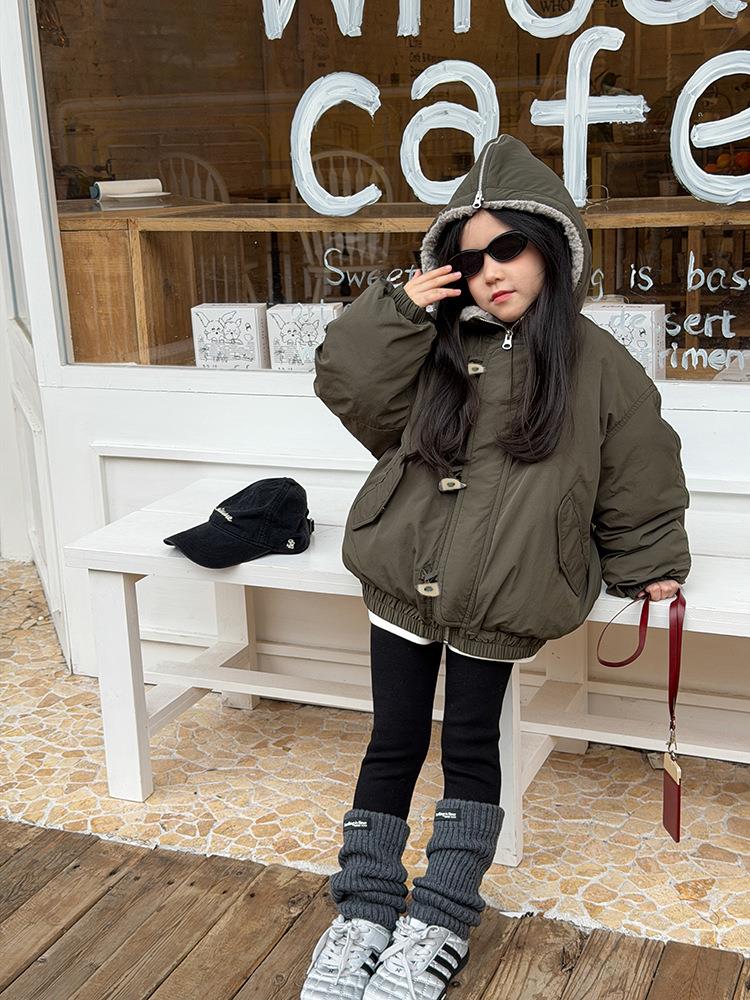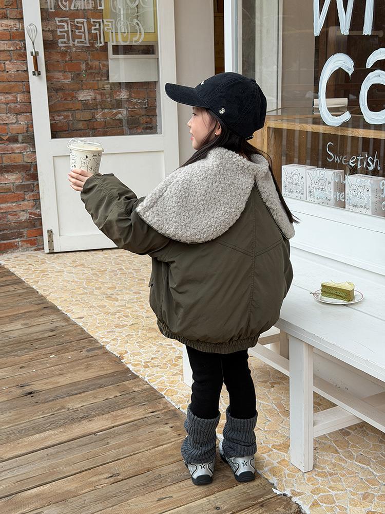 艾摩贝贝儿童保暖时髦牛角扣棉衣女童宽松毛绒翻领棉服连帽外套【杜邦棉】