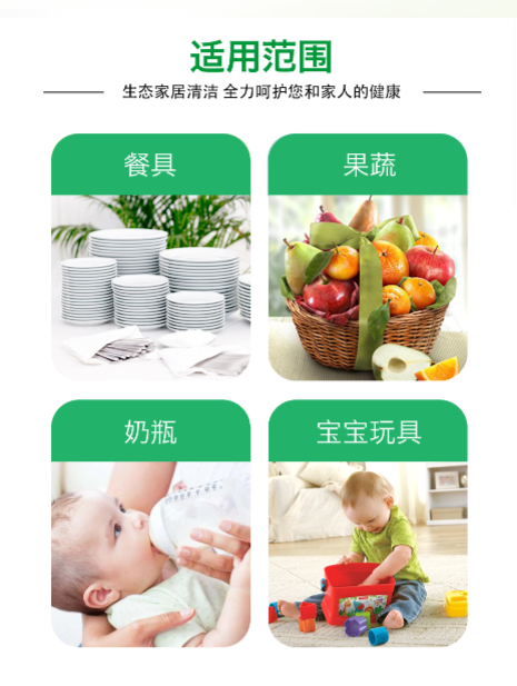 清洁各种搪瓷、玻璃、陶瓷、不锈钢、铝、塑料成分的餐具、厨具等,且具有消除异味以及作用;晾干后不留痕迹