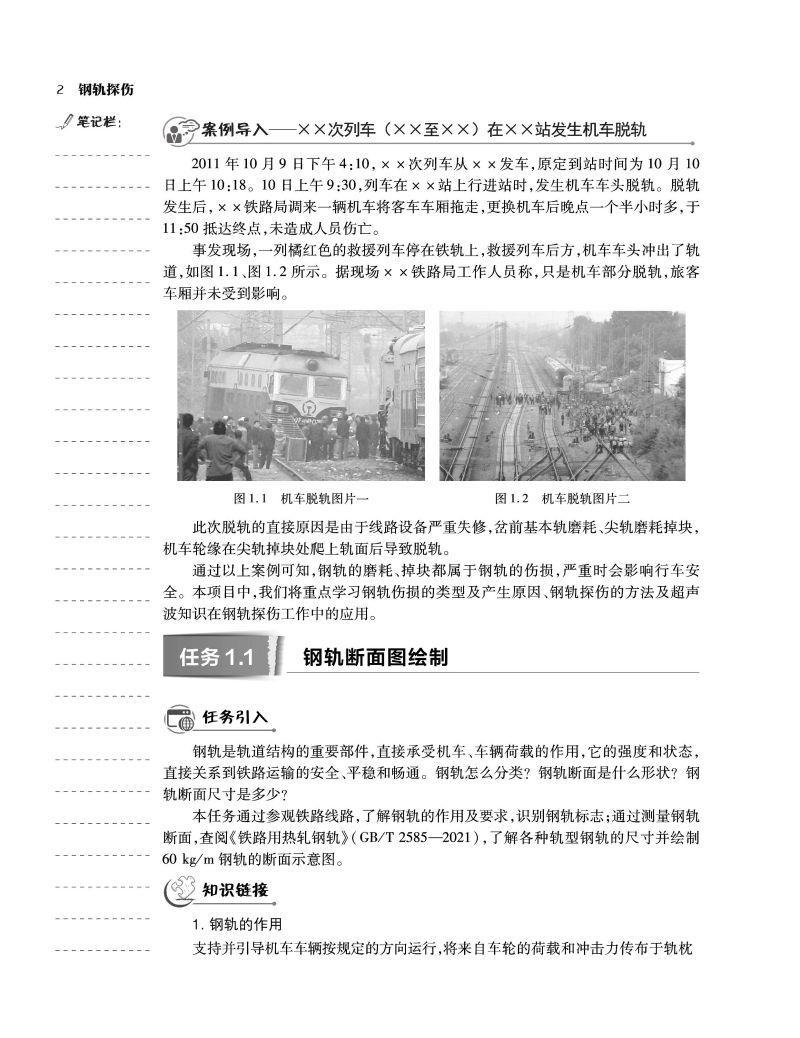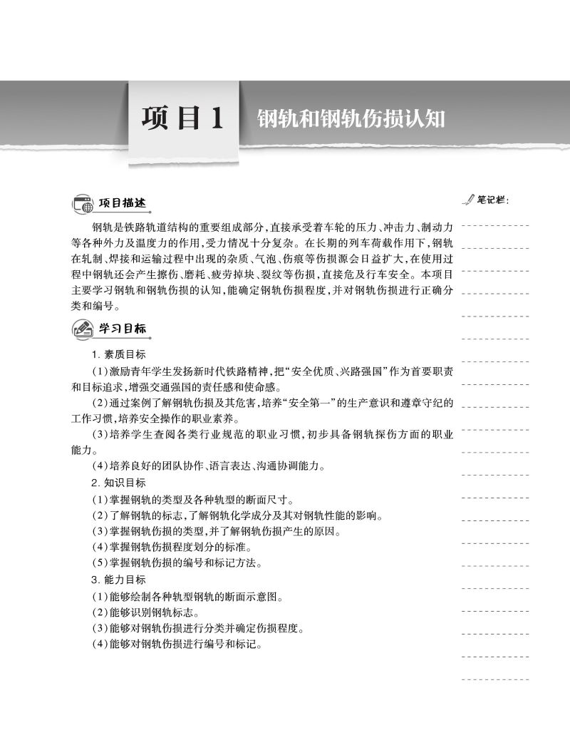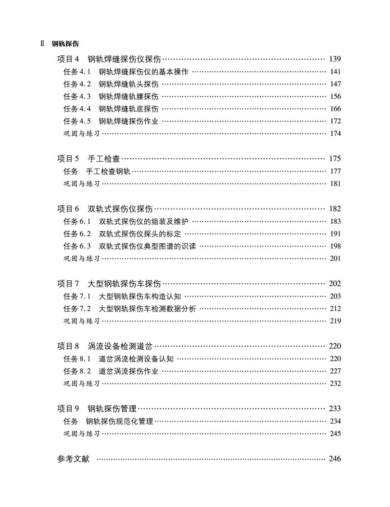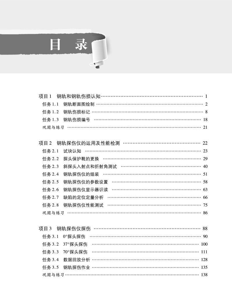 本书主要内容为超声波探伤原理、钢轨探伤设备、钢轨超声波探伤、钢轨焊缝超声波探伤,双轨式探伤小车和大型钢轨探伤车、手工检查及钢轨探伤管理,学生能够对钢轨探伤设备进行日常养护并进行性能测试,培养钢轨伤损的检出能力及分析能力。通过学习培养学生安全第一的生产意识、遵章守纪的工作习惯、精益求精的工匠精神,了解铁路探伤相关规范、标准、文件、安全操作规程,具备良好的职业道德和职业素养,能够胜任钢轨探伤工作。本书可以作为高等职业教育铁道工程技术专业学生的教学用书,同时也可作为关施工技术人员的参考书。