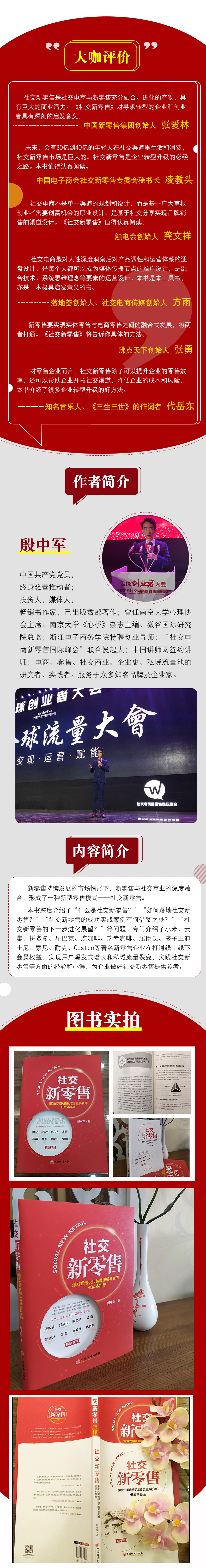 殷中军,投资人、媒体人、*书作家,曾任南京大学心理协会主席、南京大学《心桥》杂志主编、微谷国际研究院总监;浙江电子商务学院特聘创业导师;“社交电商新*售国际峰会”联合发起人;中国讲师网签约讲师;电商、*售、社交商业、企业史、私域流量池的研究者、实践者。
