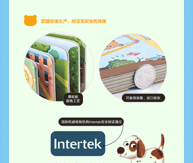 ★厚纸板、圆角工艺,不伤宝宝的小手;生产、可食用、,给宝宝安全的保障