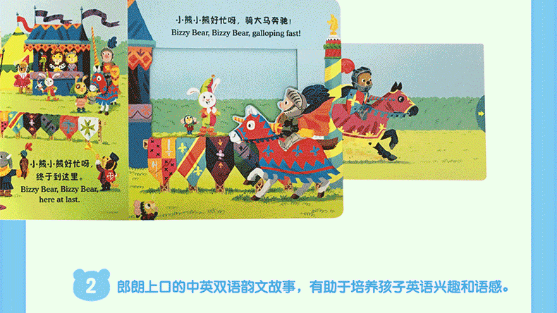 这套书是厚纸板游戏书,每本有不同的主题——海上冒险、太空遨游、参观恐龙园......不同的故事配上不同的互动操作页,宝宝的小手推一推、拉一拉、转一转、滑一滑就能看到意想不到的惊喜,既锻炼了小手的灵活性,又鼓励宝宝主动探索,这就是haode早教。文字也是本书的一大特色,在亲子阅读的时候,可以哼唱朗朗上口的中英歌谣,是孩子初的英语启蒙利器。英国上市一个月就冲进了低幼书的前十名,好评如潮!