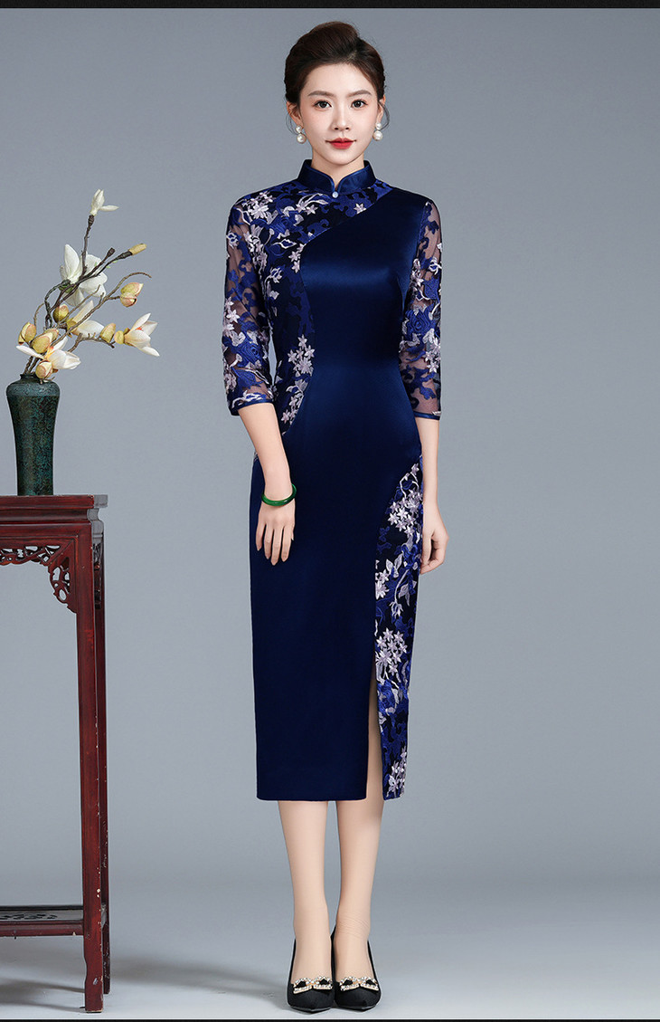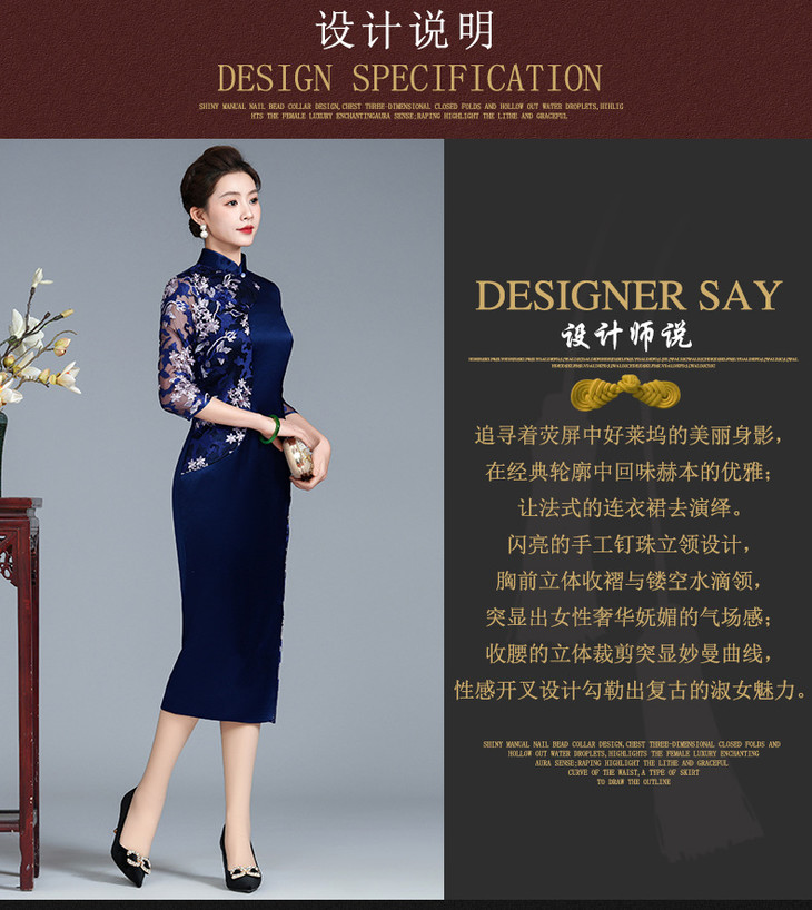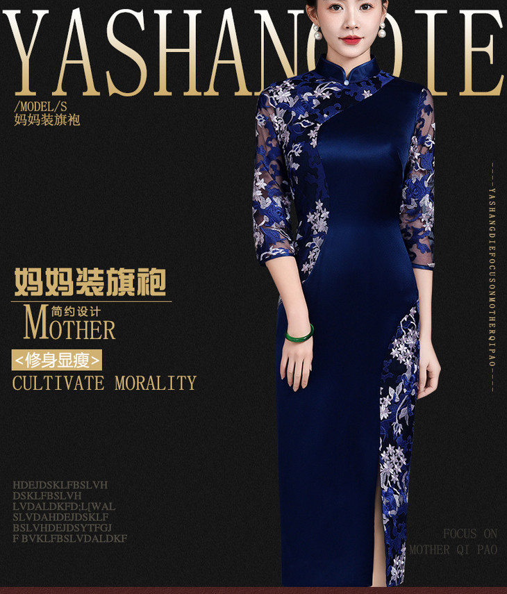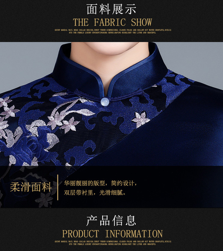 高端喜婆婆婚宴显瘦旗袍醋酸,婚礼妈妈礼服修身蓝色双拼改良裙LHS-B111