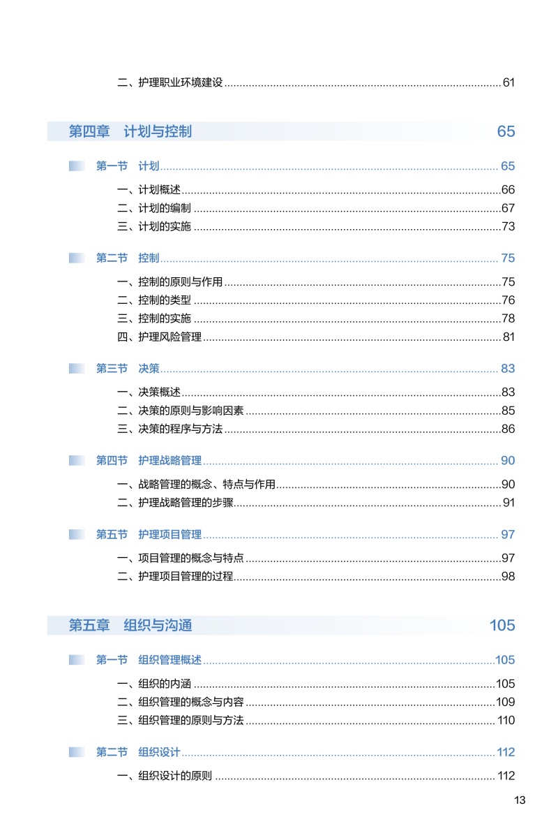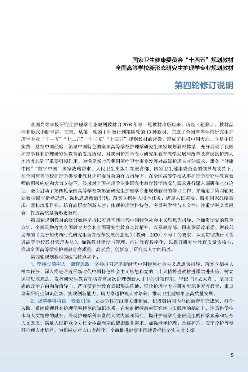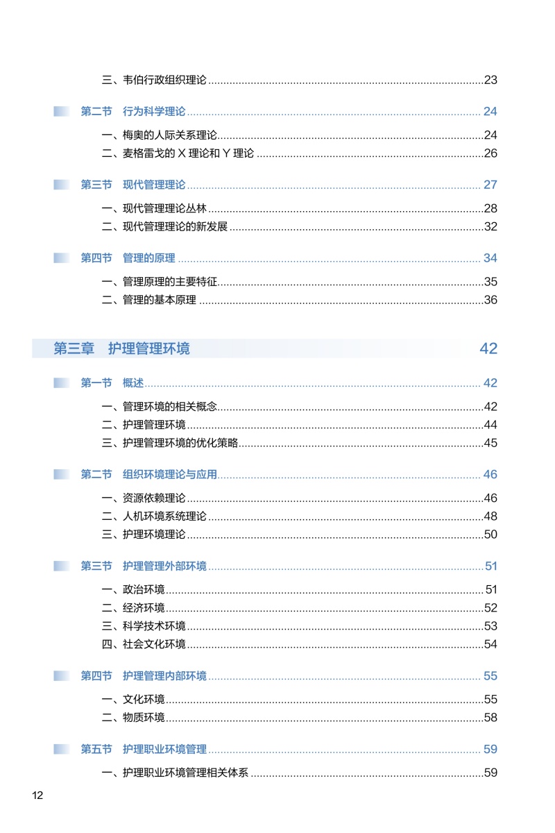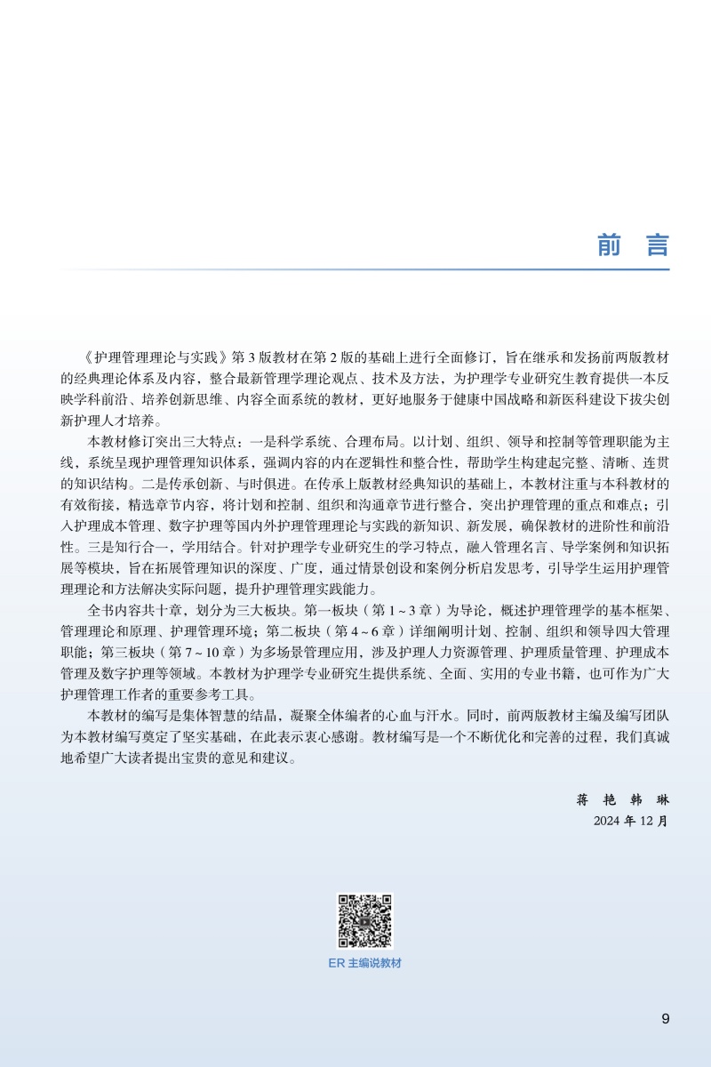 本教材的编写遵循“第四轮全国高等学校新形态研究生护理学专业'十四五'规划教材”整体规划要求。本教材以管理和管理学的基本理念、基本理论、综合应用、学科前沿为主线进行编写和修订,共分为十个章节,分别为护理与管理、管理理论与原理、护理管理环境、计划与控制、组织与沟通、领导与团队管理、护理人力资源管理、护理质量管理、护理成本管理、数智护理管理。在编写形式上,充分结合护理专业研究生具备较好的自主性、探索性学习特点,注重教材内容和形式的创新,每个章节以名人名言、学习目标、导学案例等进行导入,在正文环节附以管理经典、知识拓展、观点碰撞等BOX,最后有小结、启示与拓展,配套数字资源,辅以微课、课件、动画、思维导图等,以完整的知识链,富有思考的问题和案例帮助学生在探究学习过程中形成内化的知识、能力、素质体系,有效提升学生核心能力和素养。
