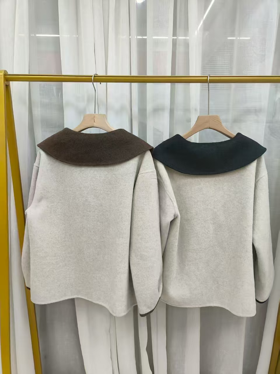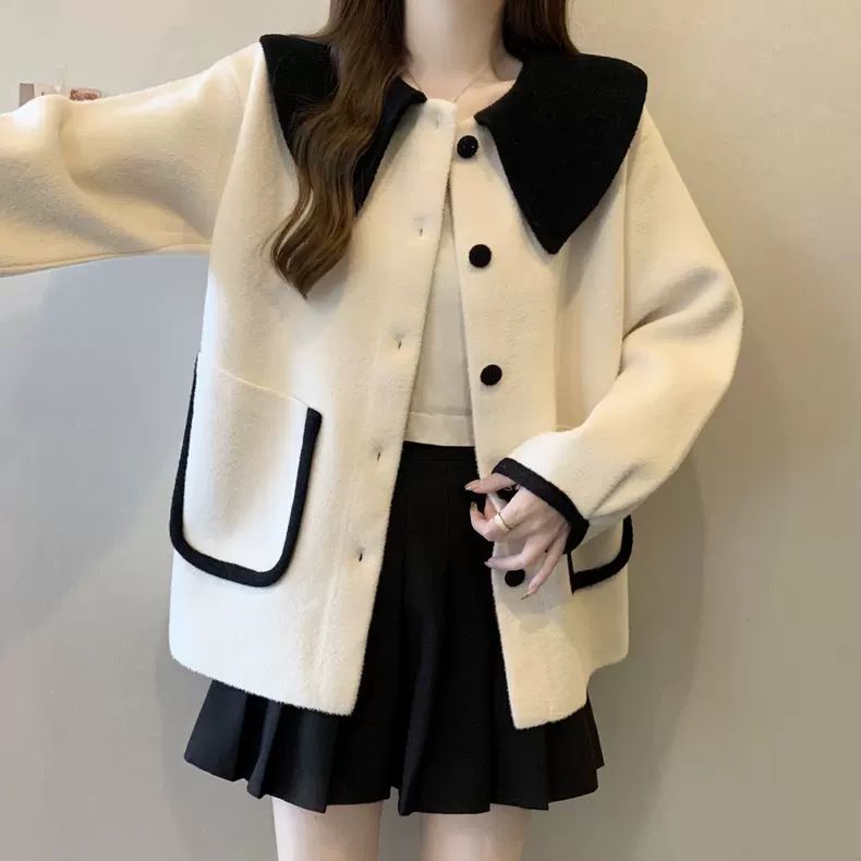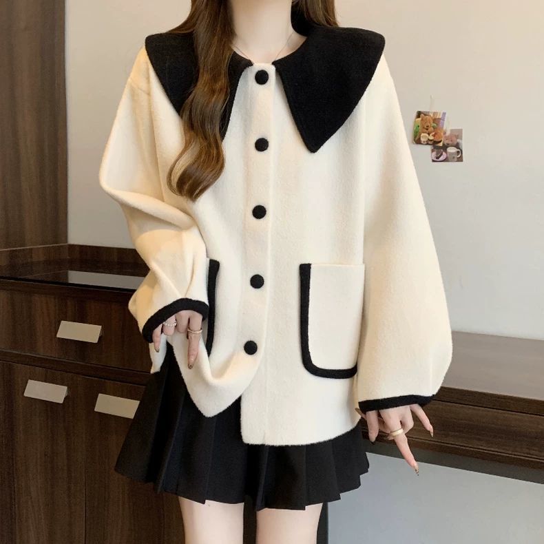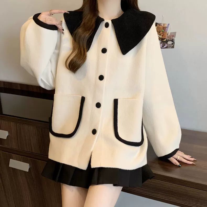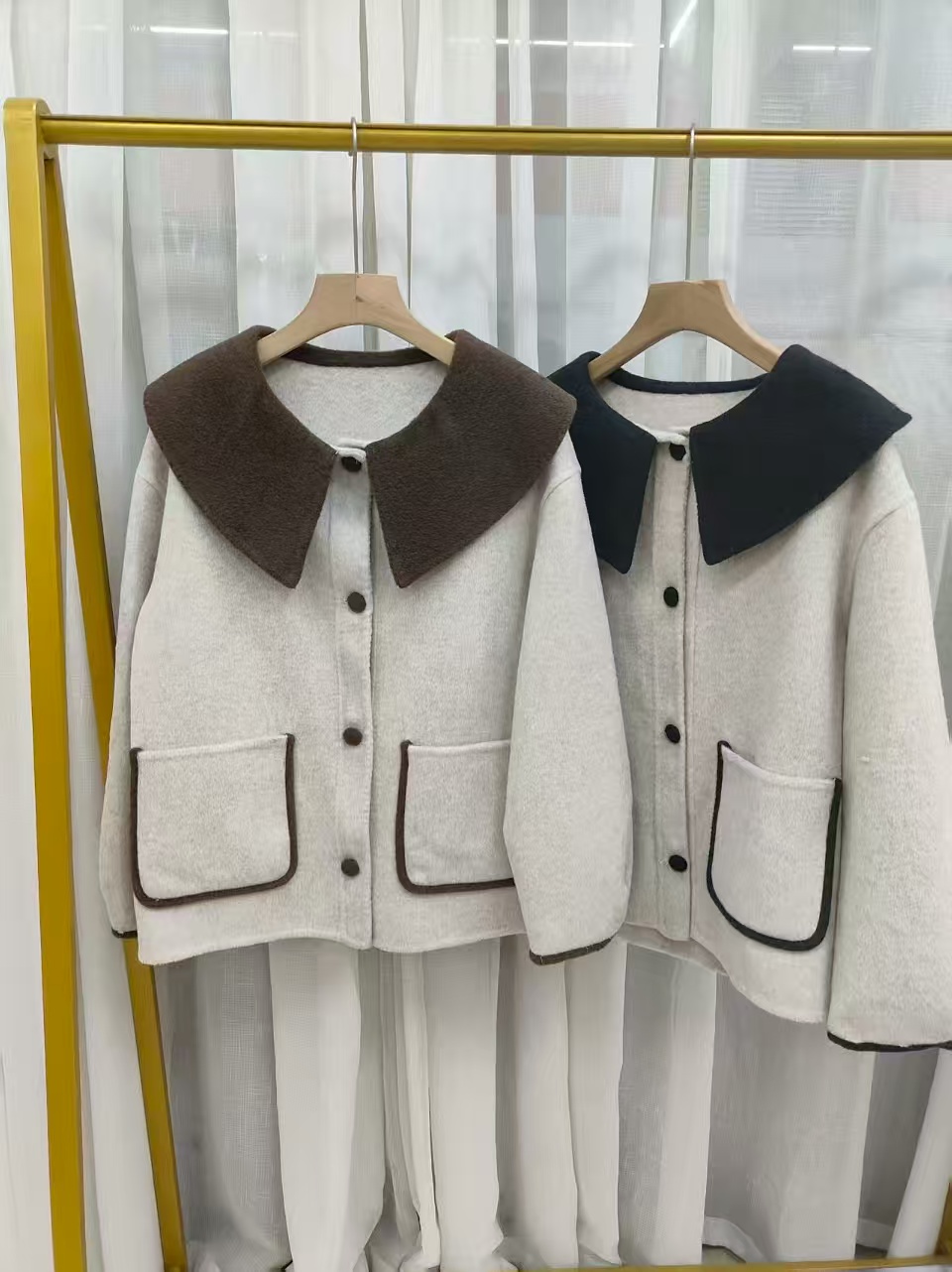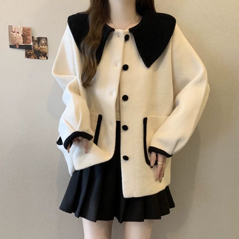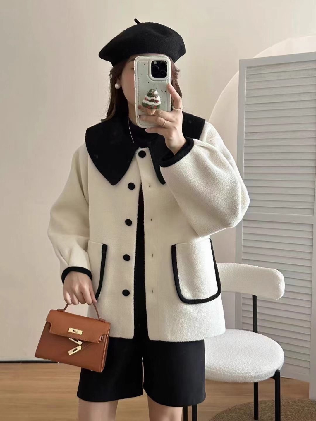 【YW】无忧购娃娃领撞色短款珍珠呢大衣女秋冬新款洋气外套小个子宽松加厚上衣8808(截单后3-5天发货)