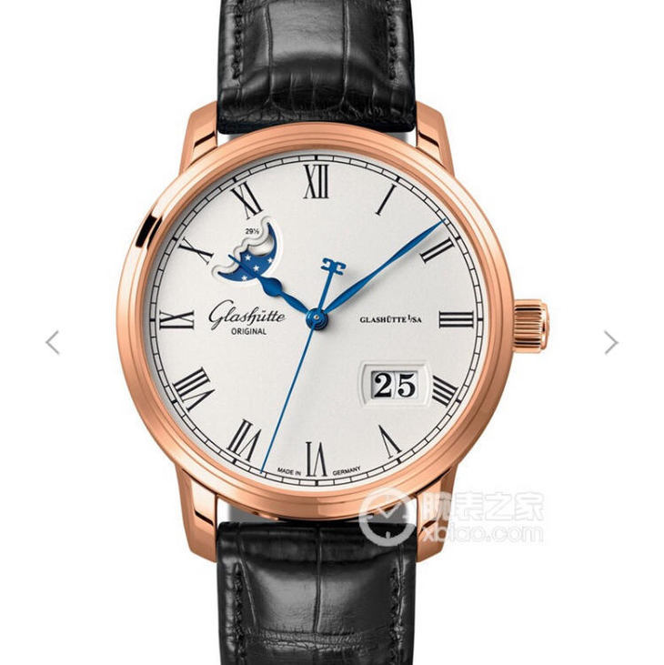 F格拉苏蒂原创议员大日历月相腕表100-04-32-12-04 。直径40mmx厚11mm。男士手表,皮表带,自动机械机芯,透底