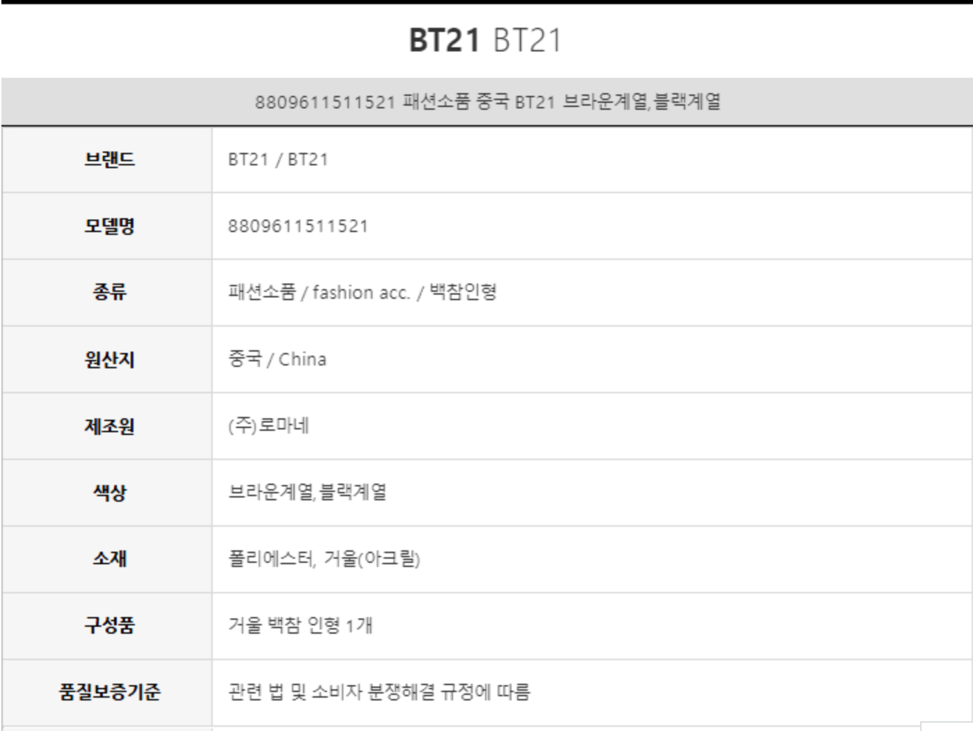 BT21 SHOOKY镜后吊饰娃娃