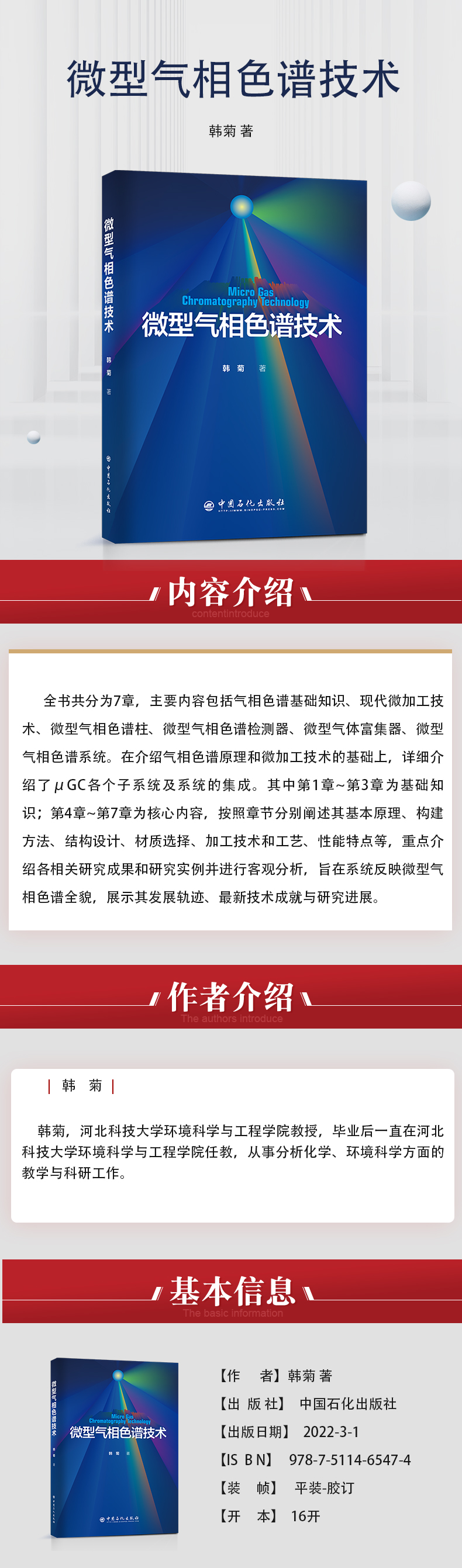 全书共分为7章,主要内容包括气相色谱基础知识、现代微加工技术、微型气相色谱柱、微型气相色谱检测器、微型气体富集器、微型气相色谱系统。在介绍气相色谱原理和微加工技术的基础上,详细介绍了μGC各个子系统及系统的集成。其中第1章~第3章为基础知识;第4章~第7章为核心内容,按照章节分别阐述其基本原理、构建方法、结构设计、材质选择、加工技术和工艺、性能特点等,重点介绍各相关研究成果和研究实例并进行客观分析,旨在系统反映微型气相色谱全貌,展示其发展轨迹、*成*与研究进展。