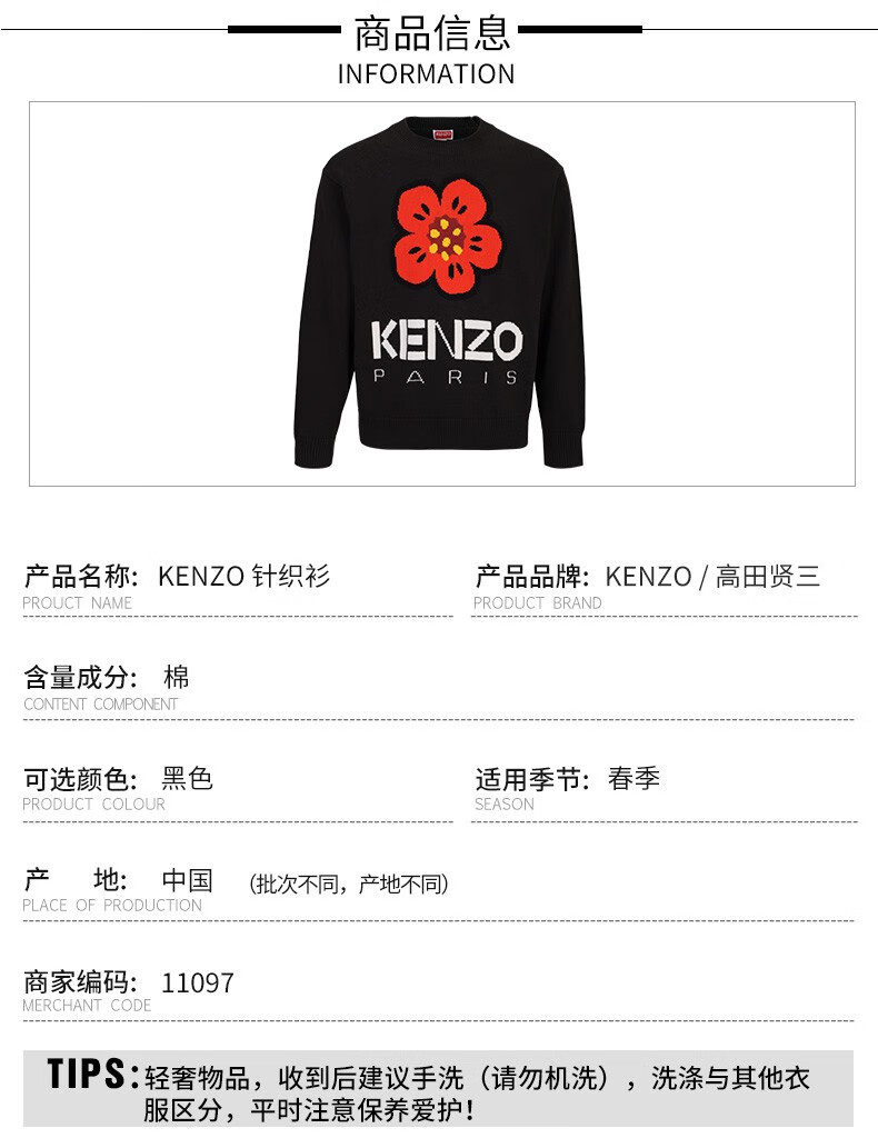 【超惠秒】KENZO 高田贤三 男女通款 全棉海棠花针织logo套头毛衣11097