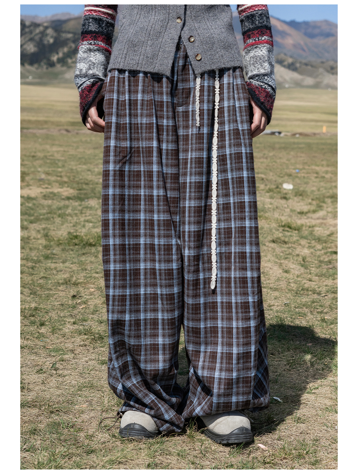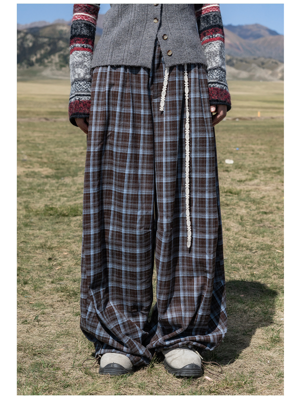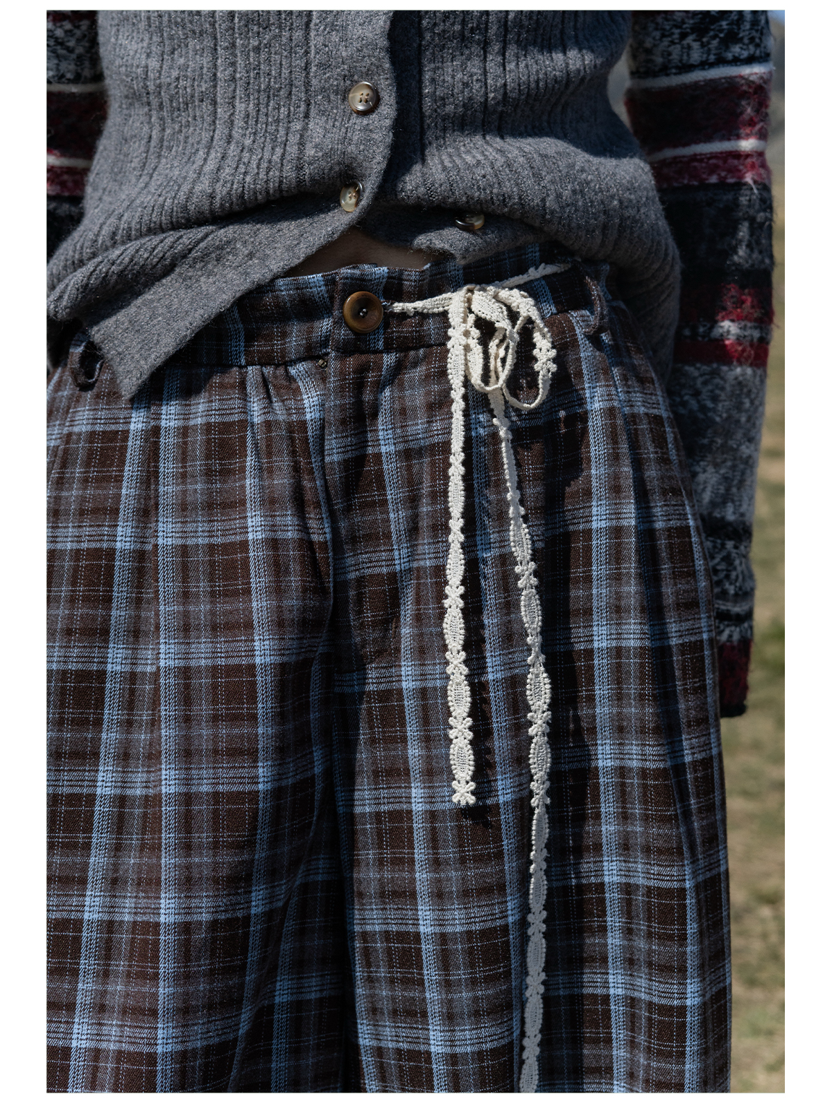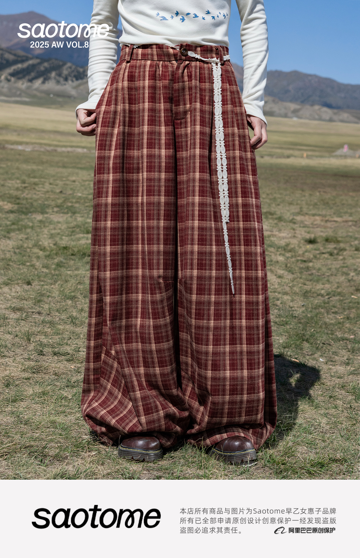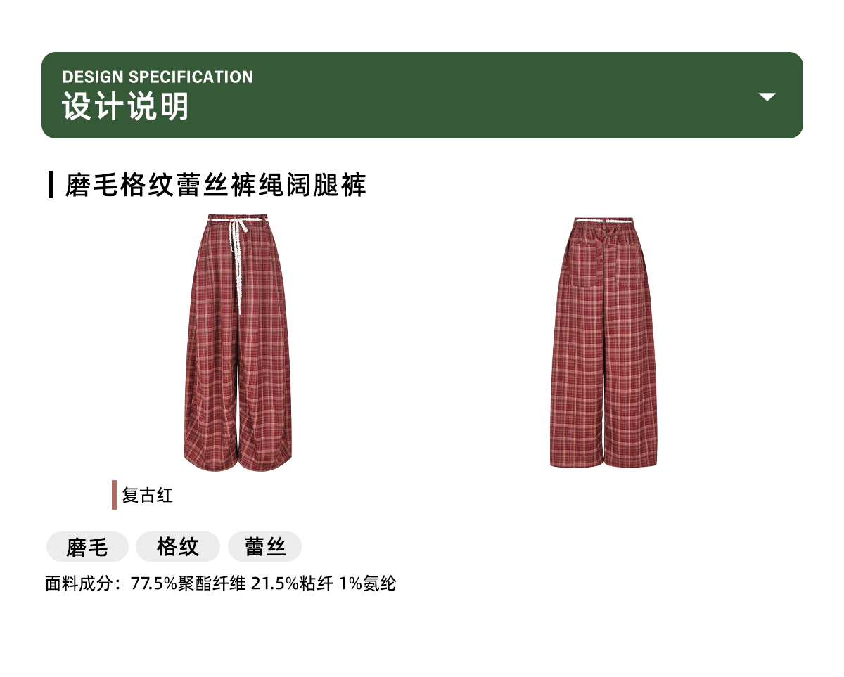 早乙女惠子saotome/STMKZ14910/磨毛格纹蕾丝裤绳阔腿裤