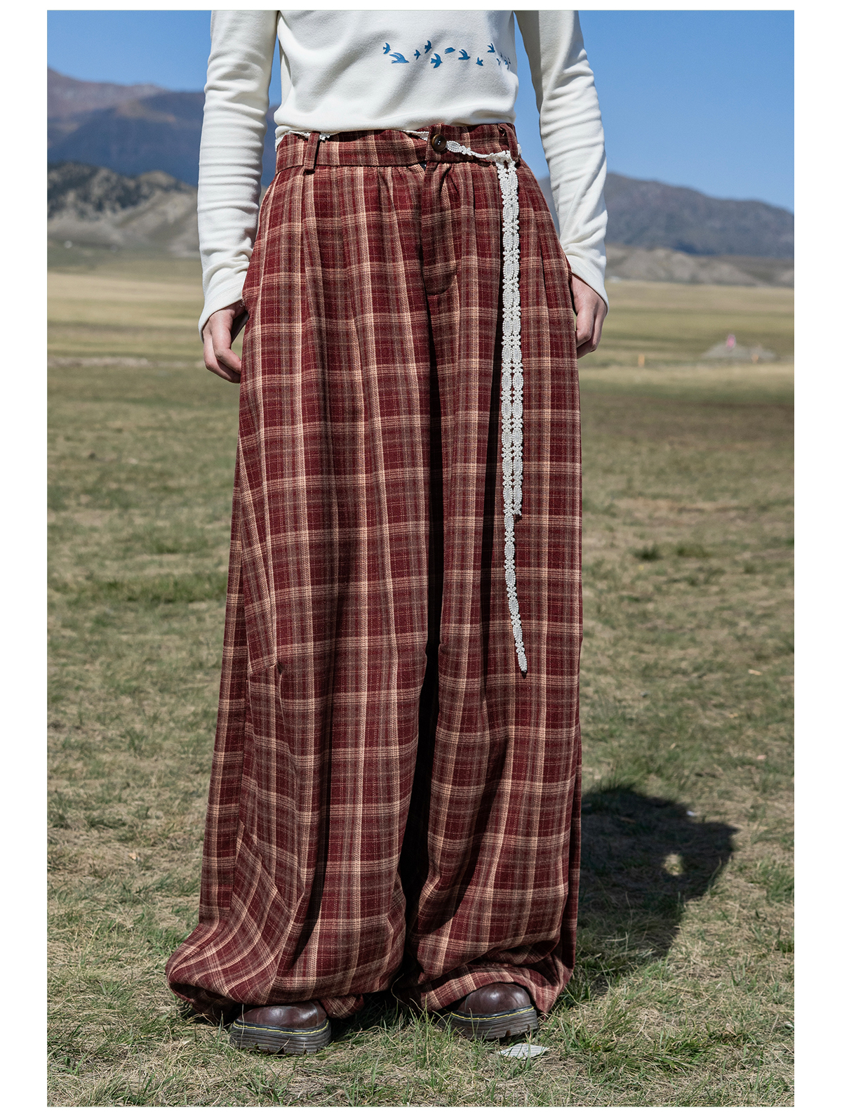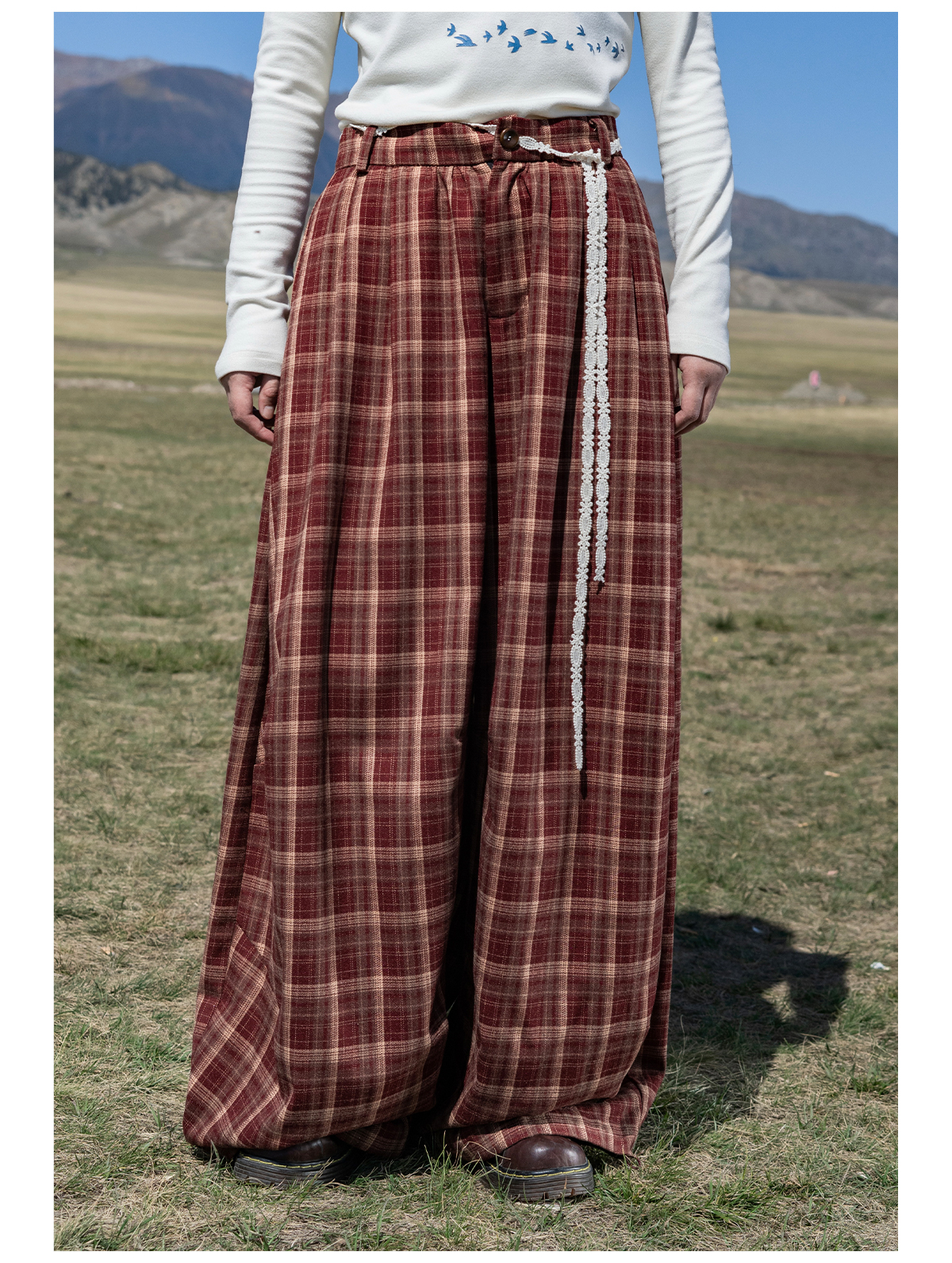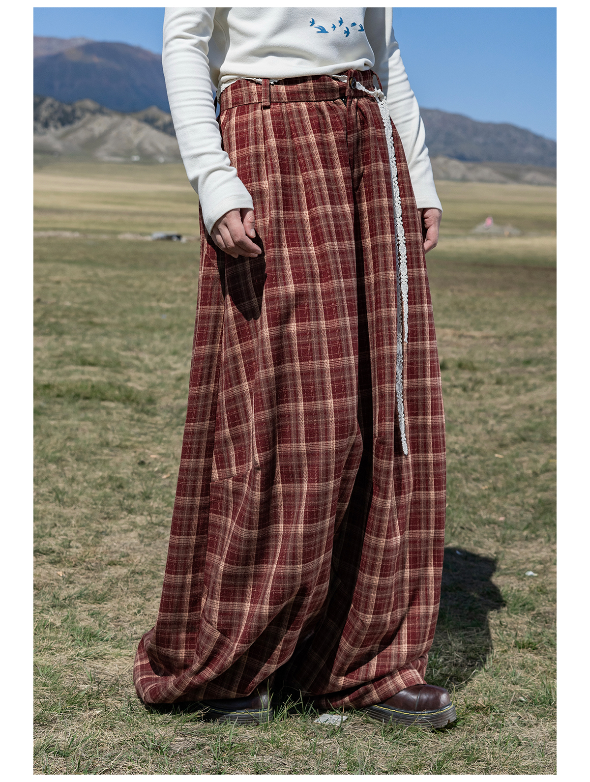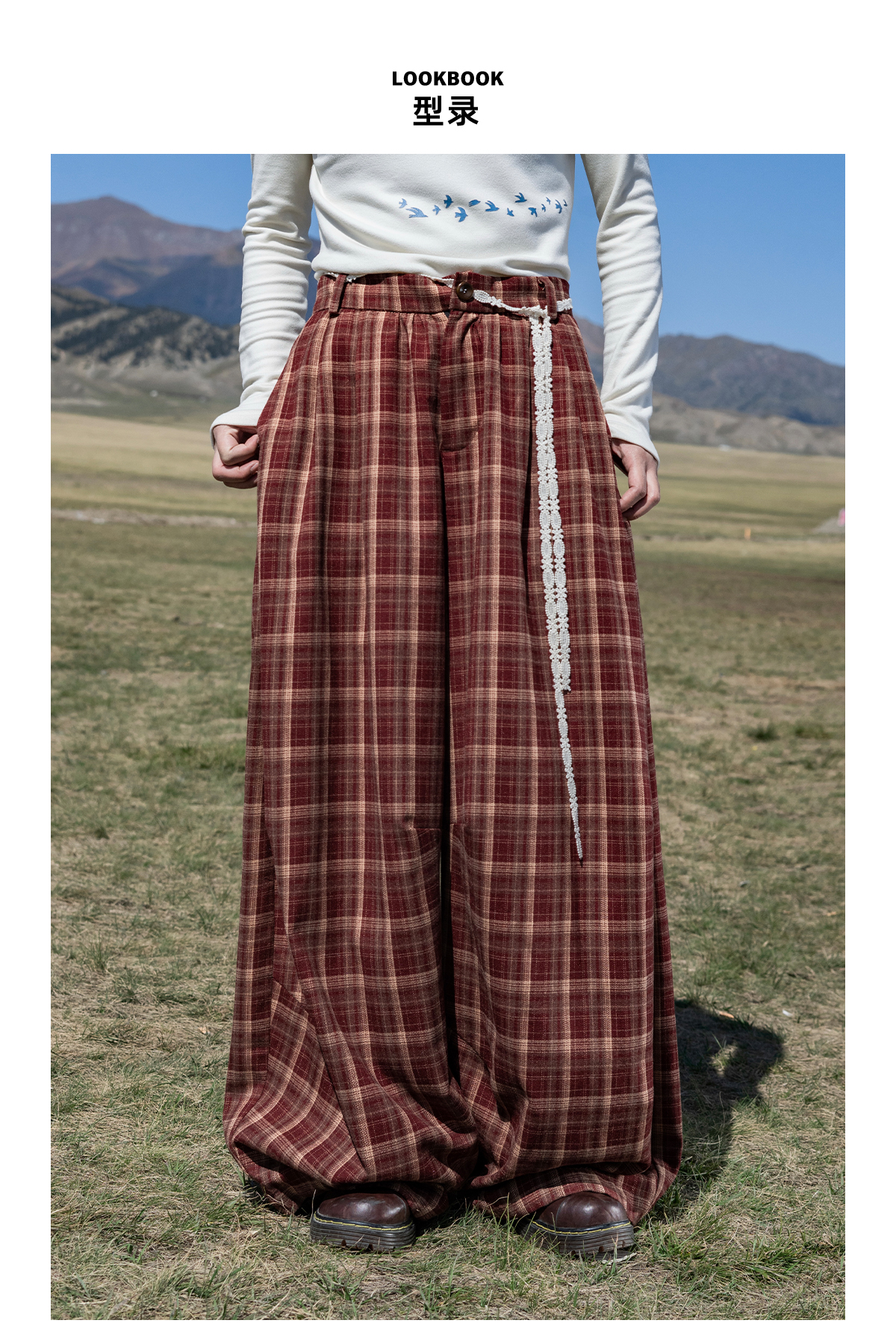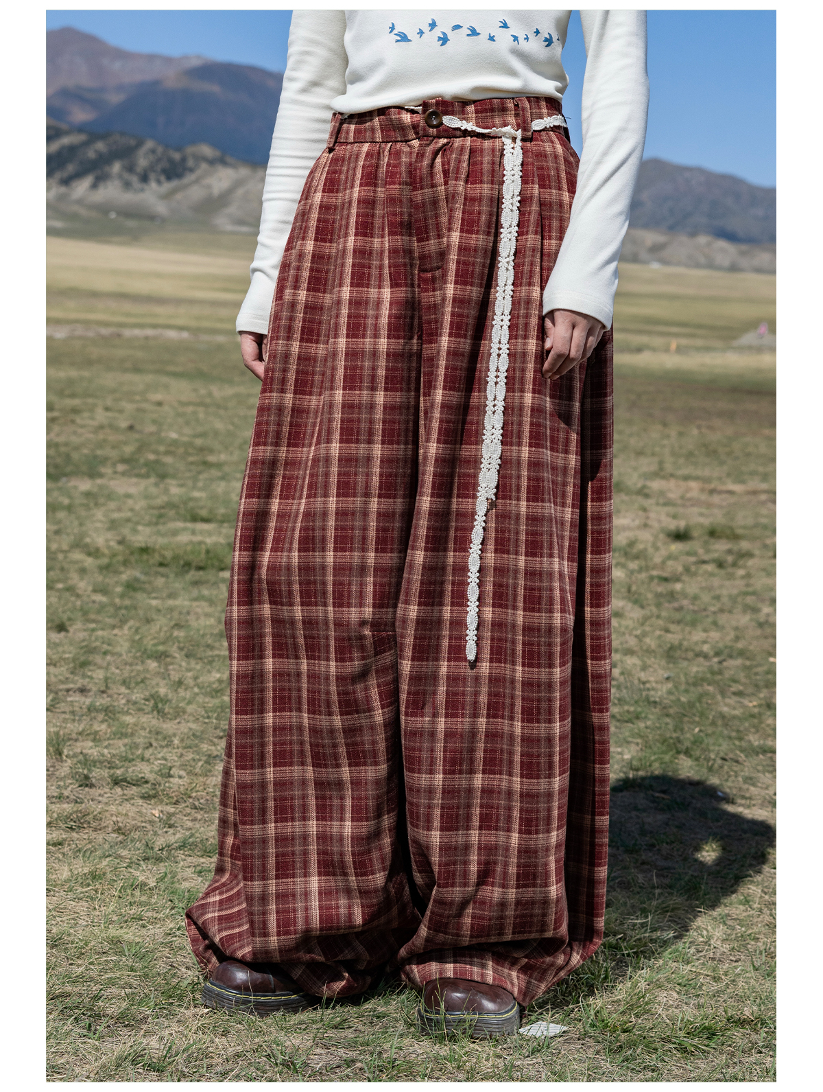早乙女惠子saotome/STMKZ14910/磨毛格纹蕾丝裤绳阔腿裤