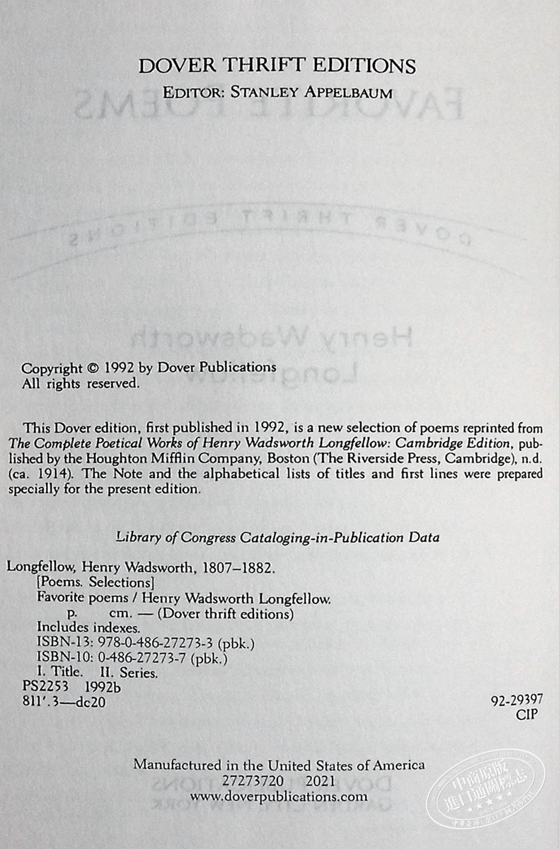 【中商原版】Dover Thrift Editions:Favorite Poems 英文原版 美国诗人朗费罗诗选 Henry Wadsworth Longfellow