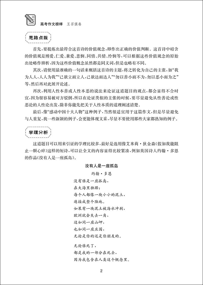 《高考作文榜样 王召强卷》从12个原创议题出发,每讲通过命题意图、思路点拨、学理分析、思维导图、优秀范文等多个版块组合,从审题角度、论点确立、论证步骤、论据资源等方面,系统地指导学生从根本上攻克写作难题。