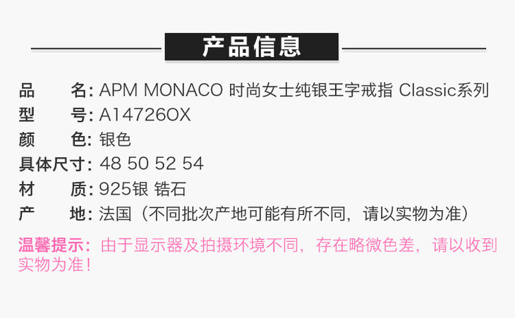 双11【香港直邮】APM MONACO 时尚女士纯银王字 56码戒指 Classic系列 A14726OX