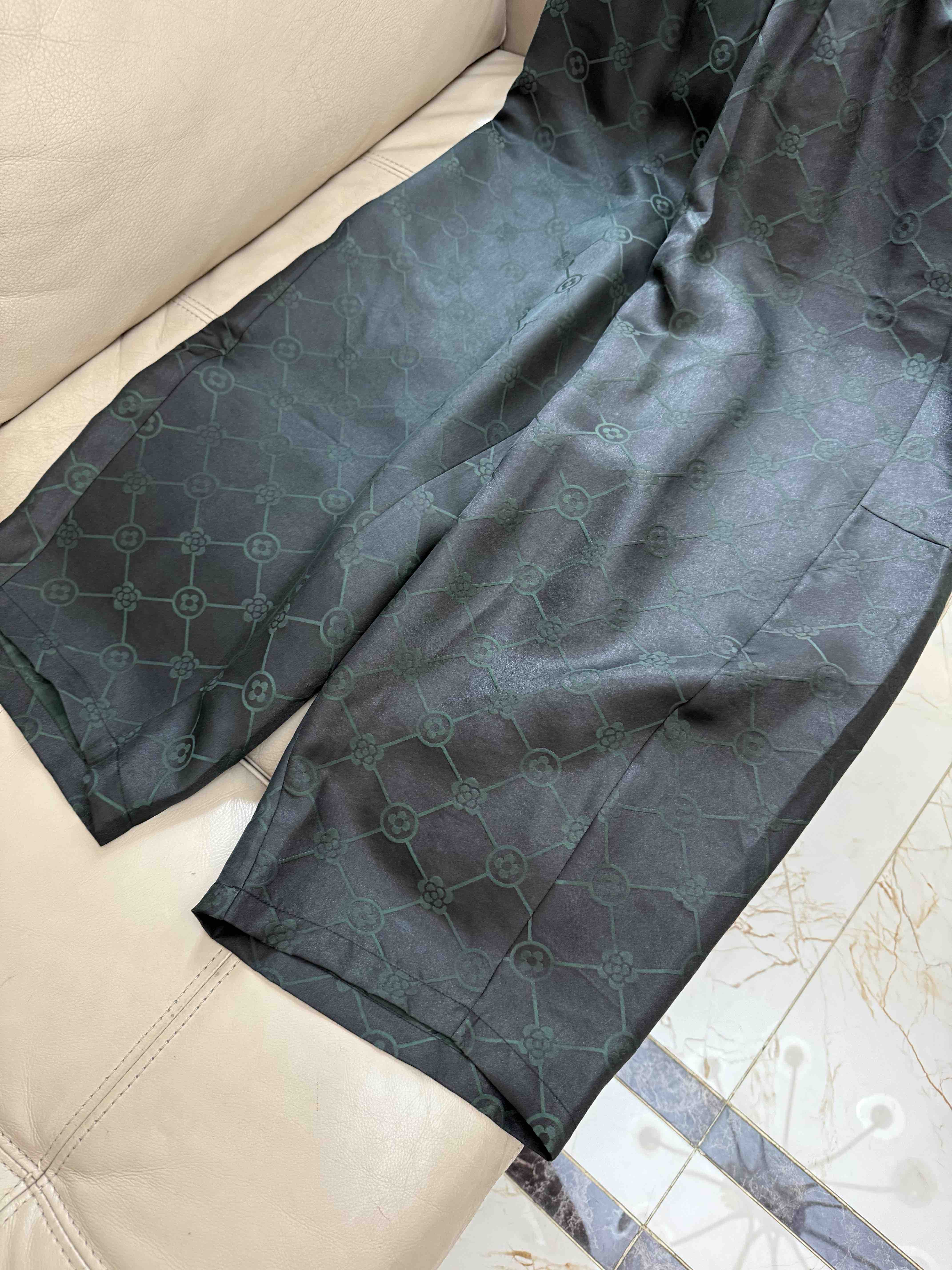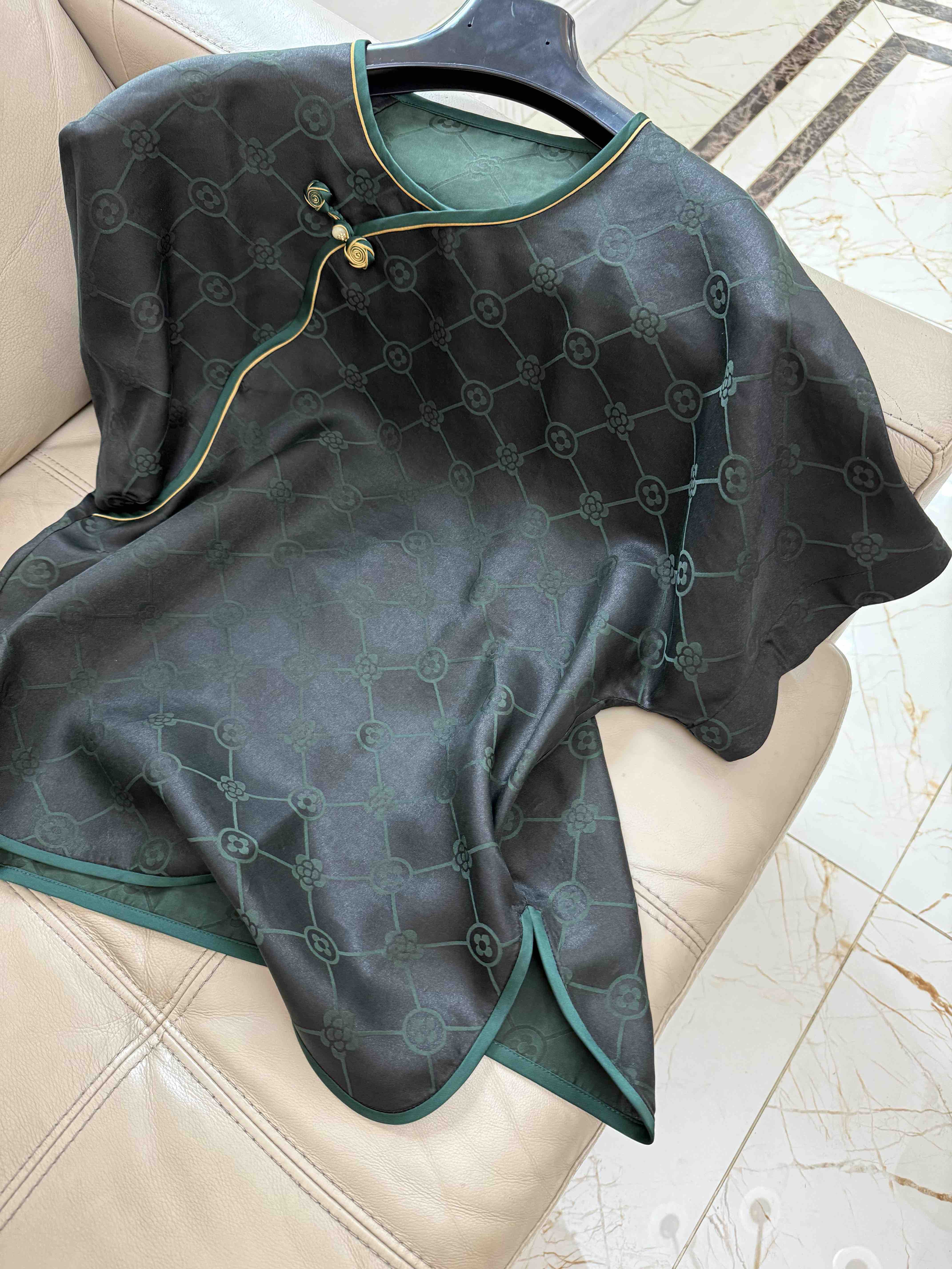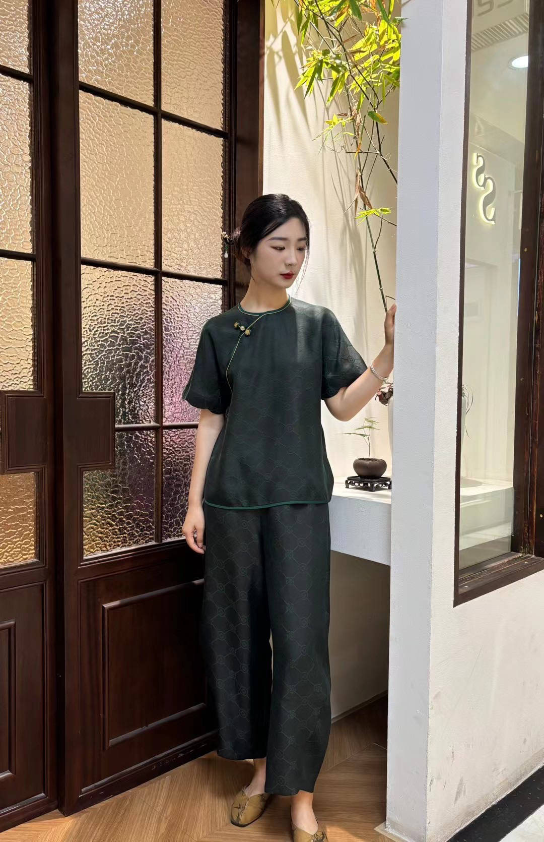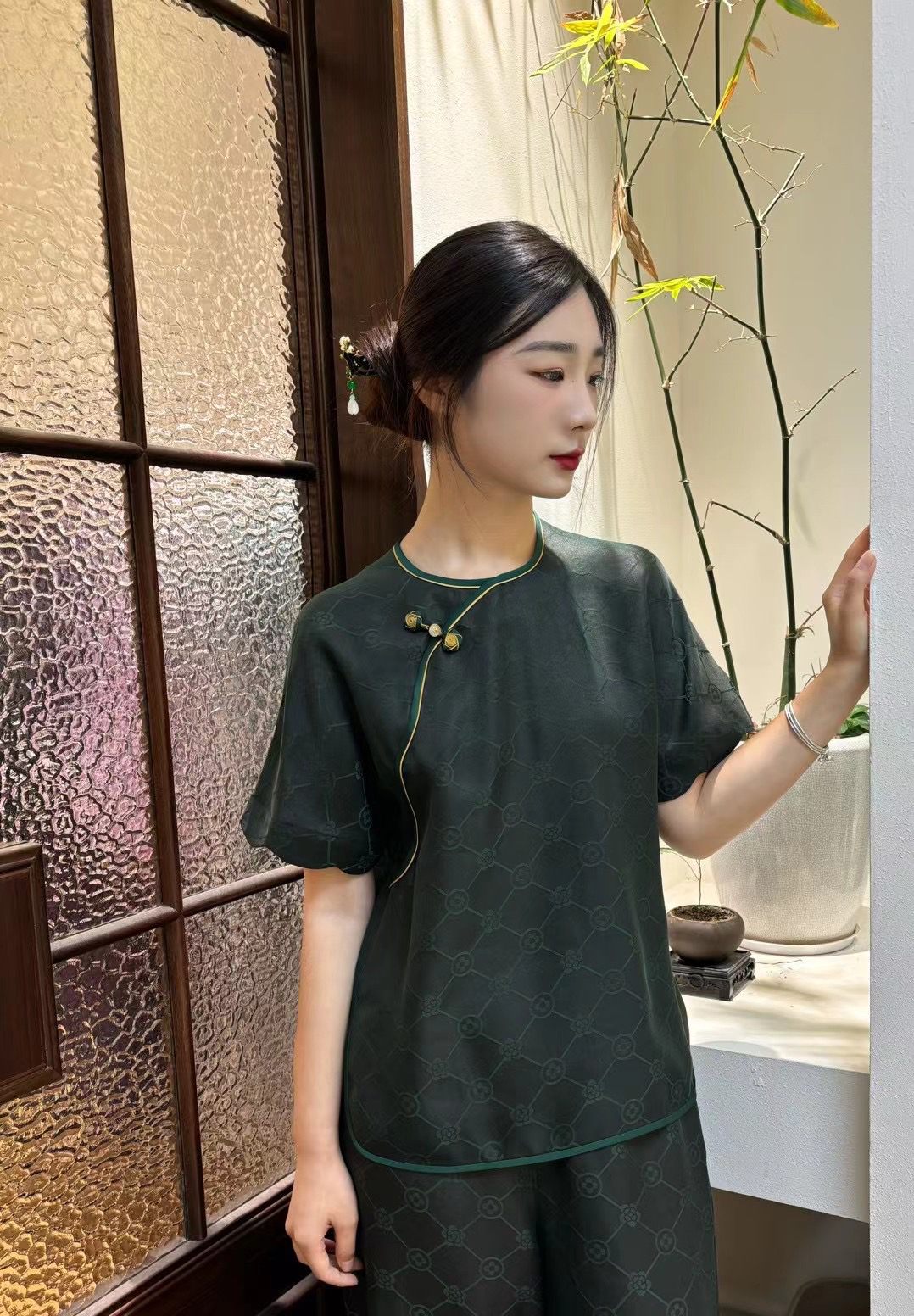 712-4 新中式 四时吉祥 香云纱提花 盘扣斜襟短袖上衣 松紧腰灯笼裤