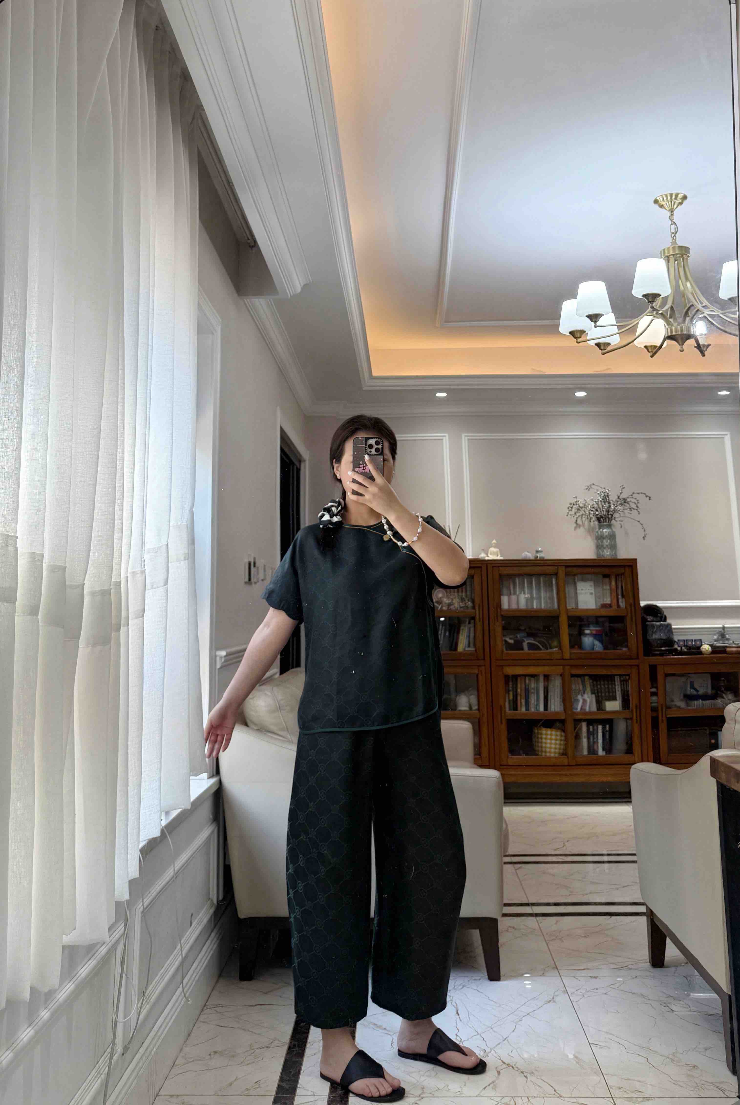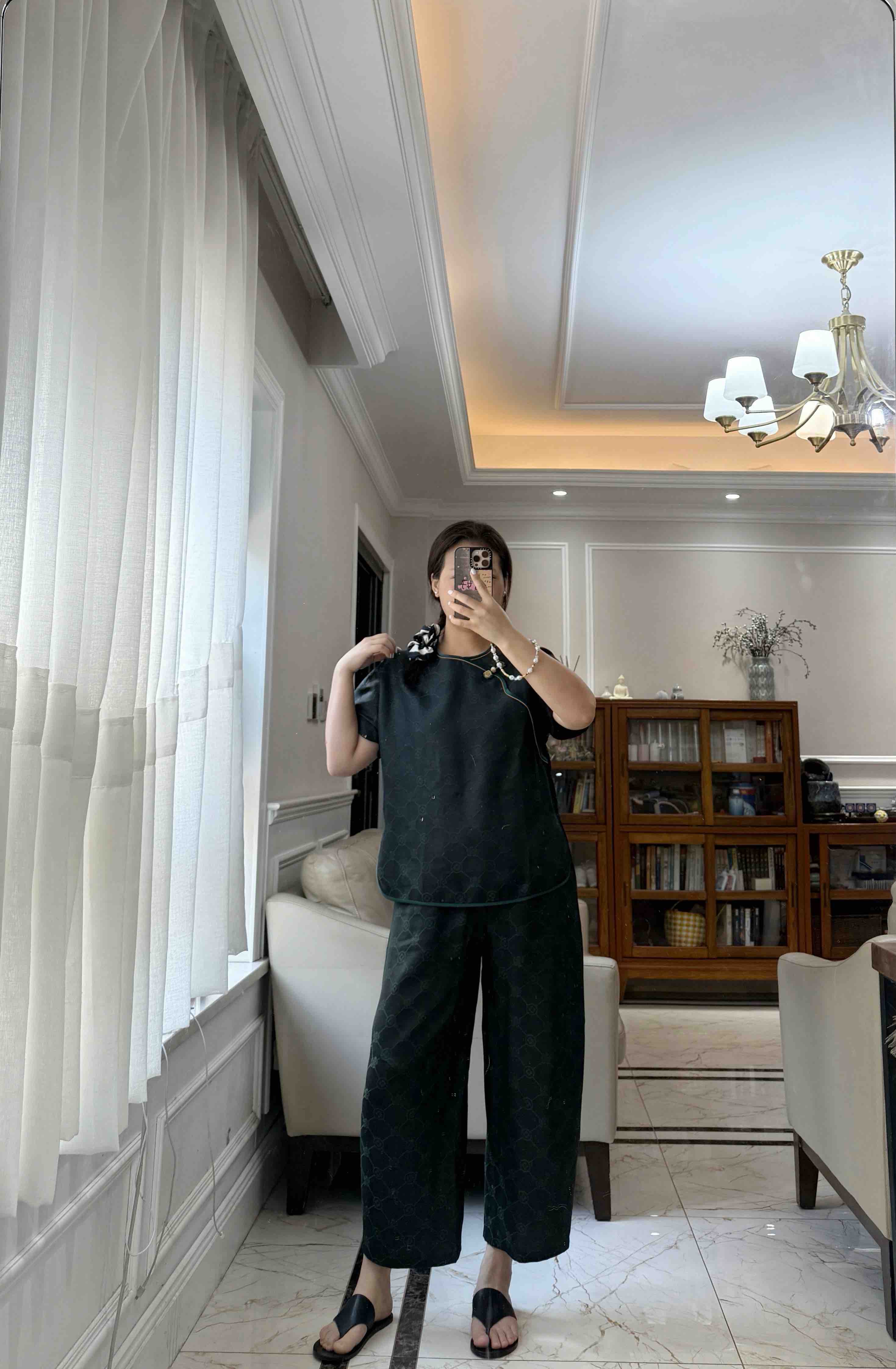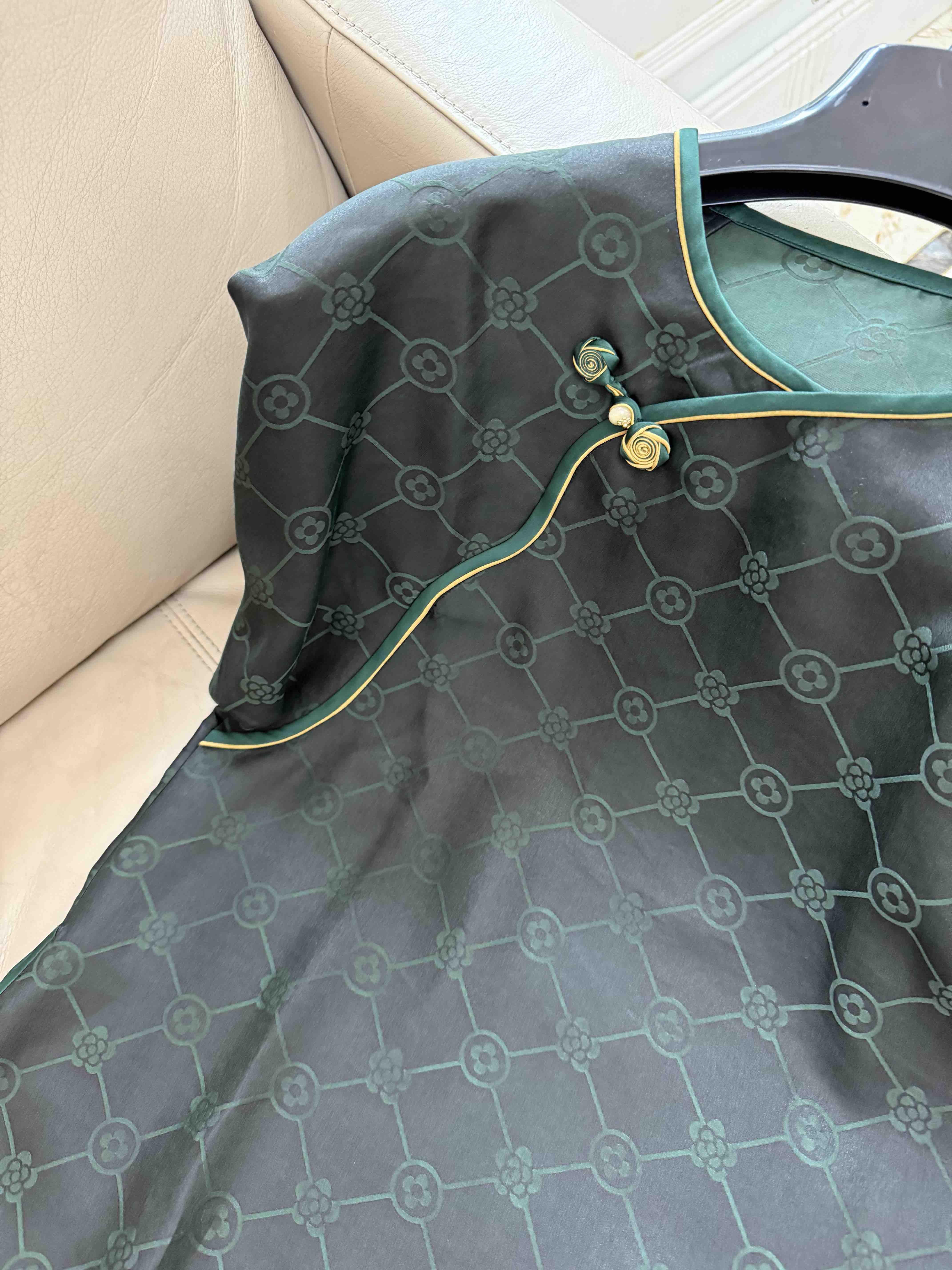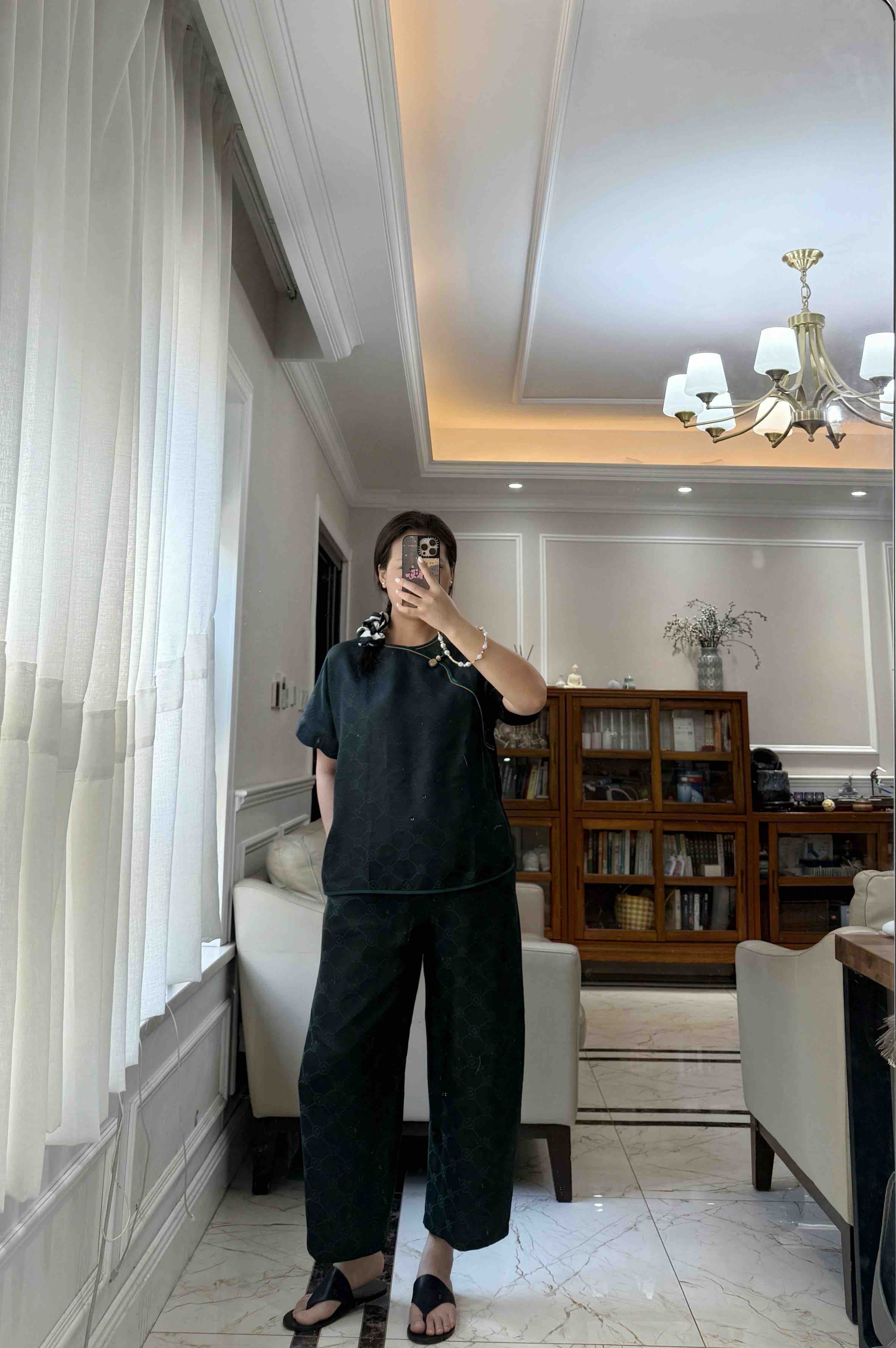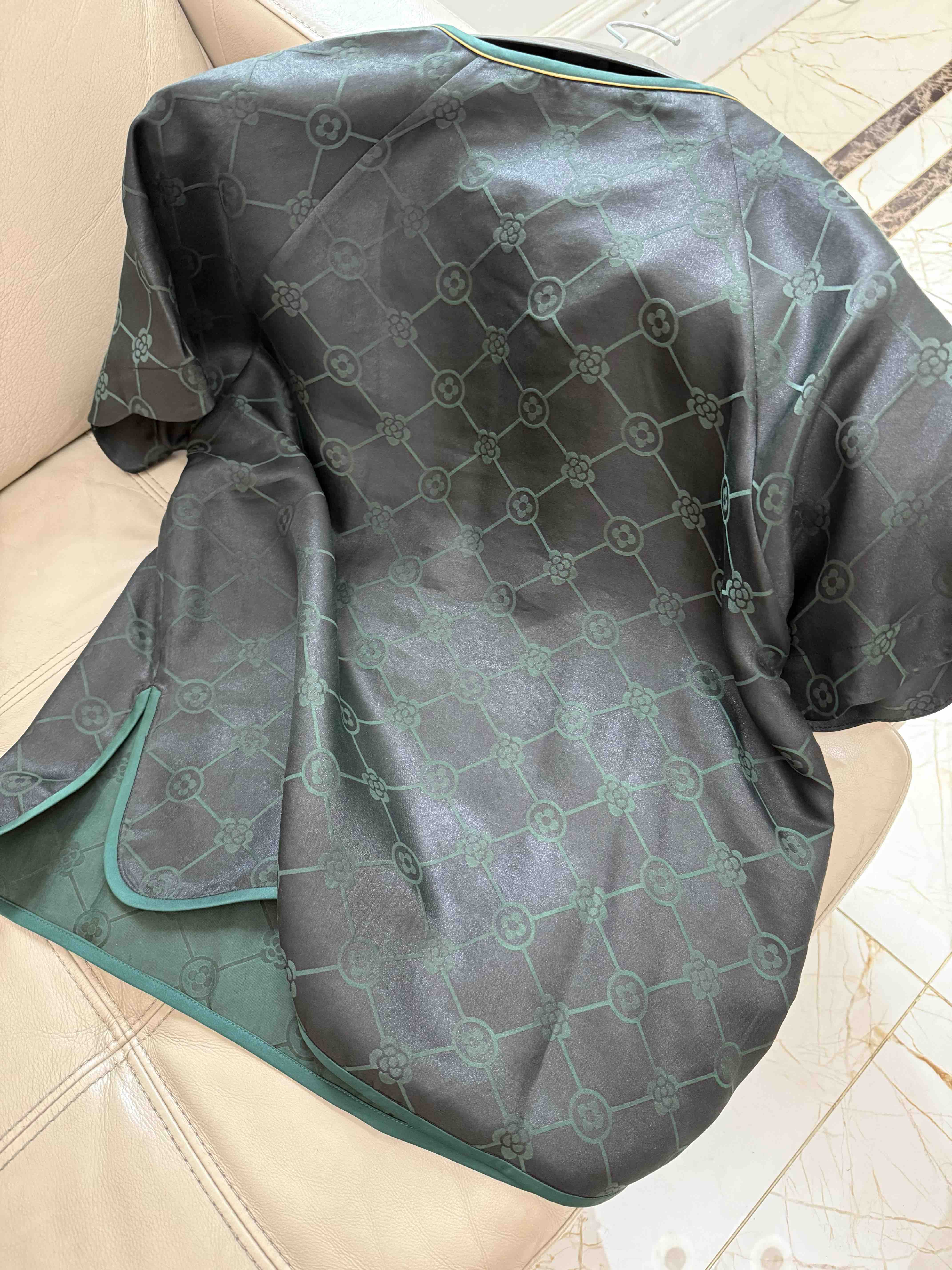 712-4 新中式 四时吉祥 香云纱提花 盘扣斜襟短袖上衣 松紧腰灯笼裤
