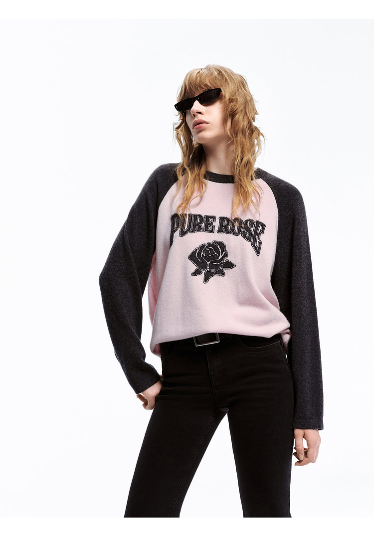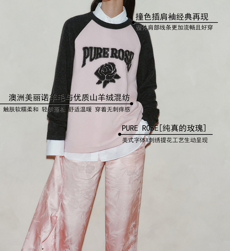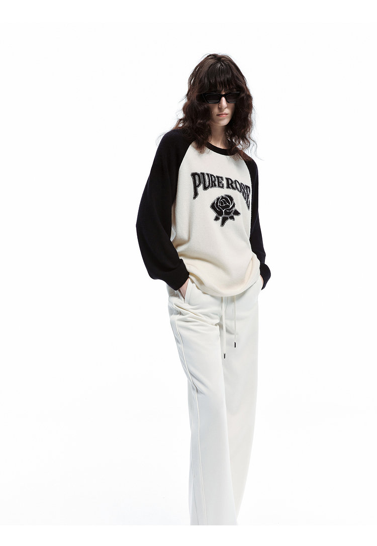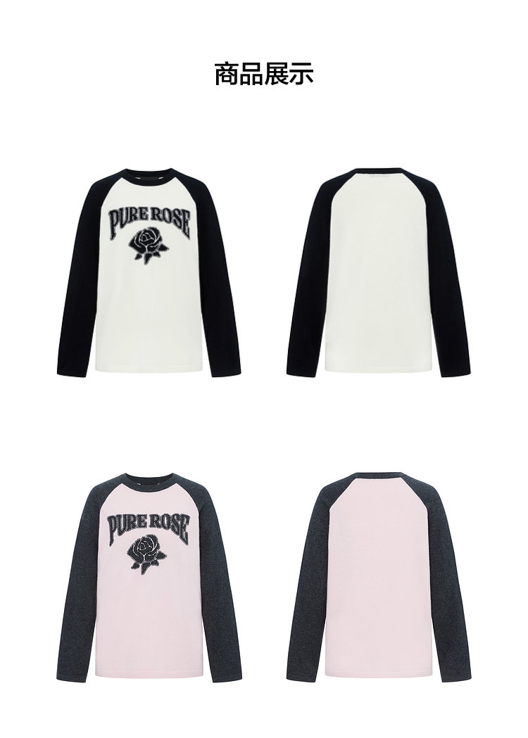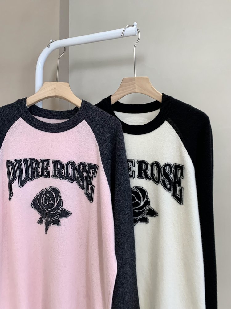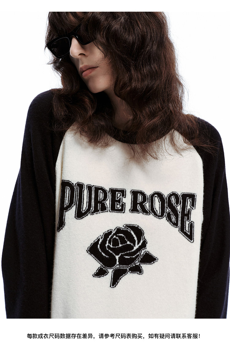 moco个性SLOGAN ”PURE ROSE[纯真的玫瑰]”美式街头毛衣,撞色插肩袖经典再现,复古又随性。