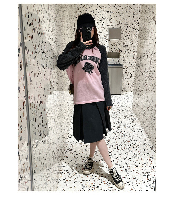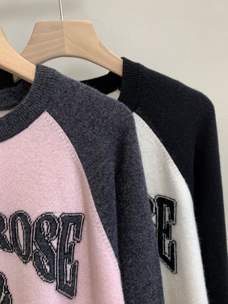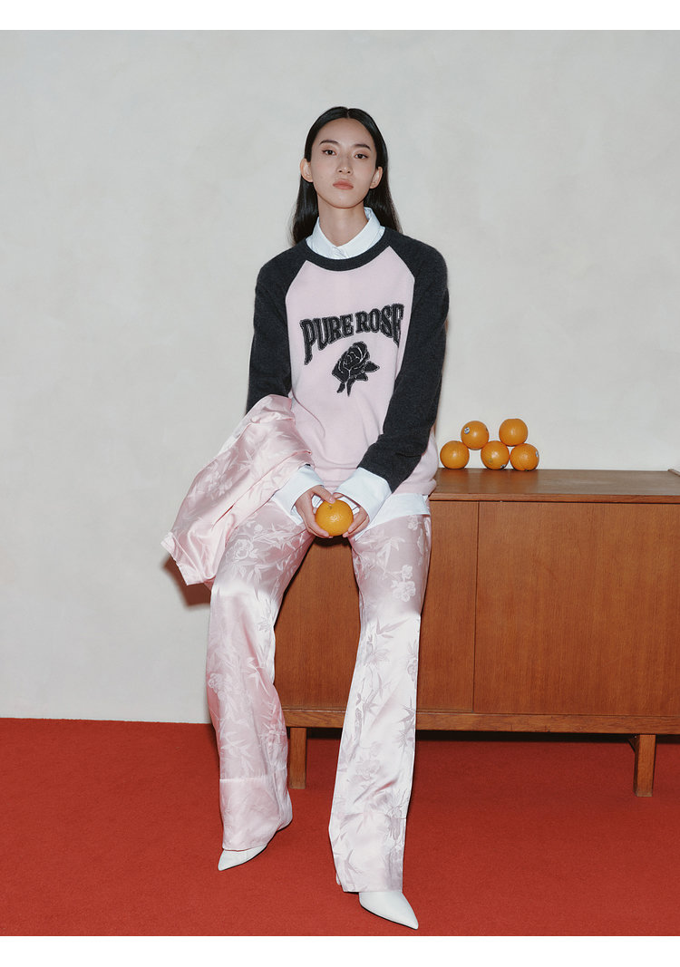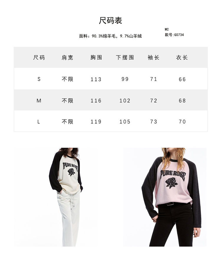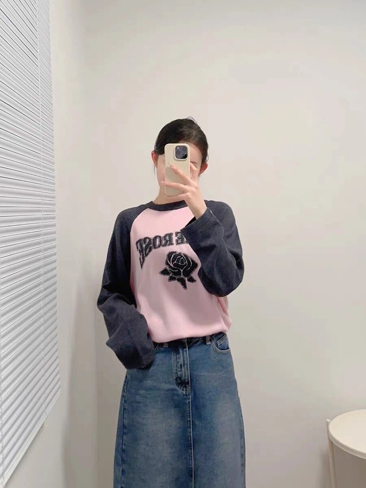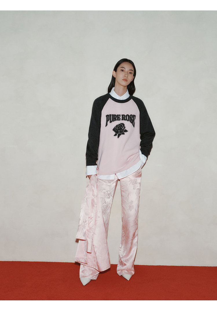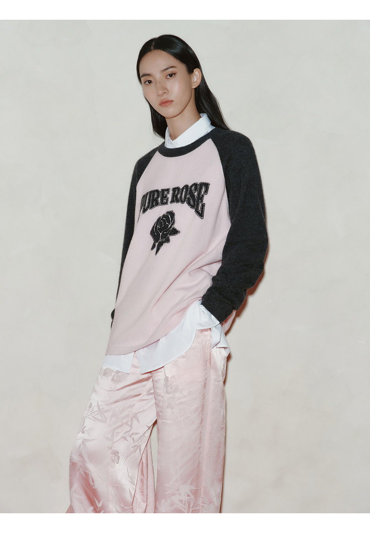 moco个性SLOGAN ”PURE ROSE[纯真的玫瑰]”美式街头毛衣,撞色插肩袖经典再现,复古又随性。