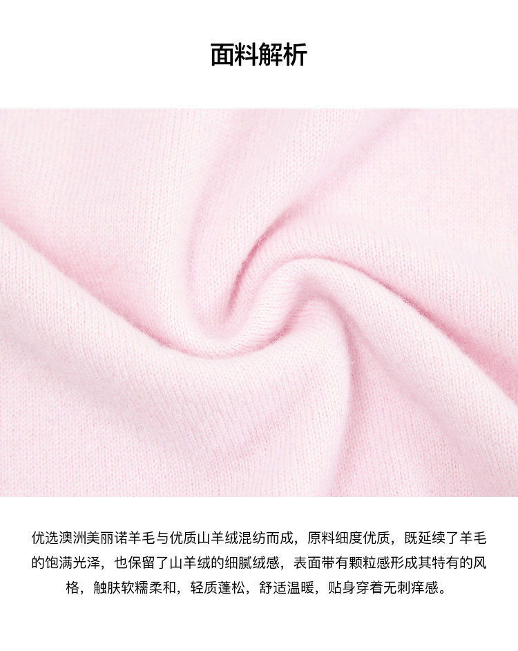 优选澳洲美丽诺羊毛与优质山羊绒混纺而成,原料细度优质,既延续了羊毛的饱满光泽,