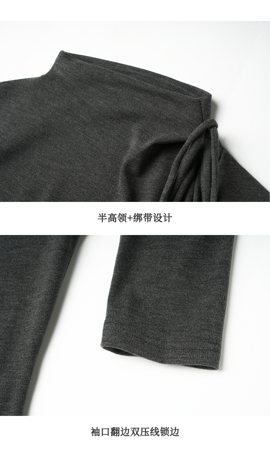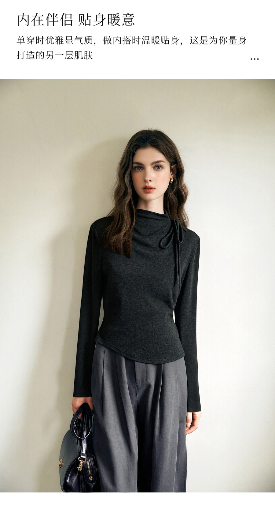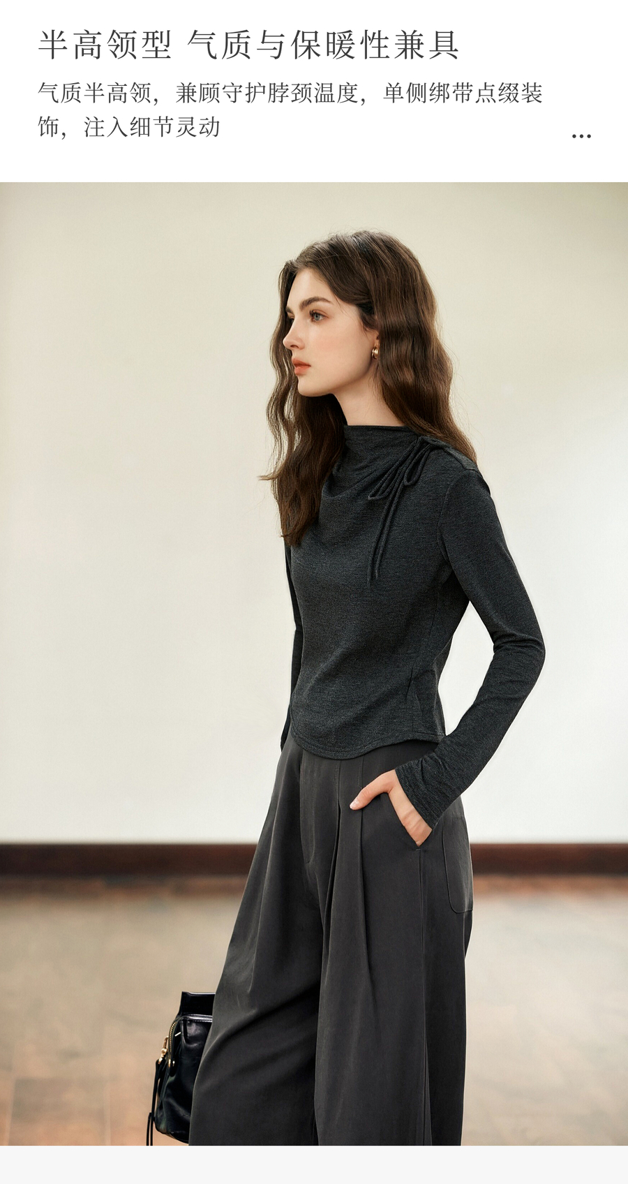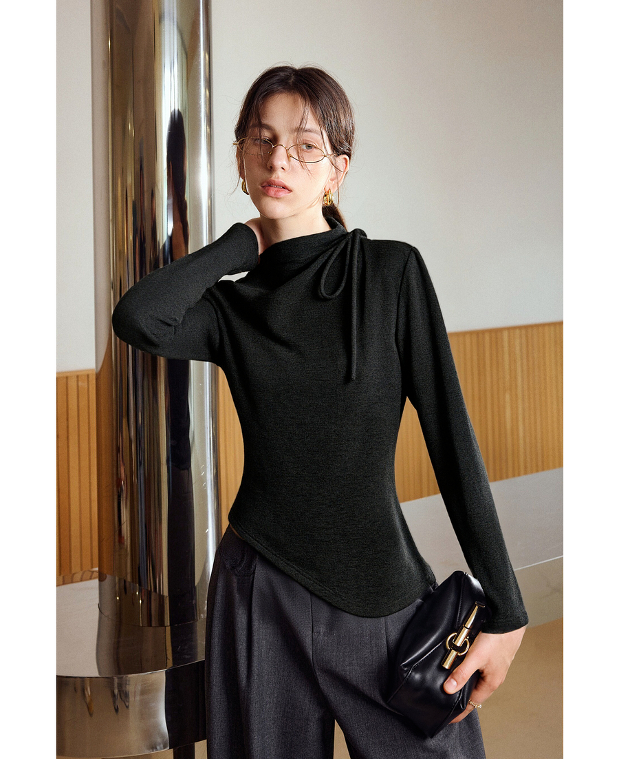 气质半高领绑带设计感保暖打底衫女冬季不规则下摆套头长袖T恤