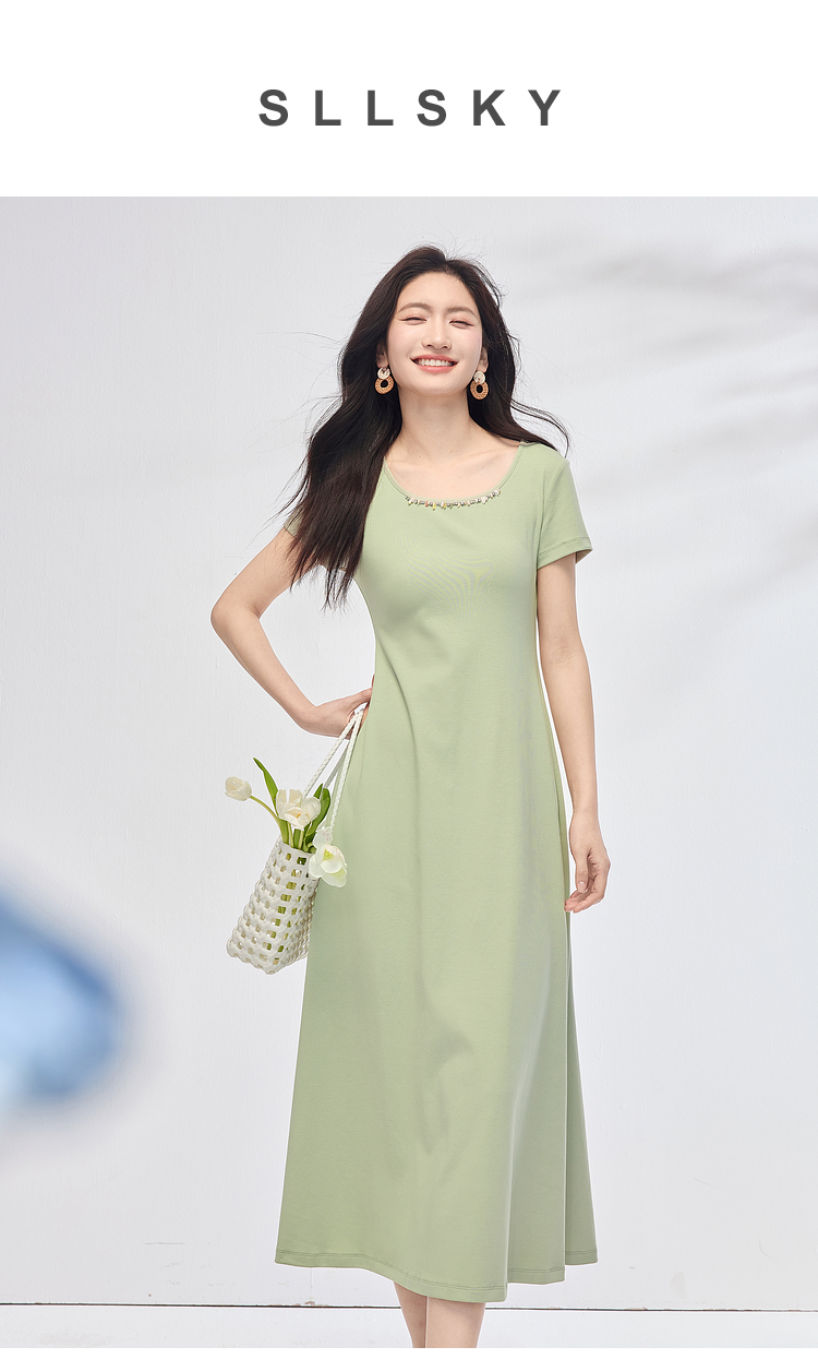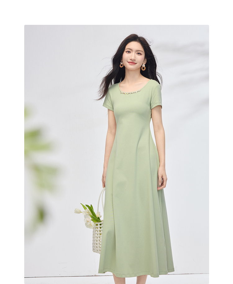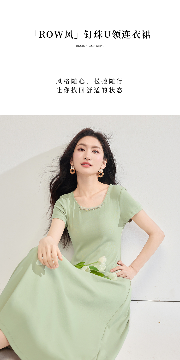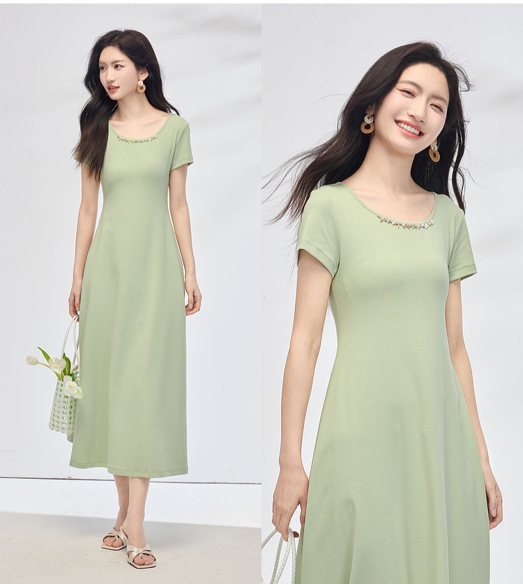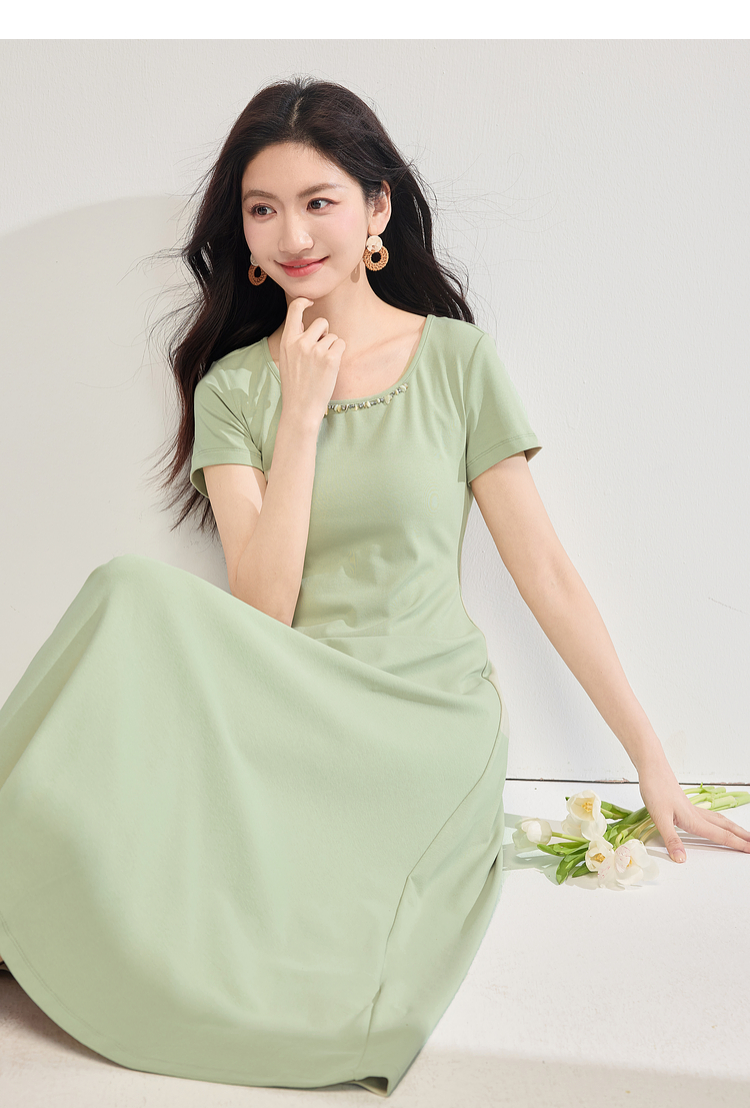 【专属特价】熙世界嫩绿色钉珠U领短袖连衣裙女高级感气质长裙子2025夏天新款