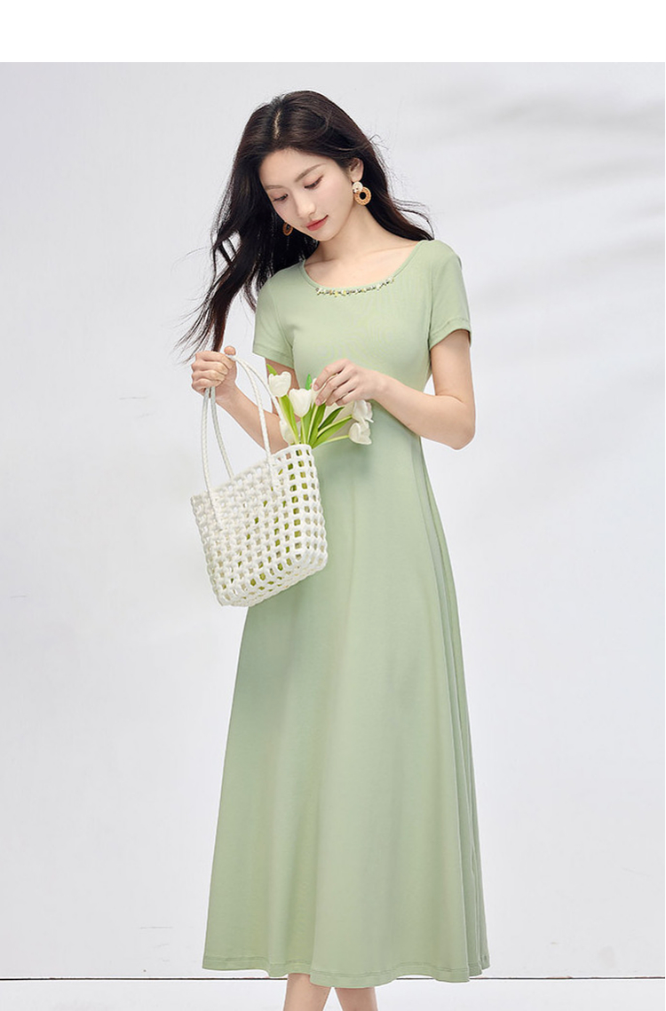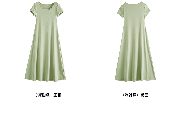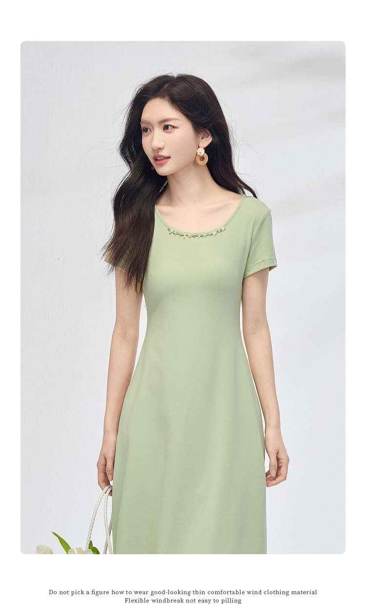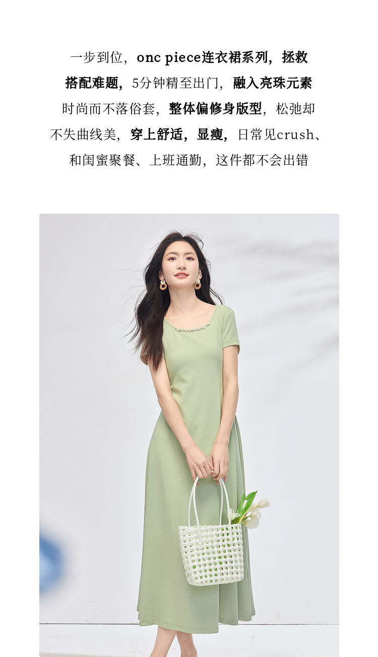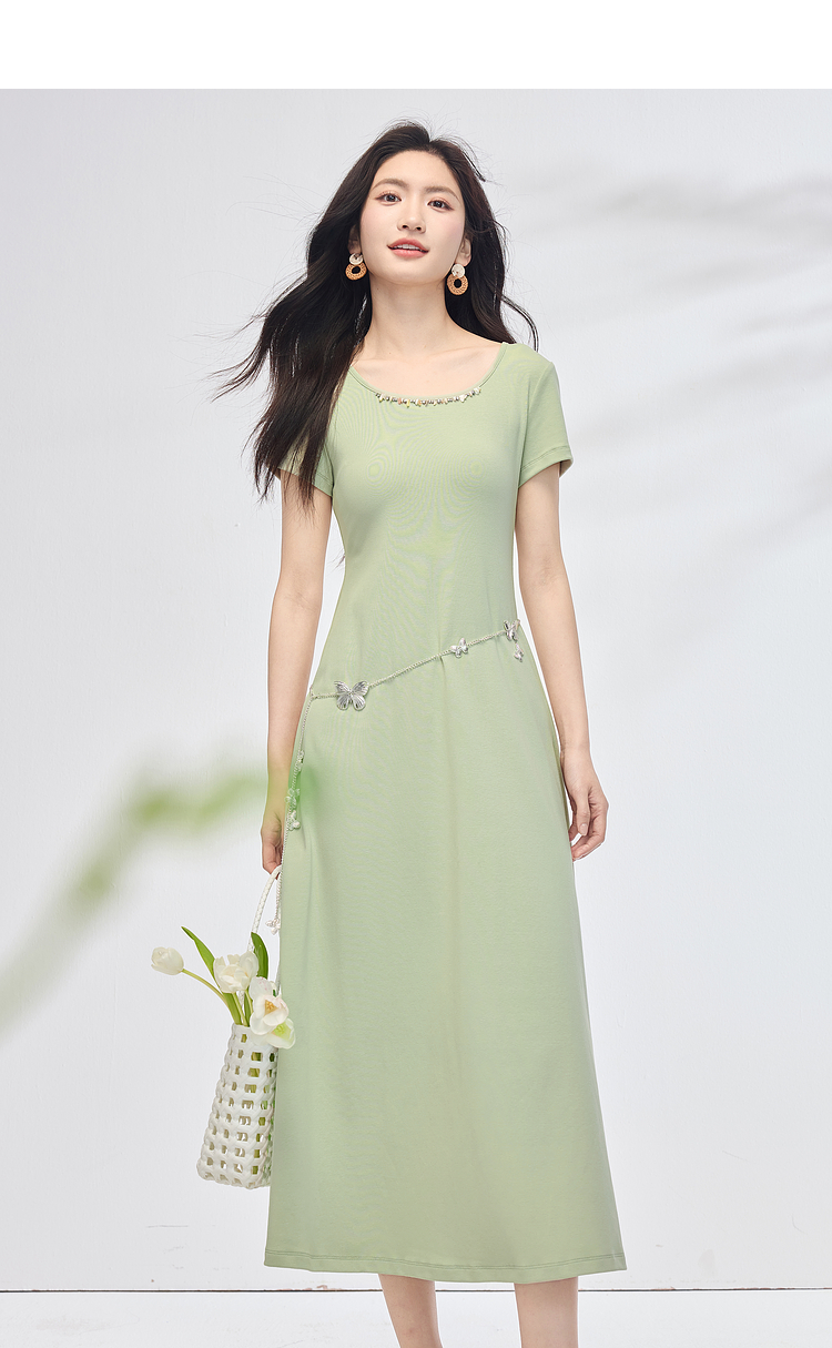 【专属特价】熙世界嫩绿色钉珠U领短袖连衣裙女高级感气质长裙子2025夏天新款