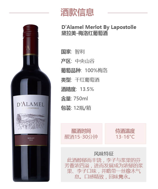 【整箱六瓶】黛拉美-梅洛红葡萄酒 D`ALAMEL MERLOT 750ml*6