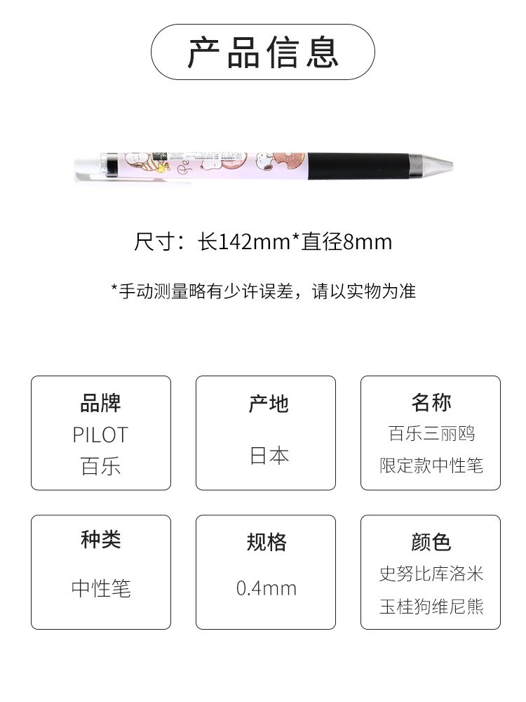 日本/PILOT百乐/JuiceUp/三丽鸥限定/黑杆/库洛米/史努比/维尼/奇奇蒂蒂/玉桂狗/按动水笔