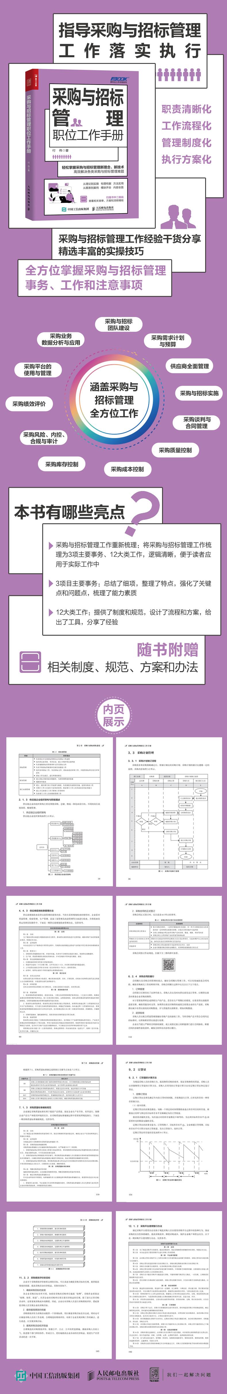 采购在企业经营管理中发挥着重要作用,做好采购工作可以帮助企业降本增效,获得更多的利润和更好的发展。本书从组织设计、业务运营和管理提升三个层面,对采购管理的各项工作如采购与招标工作,采购与招标团队建设,采购需求计划与预算,供应商全面管理,采购与招标实施,采购谈判与合同管理,采购质量控制,采购成本控制,采购库存控制,采购风险、内控、合规与审计,采购绩效评价,采购平台的使用与管理,采购业务数据分析与应用等进行了详细介绍。本书兼具时效性、操作性与工具性,在提供相应的采购管理理论知识的同时,还提供了大量的模板与示例,为采购管理工作者提供了一套可以落地的整体化解决方案,有利于从业者提升业务水平和管理水平。本书适合招标采购从业人员、企业中高层管理人员以及相关领域的人士阅读和使用。