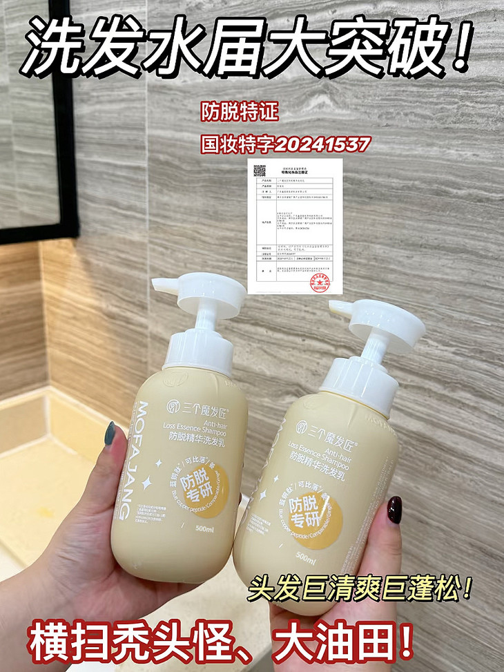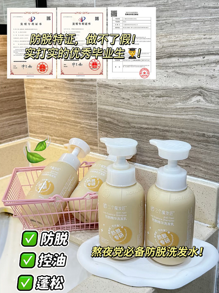打击脱发!除了我们自身生活习惯要调整外,洗发水的选择也是重中之重 【三个魔发匠】防脱洗发水 它真的把 “防脱+控油+去屑”做的很好! 还是持证上岗的防脱狠角色(国妆特字20241537) 防脱界当之无愧的 “实力型选手”