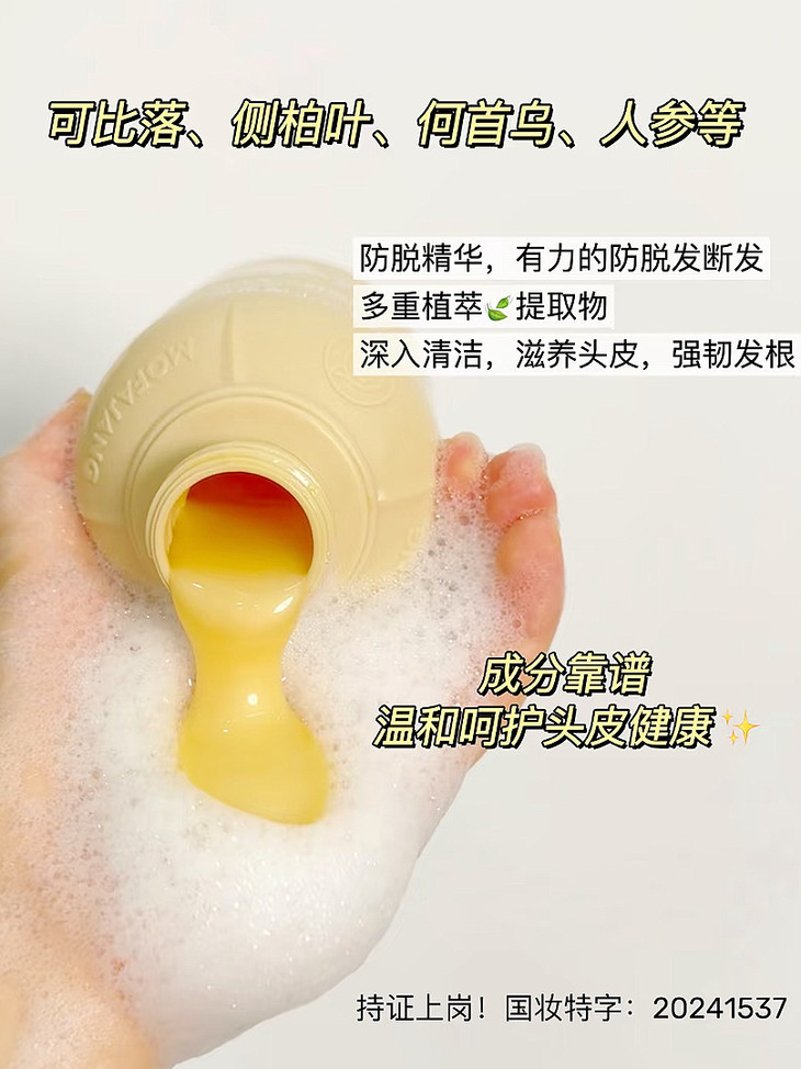 📜 双重防脱 buff 叠满 🔹 人参当归提取物:强韧发根,从根源稳住发量 🔹 侧柏叶提取物:控制水油平衡,三天不洗头依旧清爽蓬松! 🌿 五重草本植萃治愈头皮 侧柏叶强力控油+人参根深层滋养+当归养润护发+无患子温和清洁+龙胆舒缓头皮 洗完像给头皮做了场森林SPA🌲 适合:适合易脱发、掉发的人群