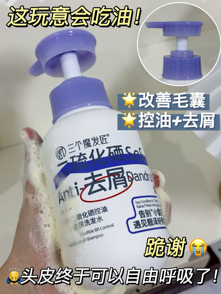 如果你觉得自己头皮总是痒痒的,头皮上还能摸到小疙瘩,头屑比较严重、能扣出头皮块的话 那是你头皮上的马拉色菌🦠在作怪 有这种情况的强烈建议你用三个魔发匠二硫化硒控油去屑洗发水,强效去屑护毛囊 一瓶就能解决头痒、头油、头屑问题,对毛囊炎也有改善作用