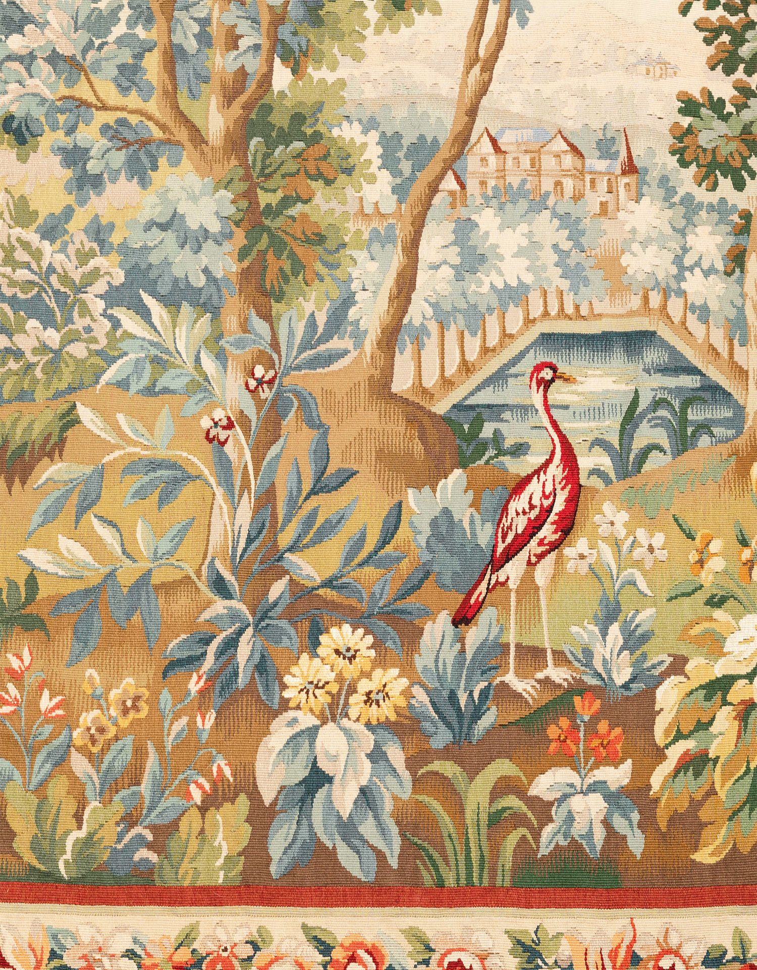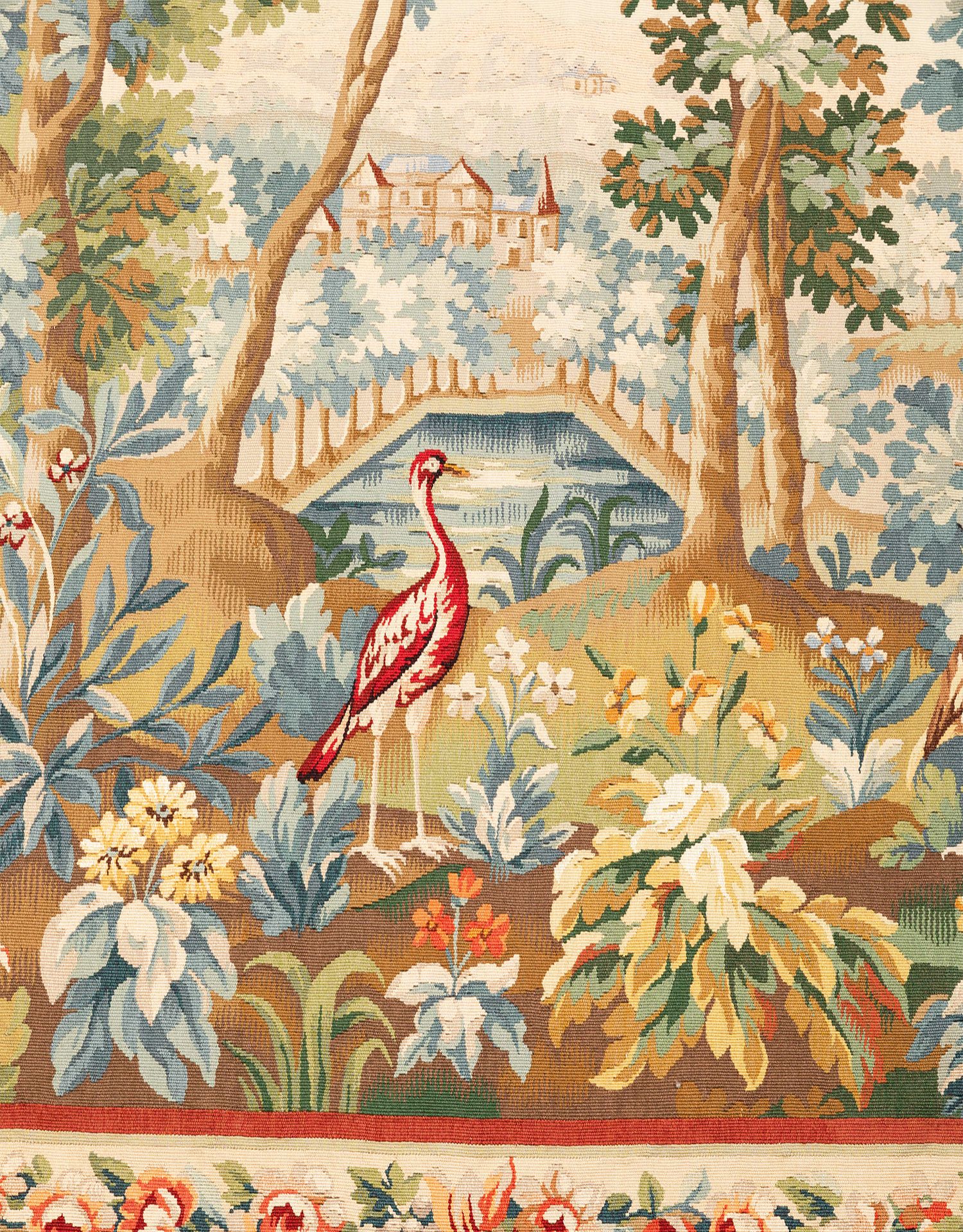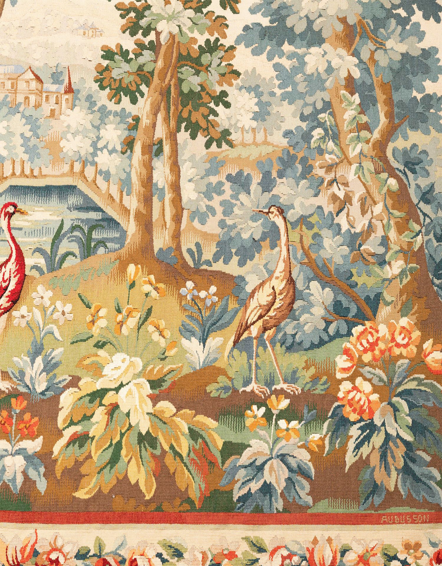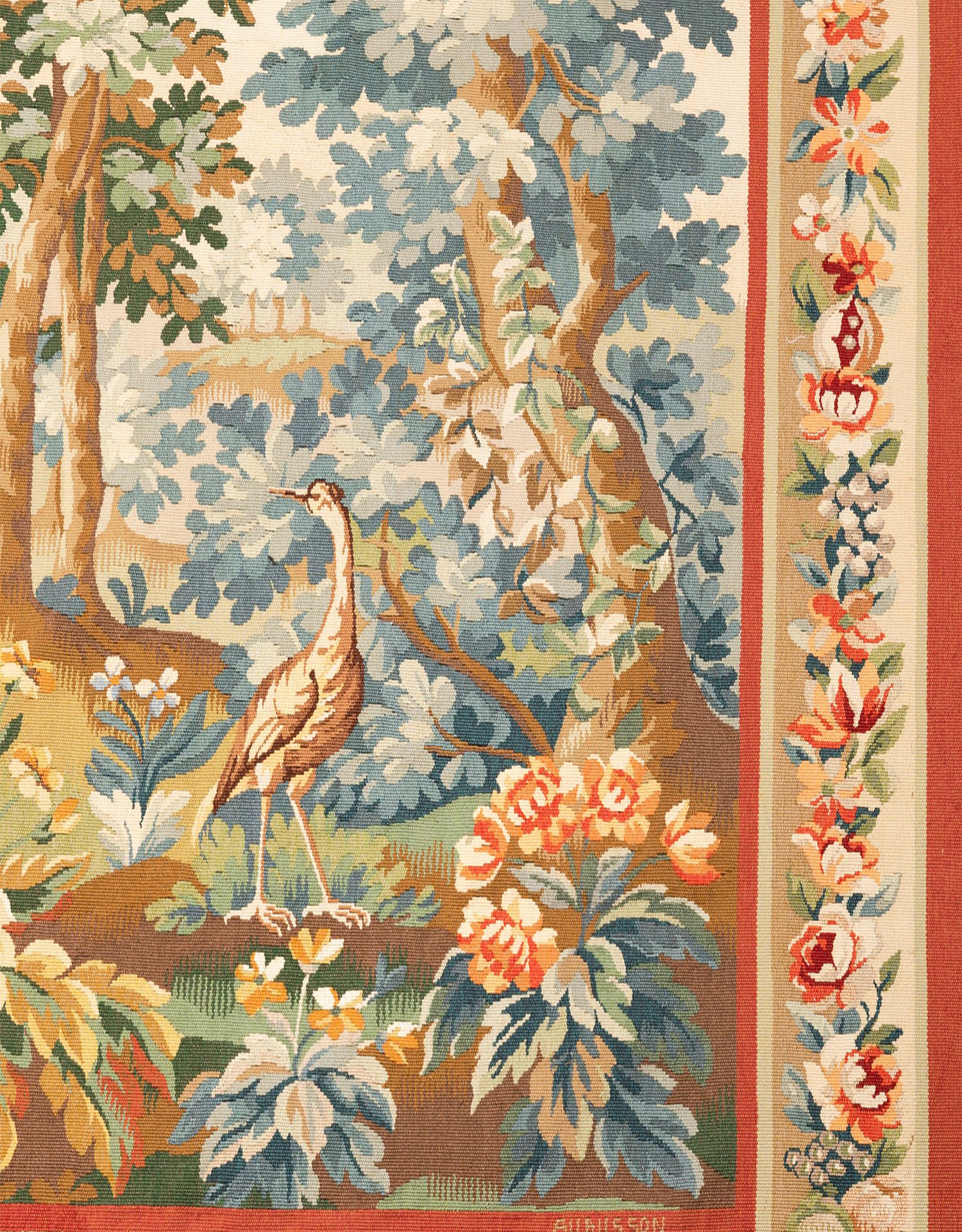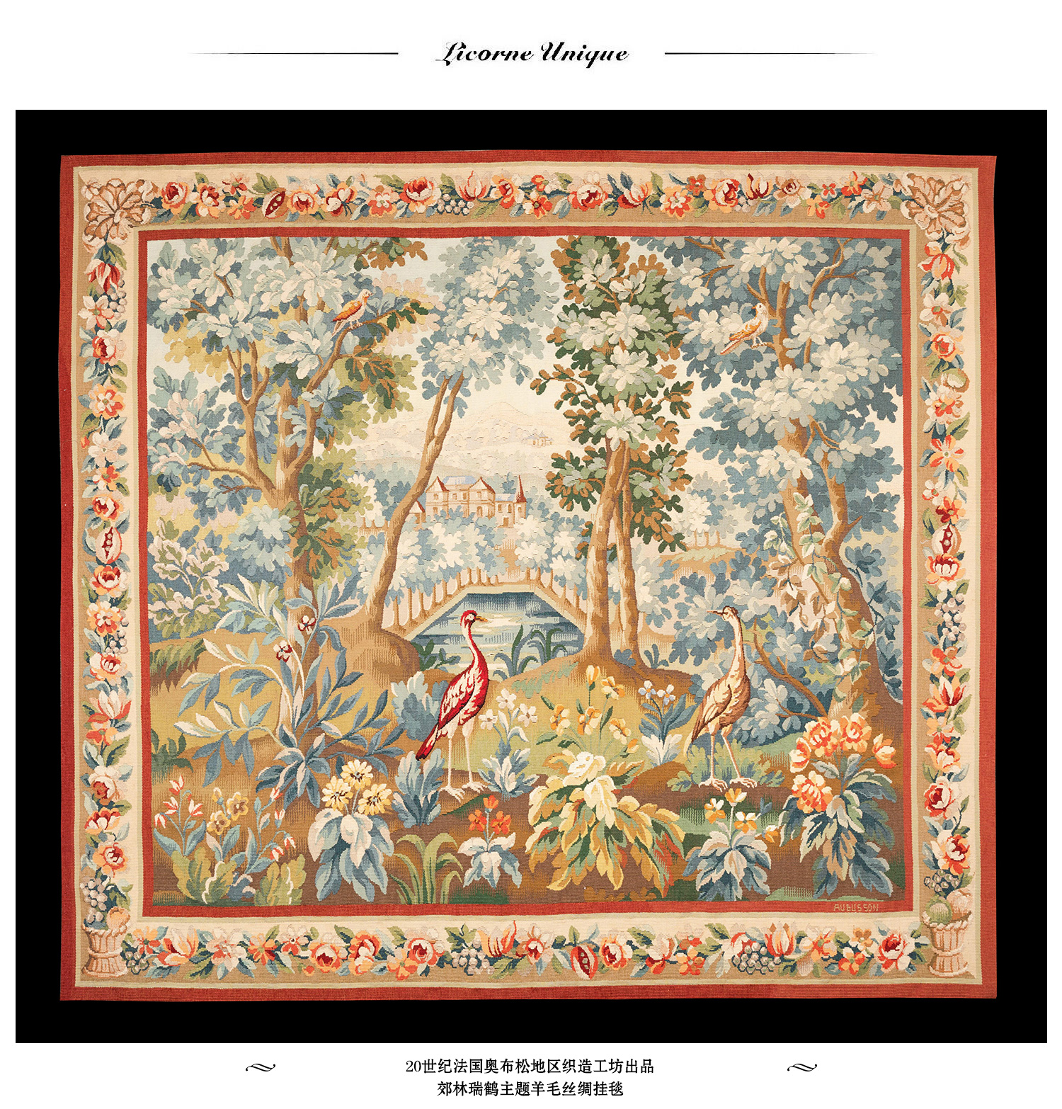 独角鹿西洋古董20世纪法国Aubusson郊林瑞鹤主题羊毛丝绸挂毯