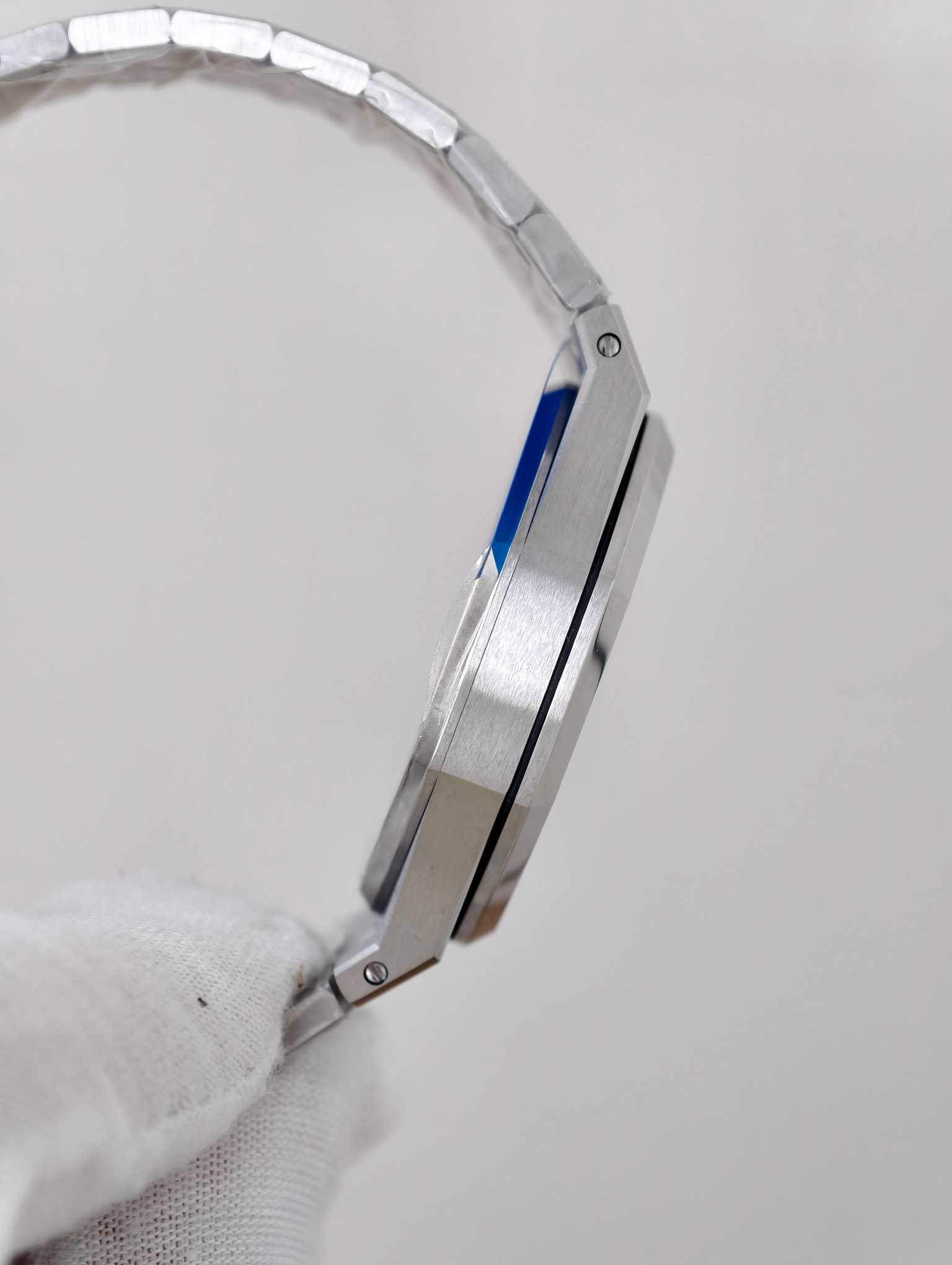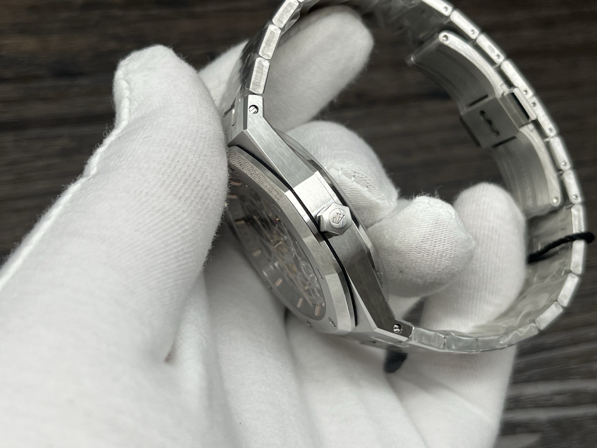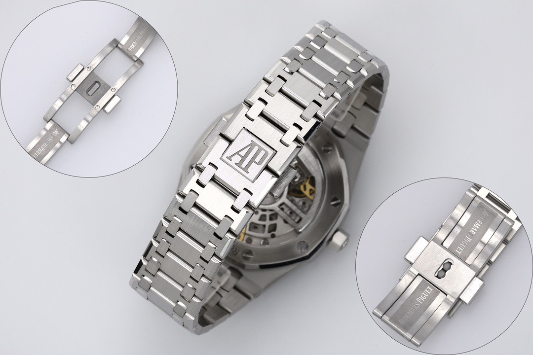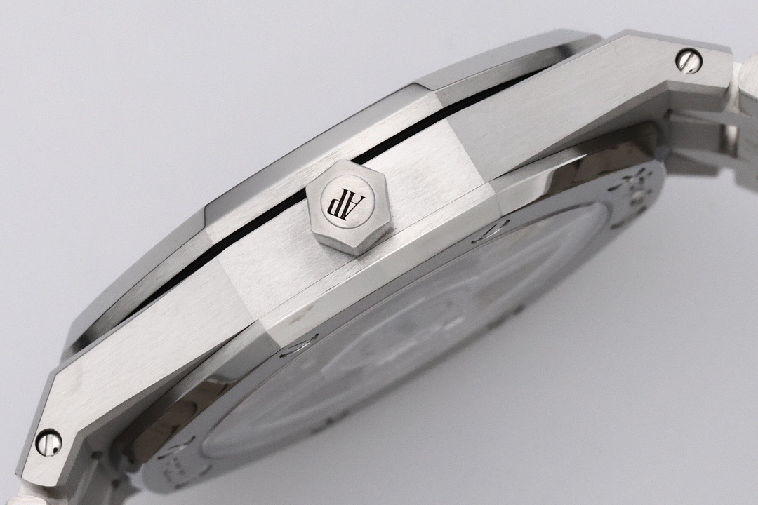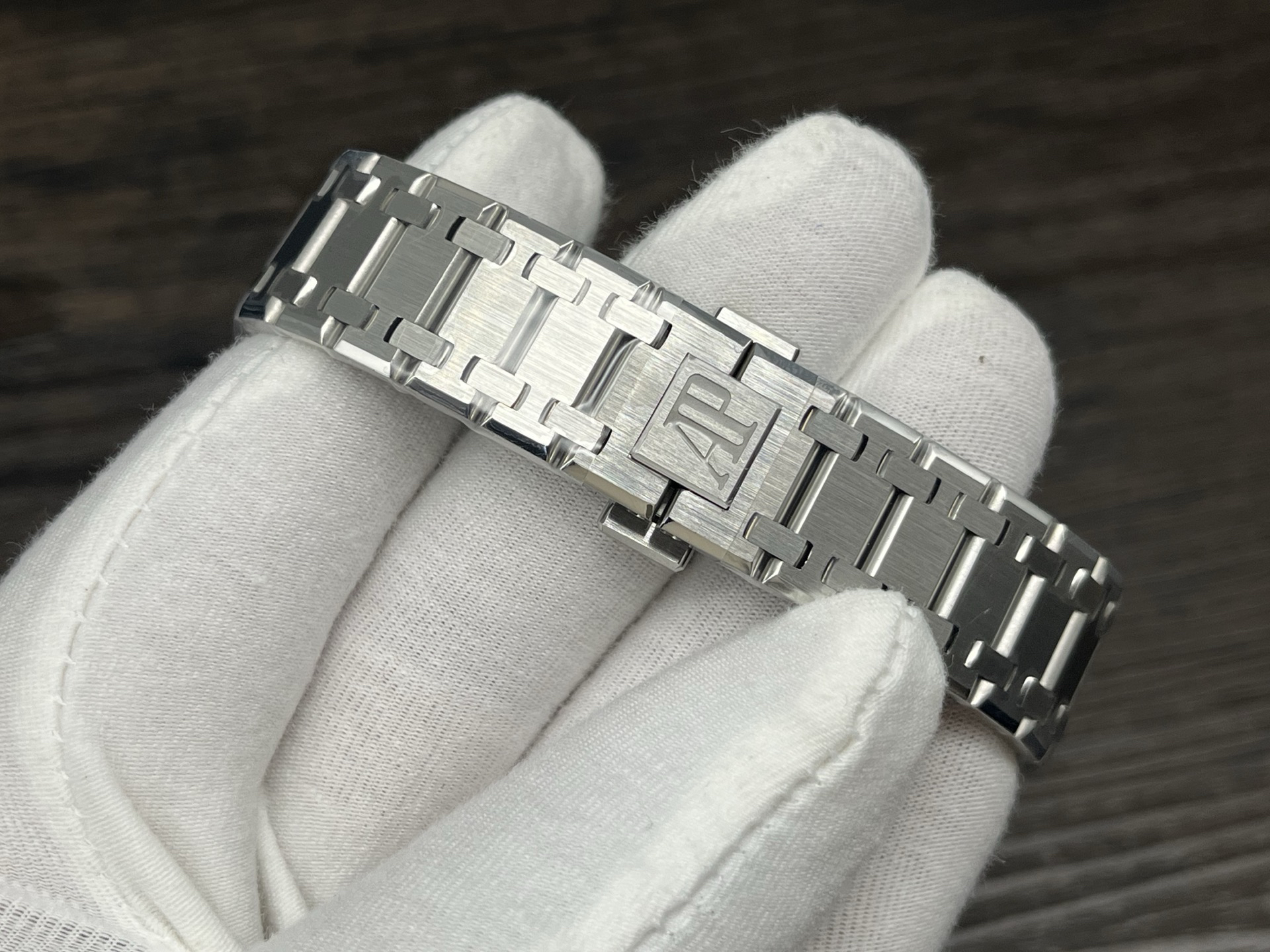 The highly recognizable octagonal 39MM case adopts advanced CNC machining technology to preliminarily cut and shape the stainless steel raw materials, and then uses exquisite wire drawing technology and forging surface polishing treatment to perfectly interweave on the case, presenting a unique luster and texture. The watch strap links are also produced through multiple complex polishing processes, making the surface of the links delicate, tightly connected, and flexible. Ensure comfort and fit when wearing. The AP logo on the watch buckle is finely carved, with clear lines and a three-dimensional steel structure. On the side of the case, the lugs naturally connect with the strap, creating a smooth transition and showcasing a harmonious beauty that is seamlessly integrated!